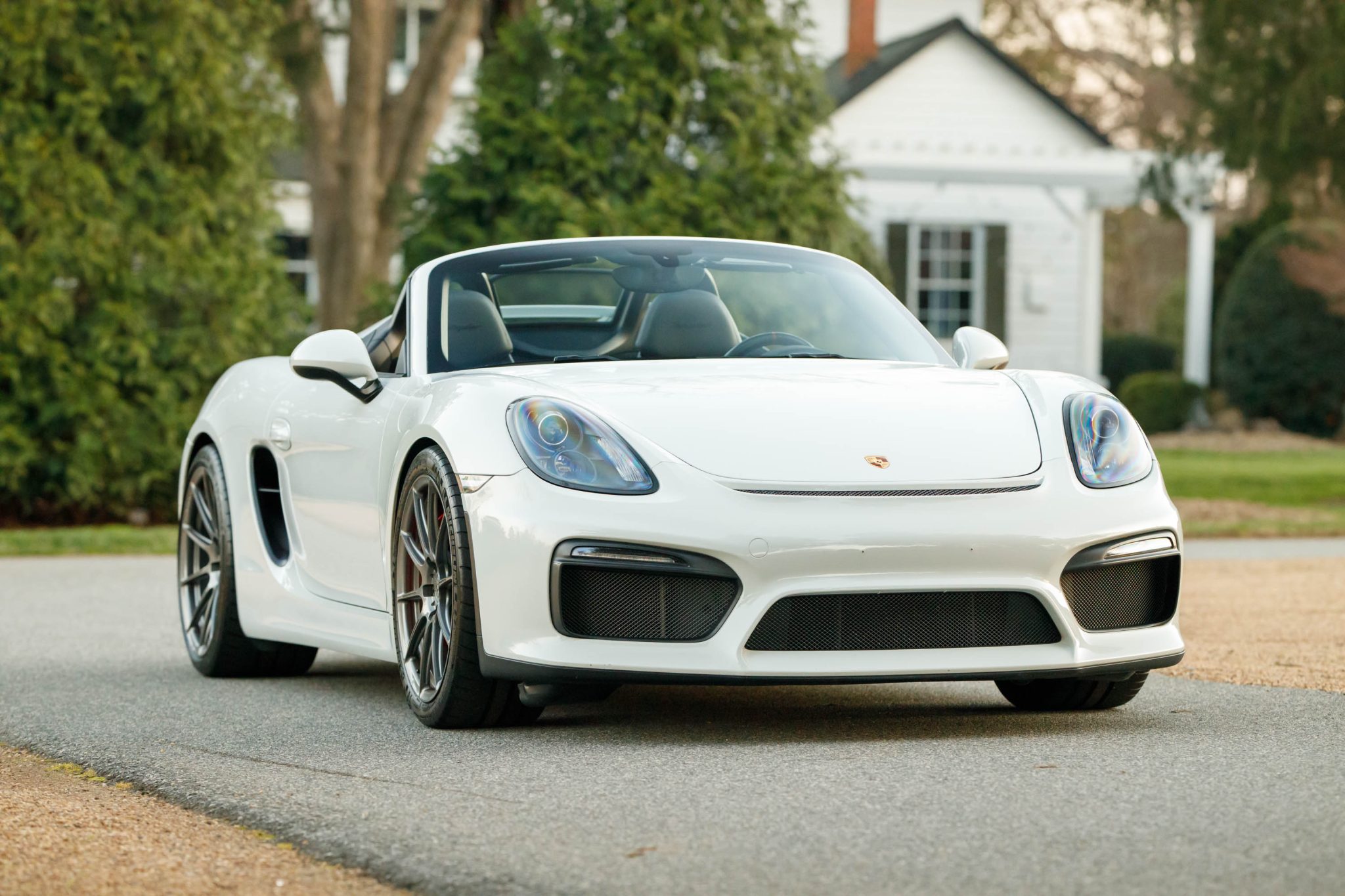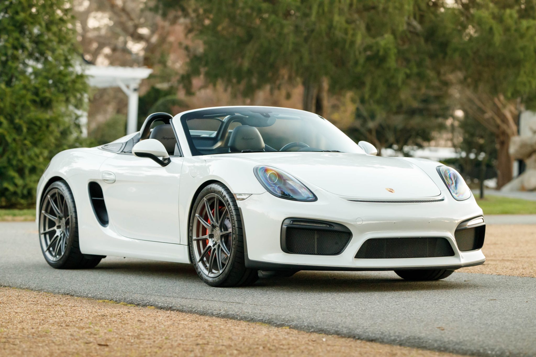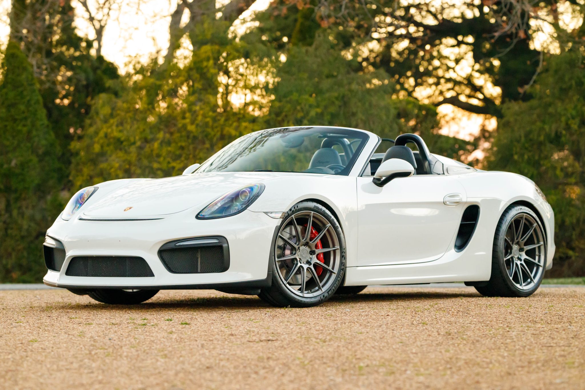 Aftermarket RYFT 20″ forged wheels are mounted with 265/35 front and 295/30 rear Michelin Pilot Sport Cup 2 tires. Stopping power is provided by red Porsche-branded calipers over 380mm front and 340mm rear Girodisc slotted rotors. Boxster Spyders were equipped from the factory with an electromechanical steering rack shared with the contemporary 911 Turbo in addition to a sport suspension 20mm lower than that of the standard Boxster.