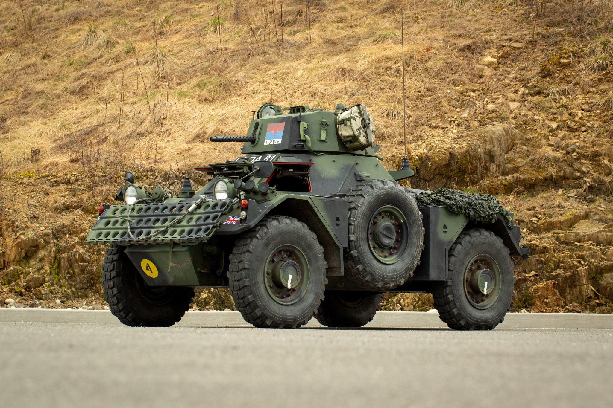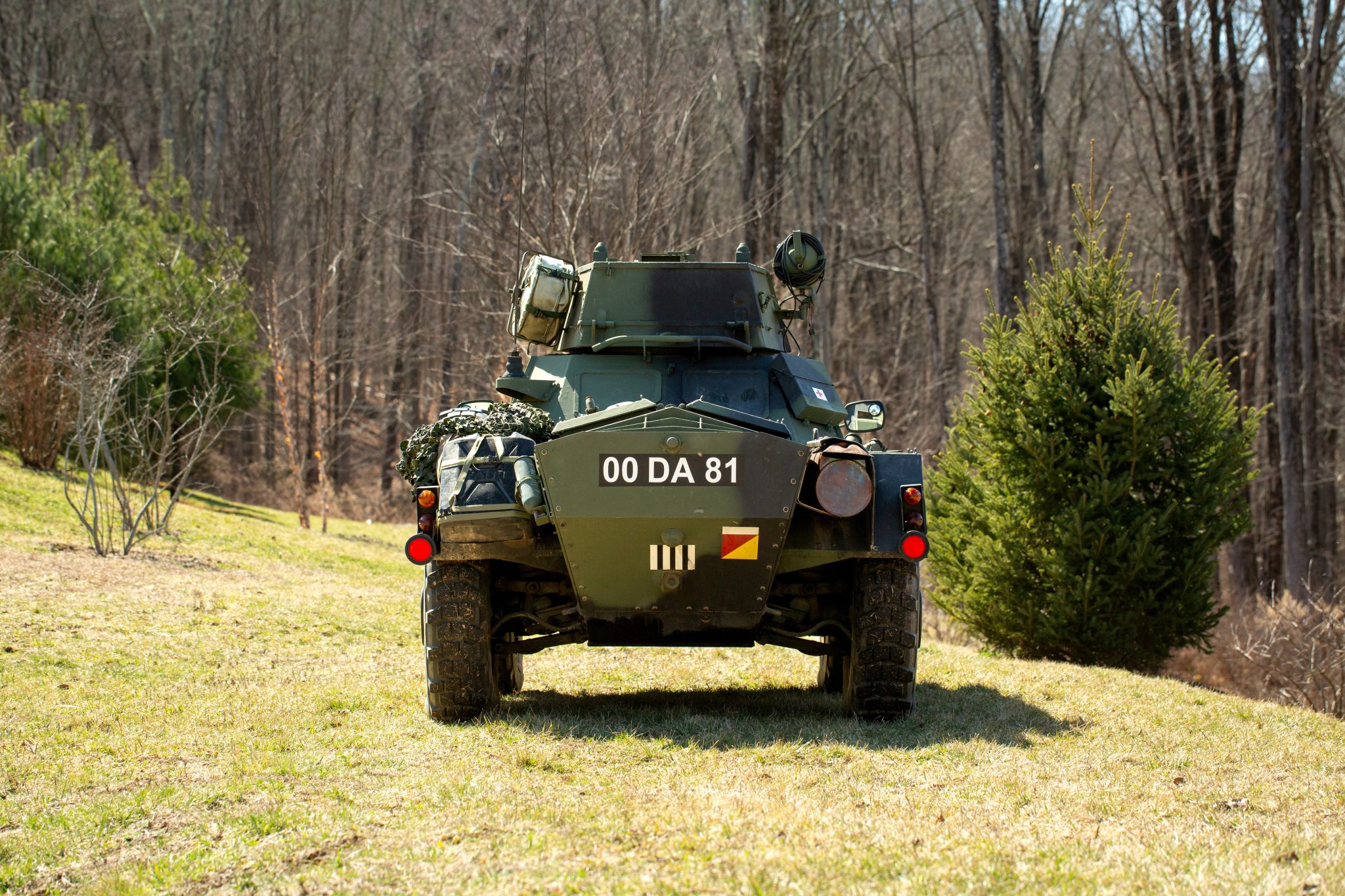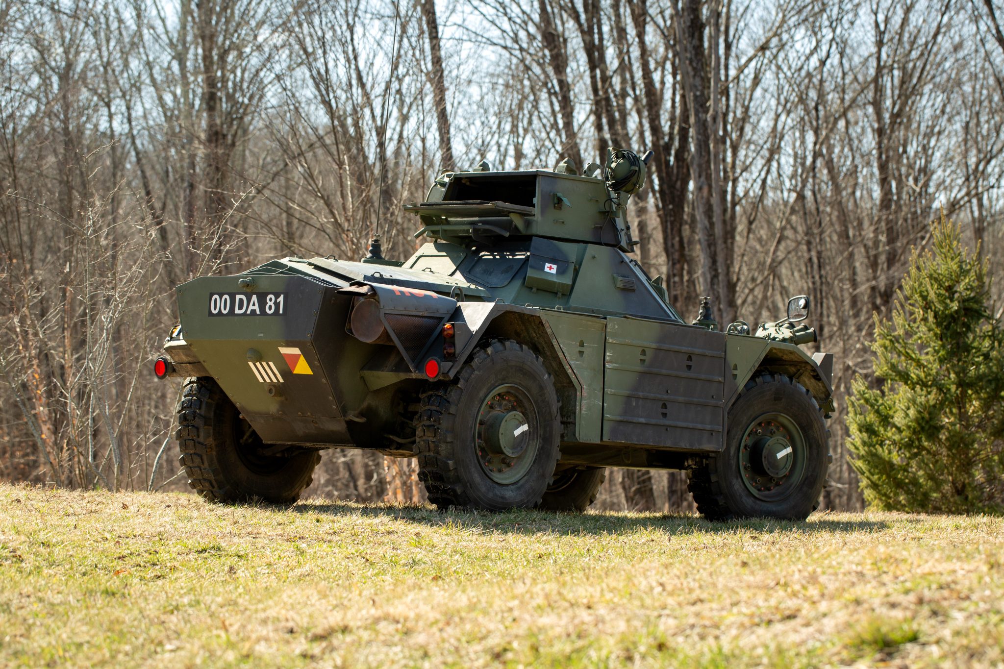 Steel eight-lug wheels wear 9.00×16″ Michelin X tires, and a matching spare is mounted to the left side. The vehicle uses independent suspension with coil springs and hydraulic dampers all around.