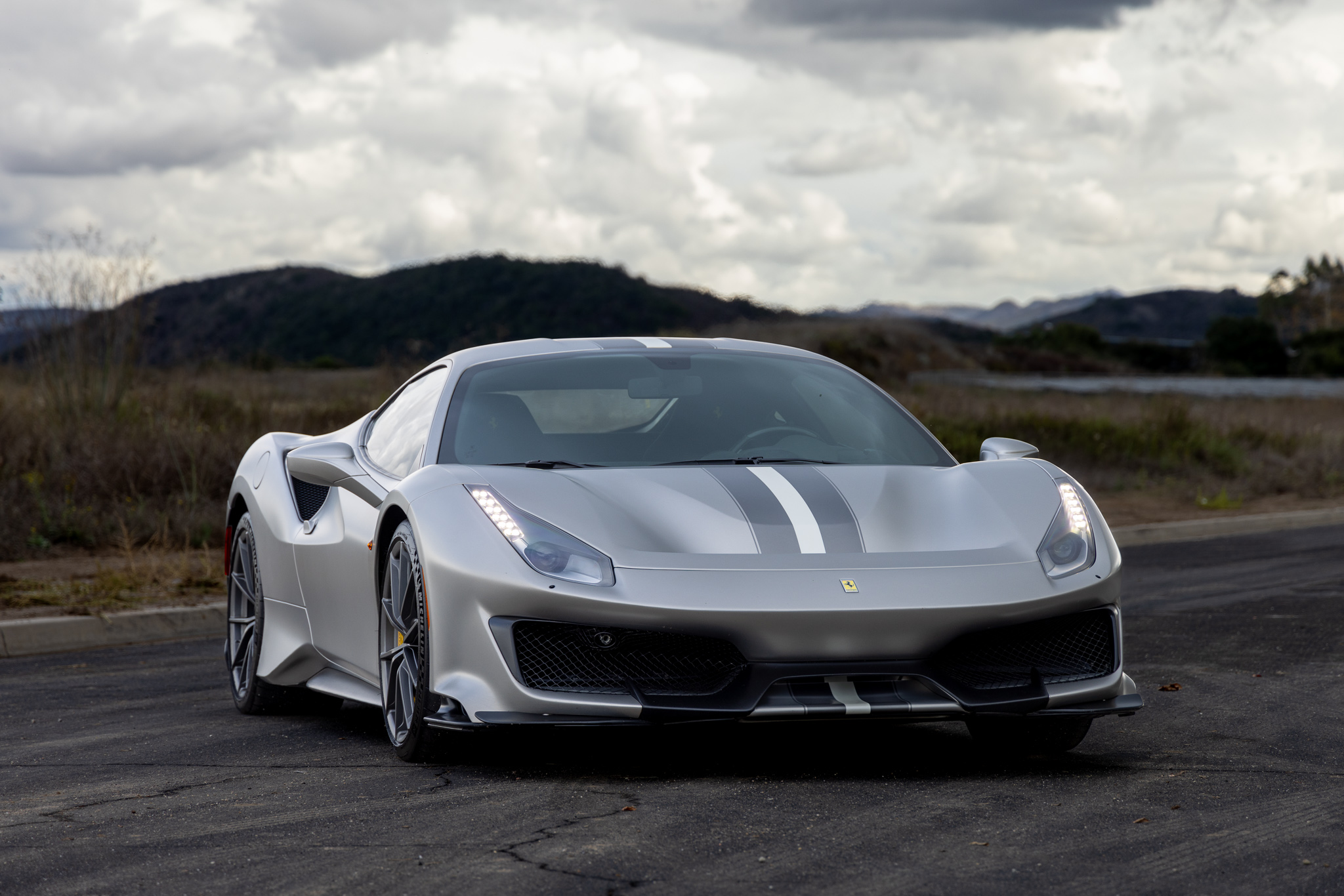 The 20″ 10-spoke alloy wheels are mounted with Michelin Pilot Sport Cup 2 R tires measuring 245/35 up front and 305/30 out back. The right-rear wheel has blemishes. The car is equipped with an SCM-E magnetorheological suspension control system as well as a front-axle lift system. Braking is provided by yellow-finished multi-piston calipers over ceramic-composite discs at each corner.