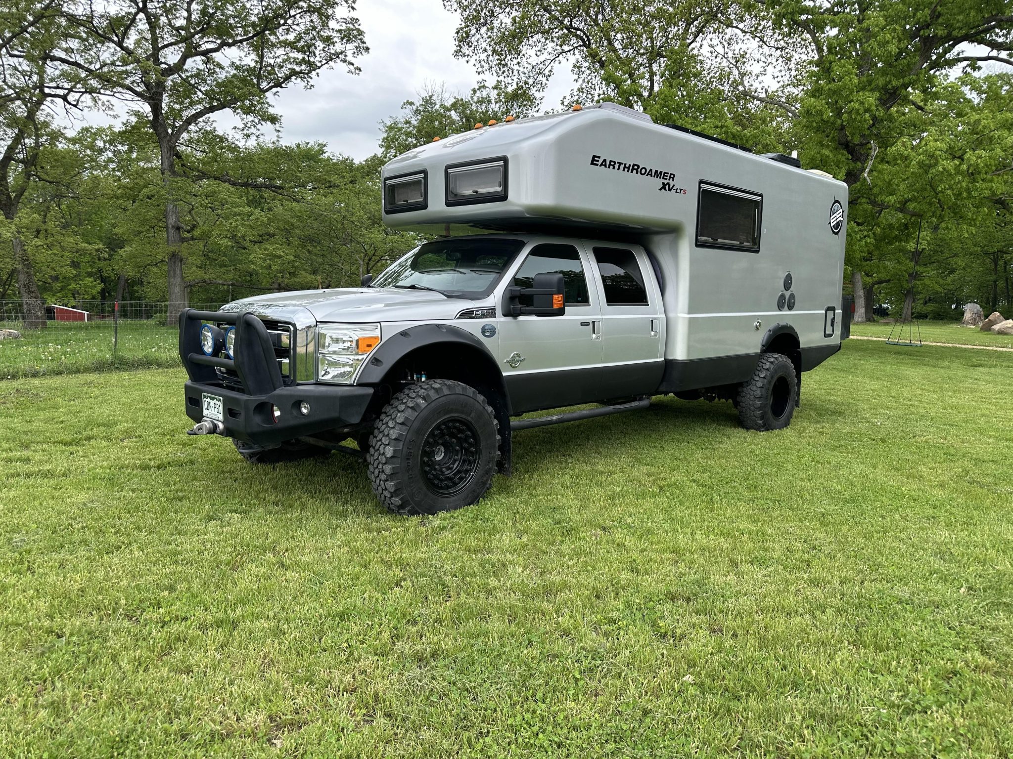 Black-finished Hutchinson 20″ beadlock wheels are mounted with 335/80 Continental MPT 81 tires that were installed in 2021, and a spare is secured to the rear panel. The truck is equipped with manually locking front hubs, a Kelderman air suspension system, and an onboard air compressor with four remote outlets. Service in 2021 included replacing the right-rear wheel assembly and repairing the left-rear air-suspension fittings, while the right-front wheel was repaired in 2023 and the air suspension control module was replaced at that time.
