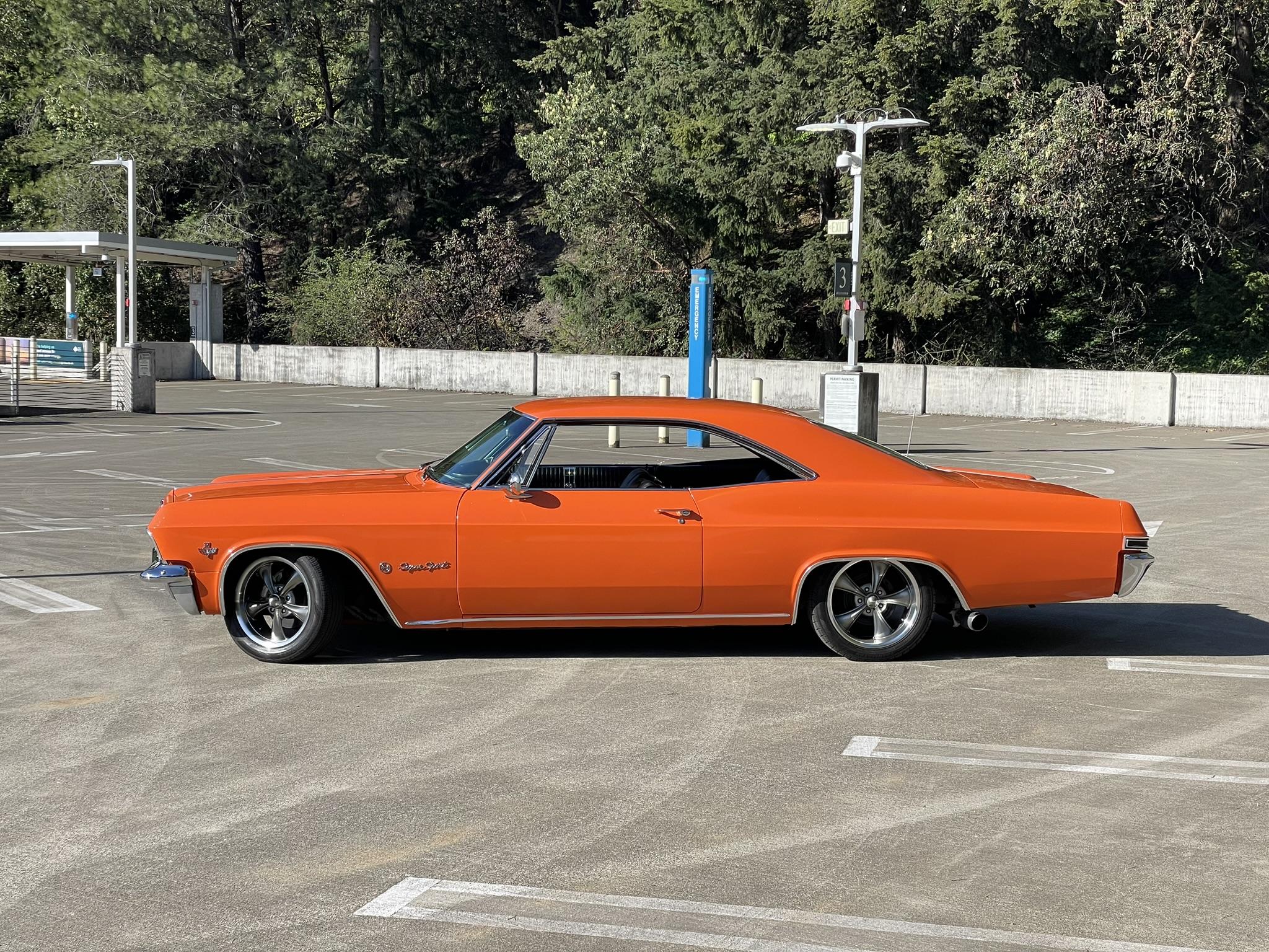 The 17″ front and 18″ rear Ridler 695 wheels are mounted with 215/55 Waterfall tires 245/45 Travelstar rubber, respectively. The car features power steering and rides on a lowered suspension with coil spring boosters up front. Braking is handled by power-assisted front discs and rear drums. The seller notes that the front tires are worn along the inside edges.