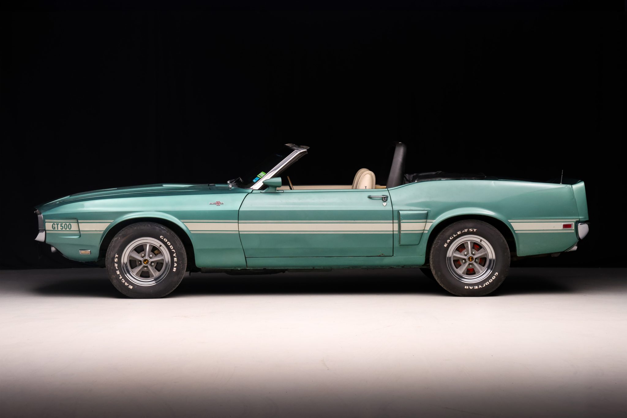 Five-spoke 15″ wheels with polished lips wear black Shelby center caps, and they are mounted with Goodyear Eagle ST tires. A space-saver spare is stowed in the trunk. The car is equipped with power steering, and stopping power is provided by power-assisted front discs and rear drums.