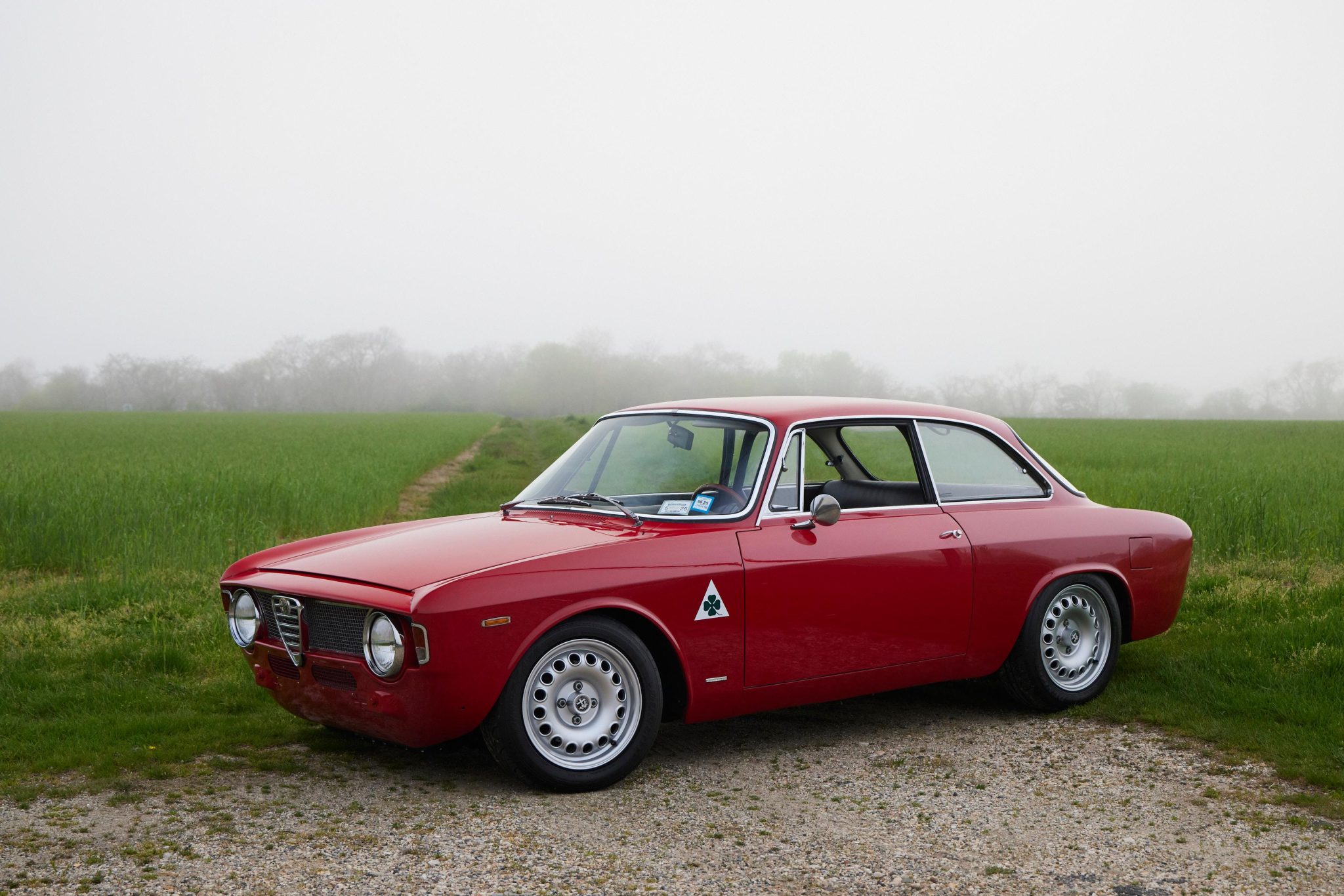 15″ Alfaholics GTA-style wheels are mounted with 195/55 Dunlop Direzza tires. The car is equipped with four-wheel disc brakes and has been fitted with front lowering springs, lightweight front spring pans, an upgraded front sway bar, cut rear springs, rear shock turret extenders, lightweight rear trailing arms, and heavy-duty trailing arm bushings.