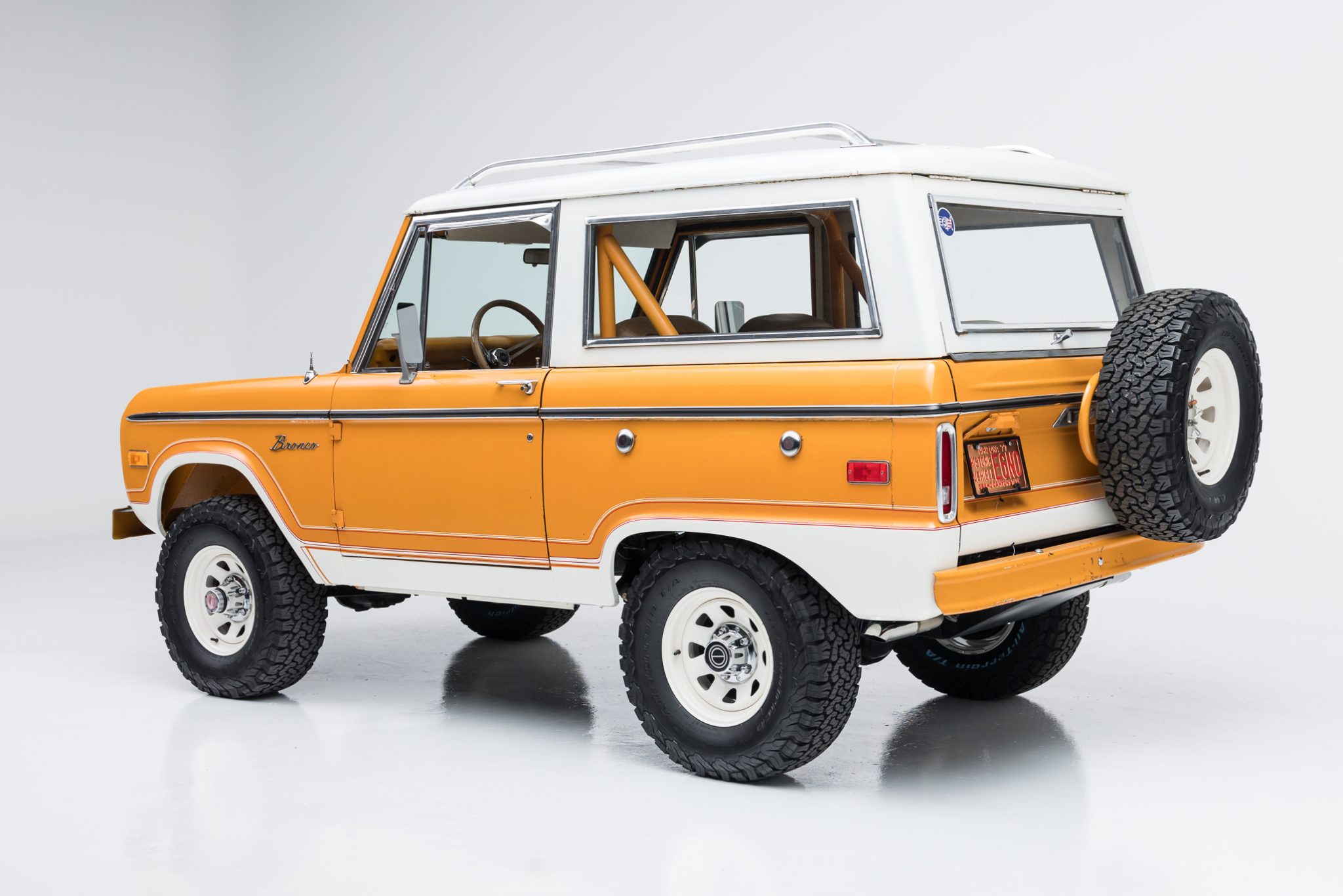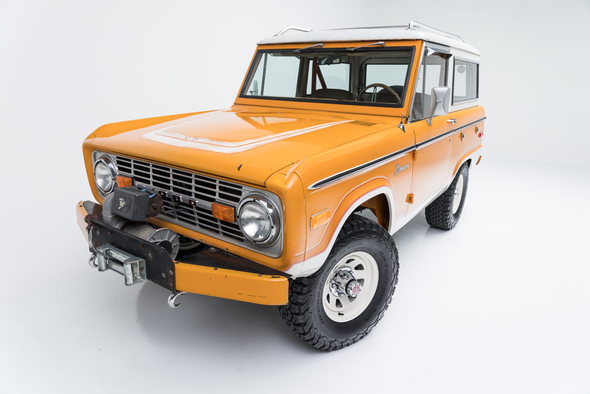 The white-finished 15″ steel wheels are mounted with 31×10.5″ BFGoodrich All-Terrain T/A K02 tires that were installed recently. Work under current ownership is said to consist of fitting a suspension lift, Bilstein shock absorbers, and a power brake booster, machining the rear drums, and replacing the wheel cylinders and brake shoes. The truck is equipped with manually locking hubs and power-assisted steering.