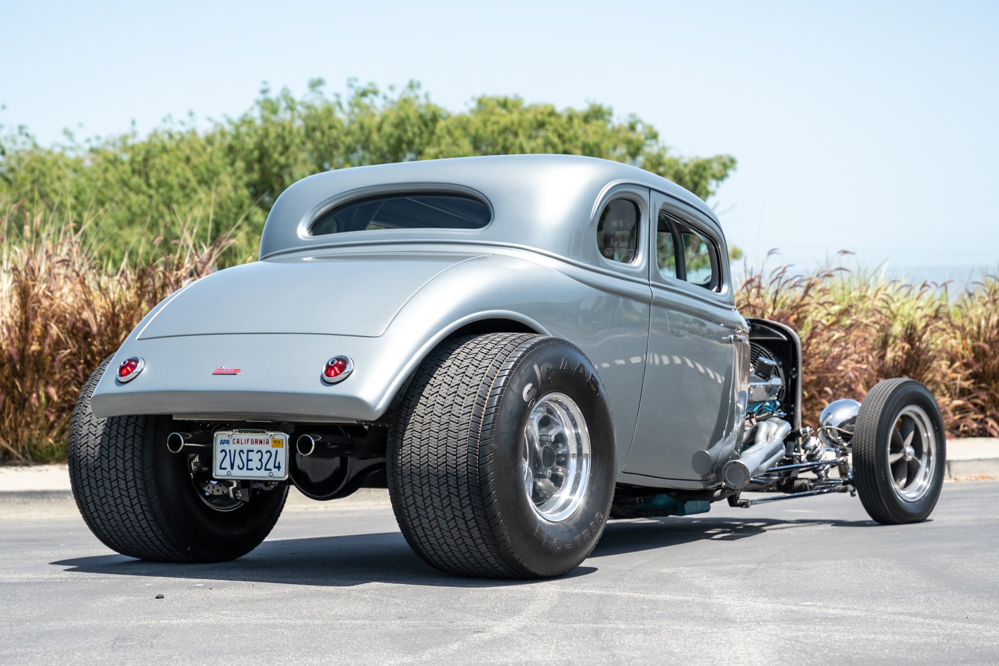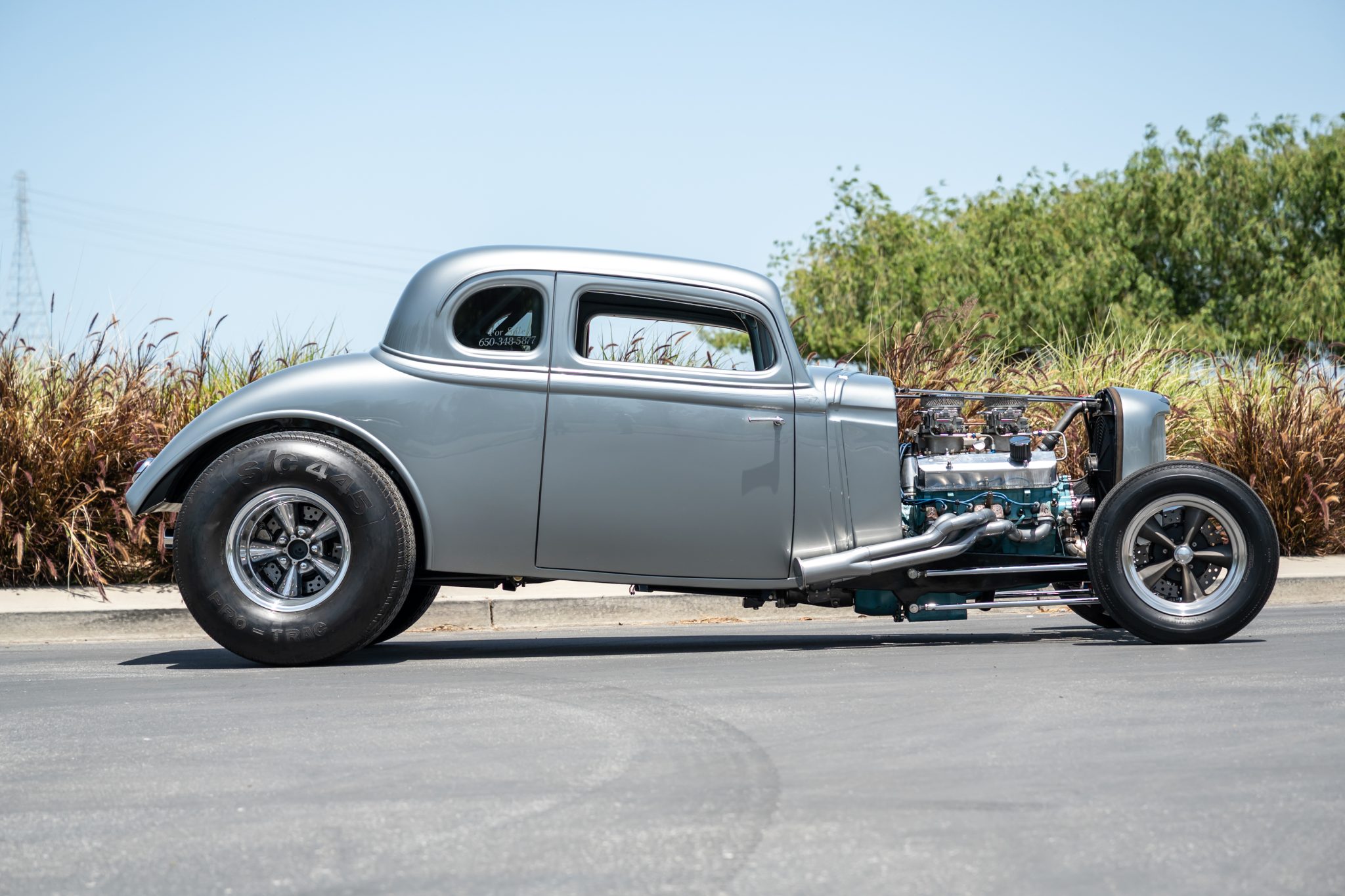 Spindle-mount magnesium front wheels are wrapped in 5.60-15″ Pro Trac tires and 15×15″ E-T Team III polished aluminum rear wheels are mounted with Pro Trac S/C 445 tires. The car is equipped with a chrome tubular front drop axle, custom rear traction bars, adjustable coilovers, rack-and-pinion steering, and four-wheel disc brakes with drilled rotors.