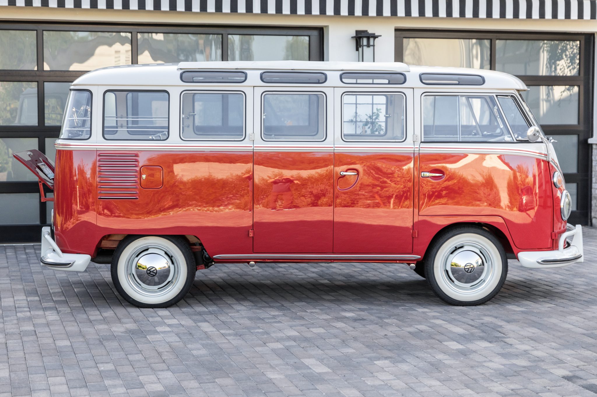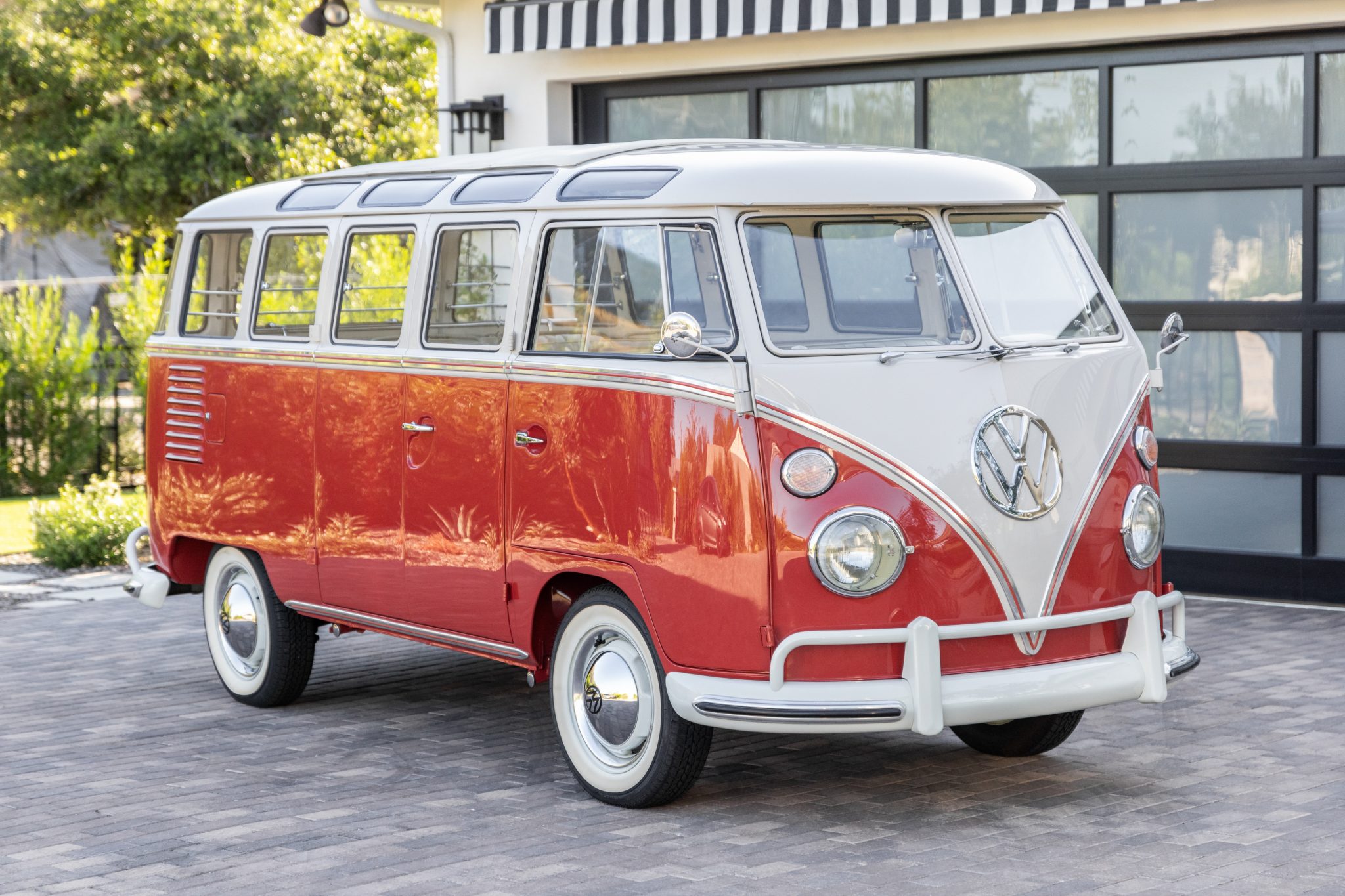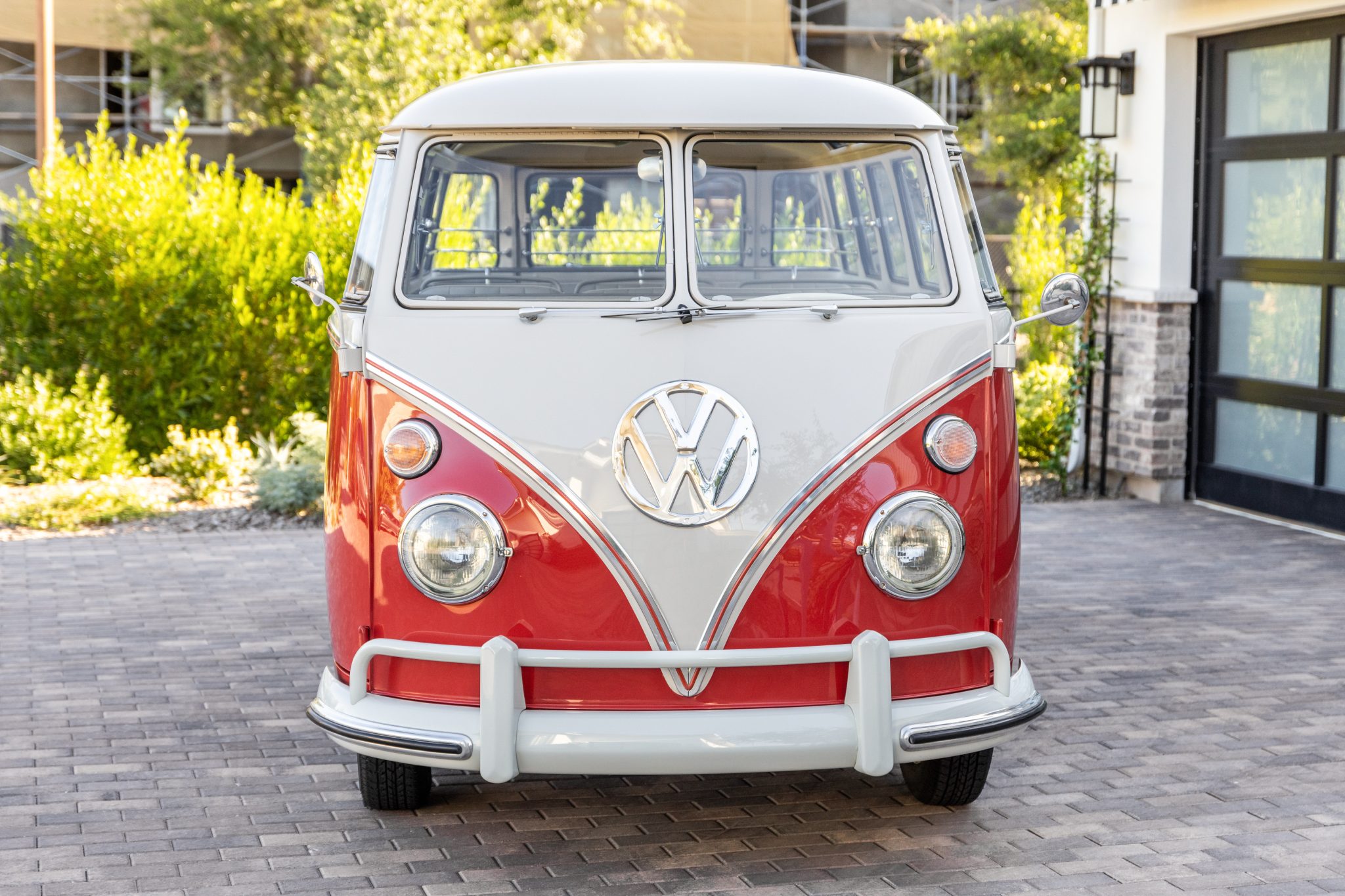 Steel 15″ wheels wear chrome trim rings and VW-stamped hubcaps and are mounted with 165-series Coker Classic whitewall tires. Stopping power is provided by drum brakes at all four corners.