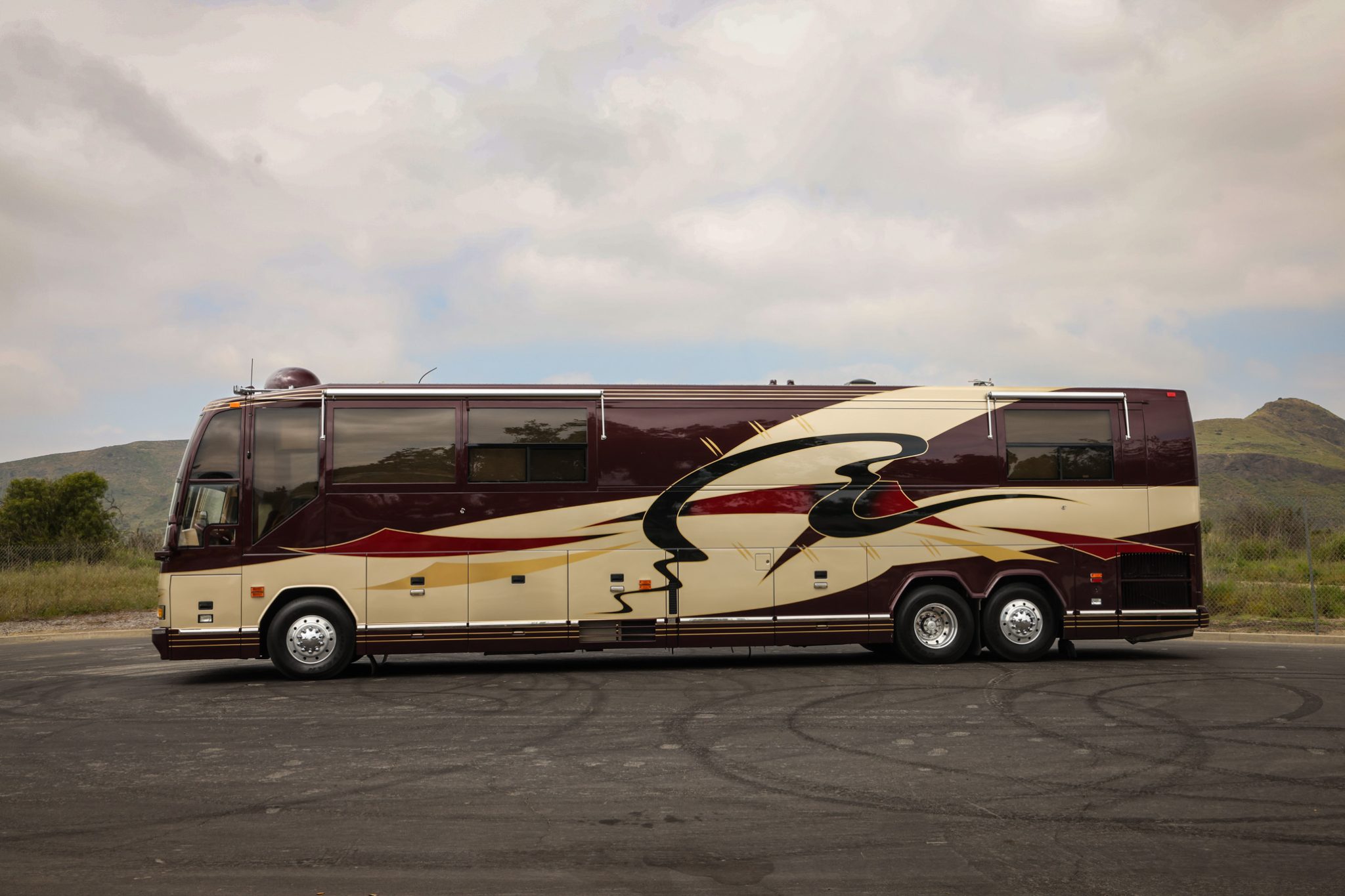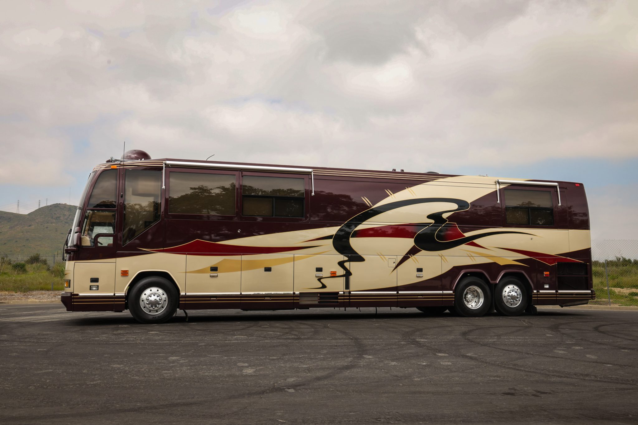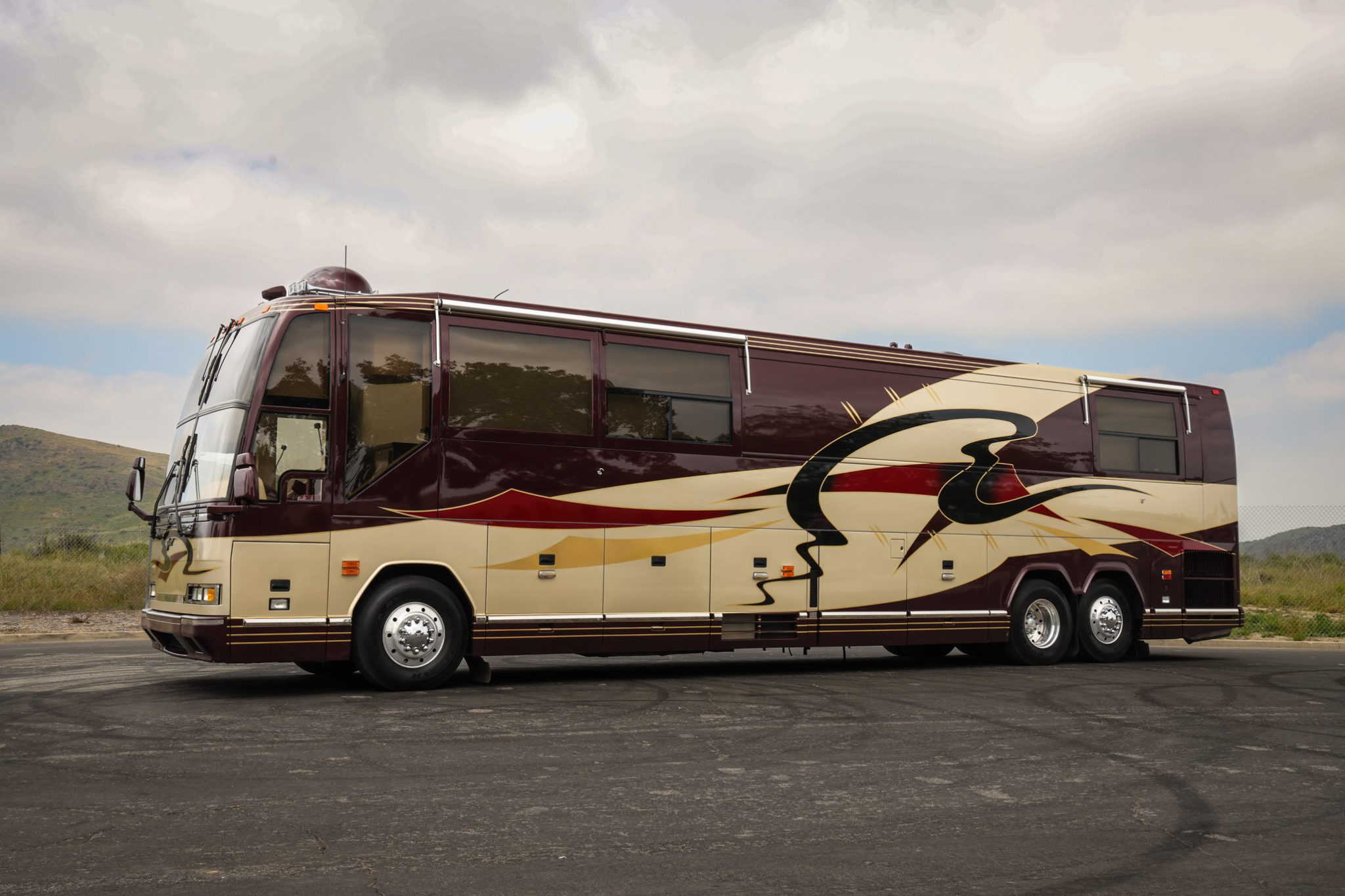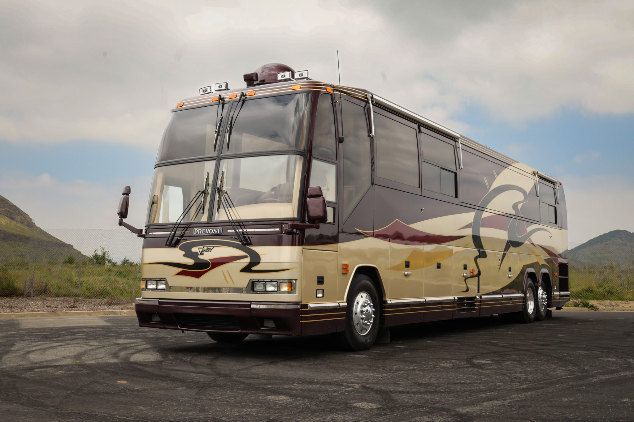 Alcoa 22.5″ aluminum wheels wear 315/80 Goodyear G670 RV tires, and stopping power is from air-actuated front and rear disc brakes. The coach is also equipped with a two-stage Jacobs engine brake, and the Prevost H3-45 VIP chassis rides on an air-adjustable suspension with an HWH auto-leveling system. A PowerTech diesel-fueled generator is secured within an equipment bay, and additional infrastructure equipment includes freshwater and waste tanks, eight house batteries, dual Trace Engineering power inverters, and shore connections for water, waste disposal, and 50-amp electrical service. Service in 2024 involved replacing front and rear brake chambers and the power steering pump as well as repairing the air suspension and the accessory compressed air system.
