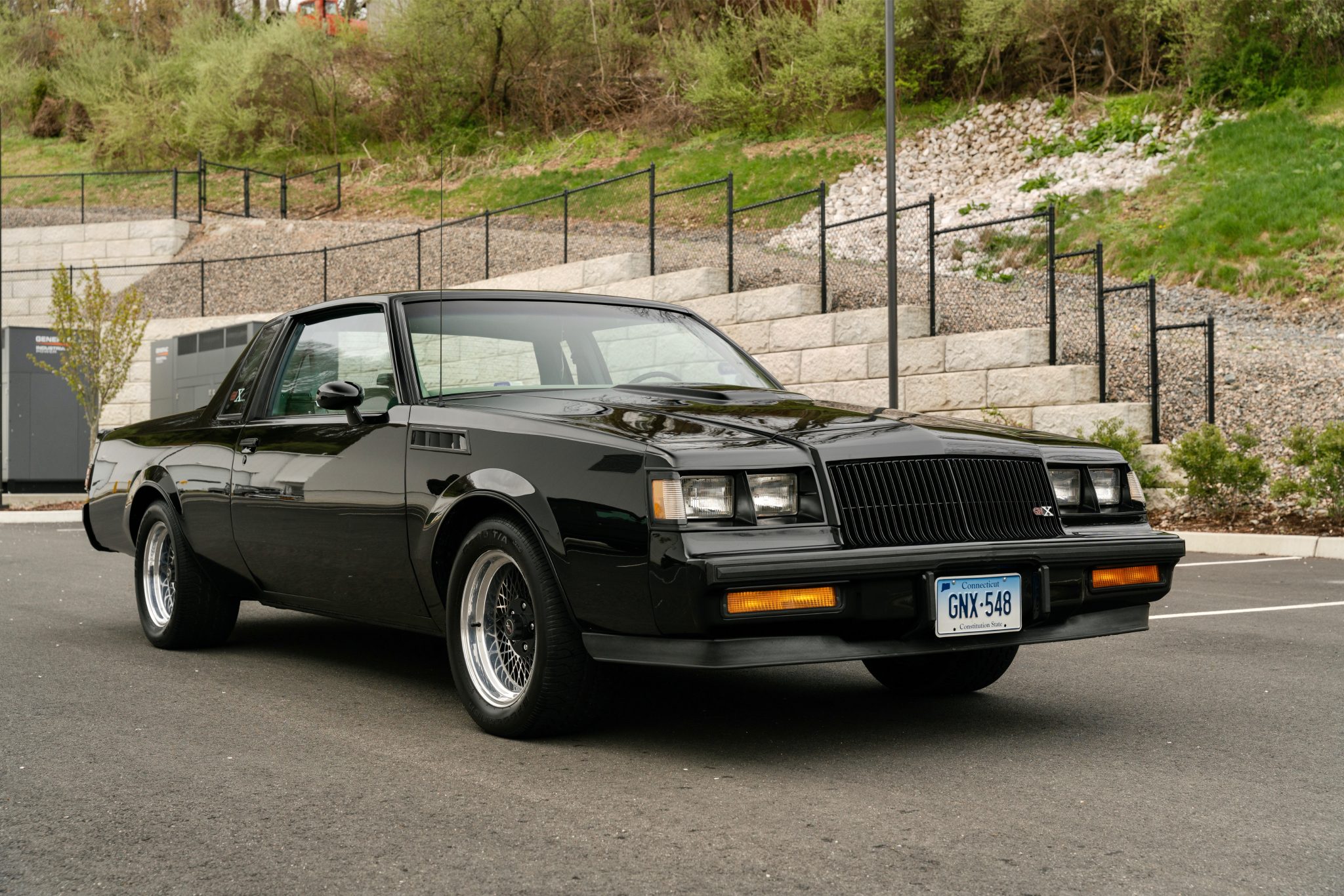 Cross-lace GNX-style 16″ black wheels wear chrome trim rings and are mounted with 245/50 BFGoodrich Comp T/A tires. The vehicle is equipped with power steering, and braking is provided by power-assisted front discs and rear drums.