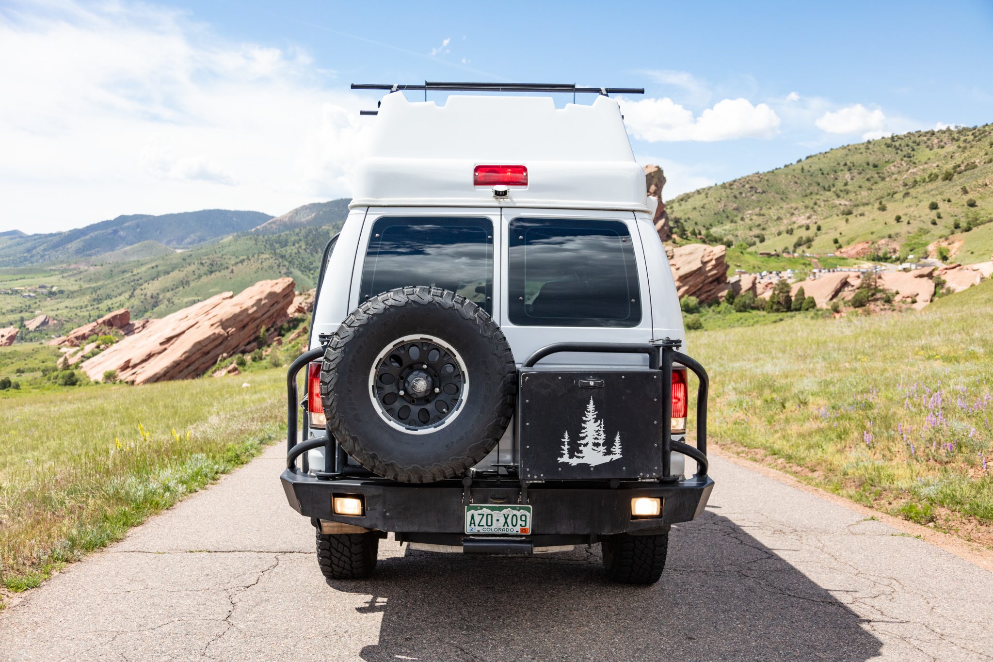 Black-finished 16″ American Racing wheels wear Cooper Discoverer S/T Maxx tires. Stopping power is provided by four-wheel disc brakes, and the vehicle is equipped with a Fox steering stabilizer.