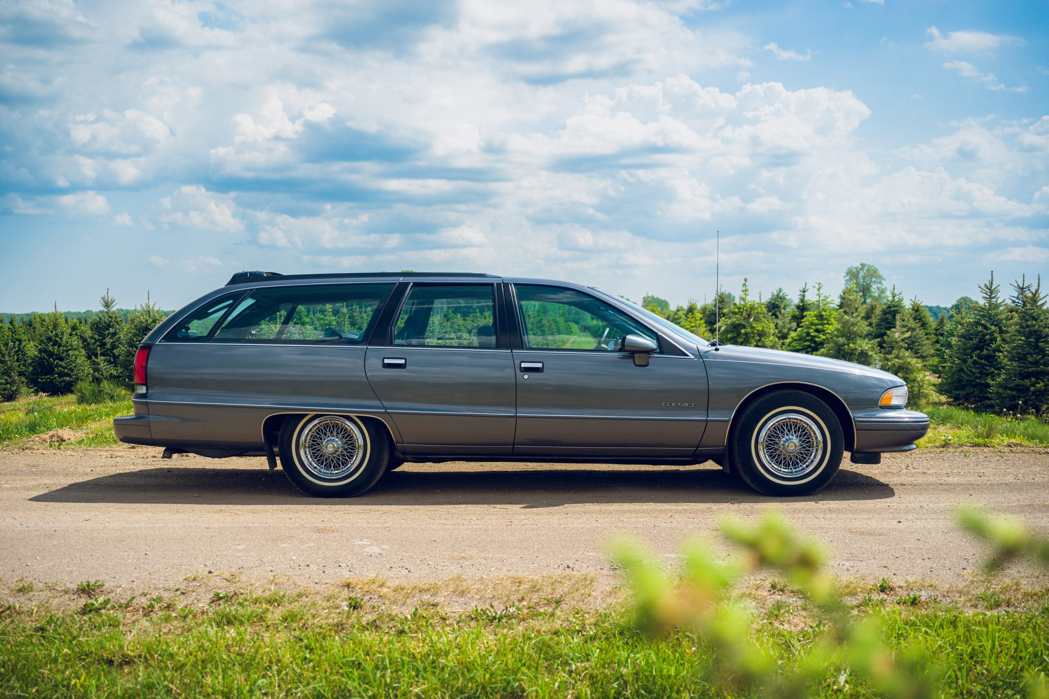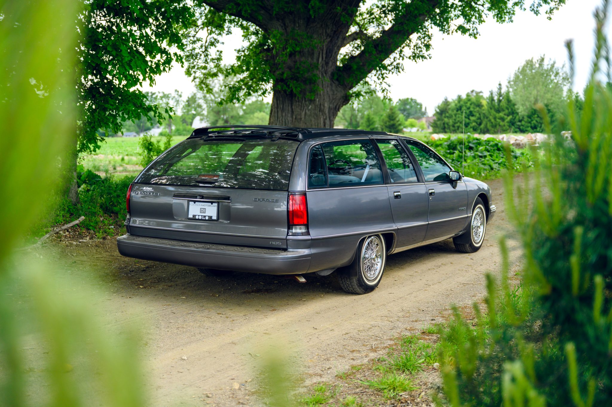 Steel 15″ wheels wear wire-style covers and are mounted with 225/75 General Ameritech 4 white-stripe tires. Braking is from antilock front discs and rear drums.