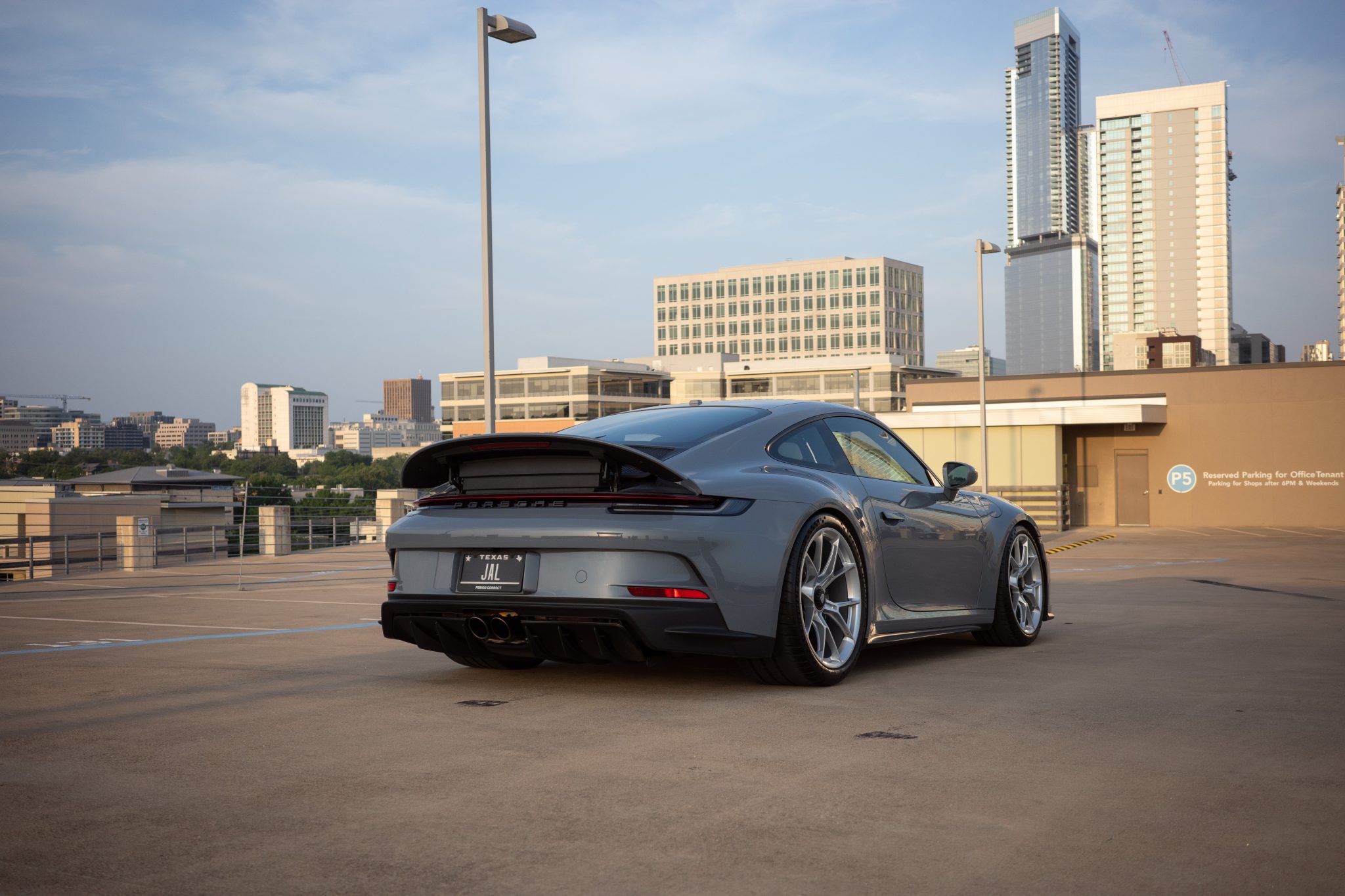 The 20″ front and 21″ rear GT3 center-lock wheels are mounted with staggered-width Michelin Pilot Sport Cup 2 tires showing 2023 date codes. Stopping power is provided by black-finished calipers over dimpled and ventilated discs at each corner. The car is equipped with a front-axle lift system and rear-axle steering.