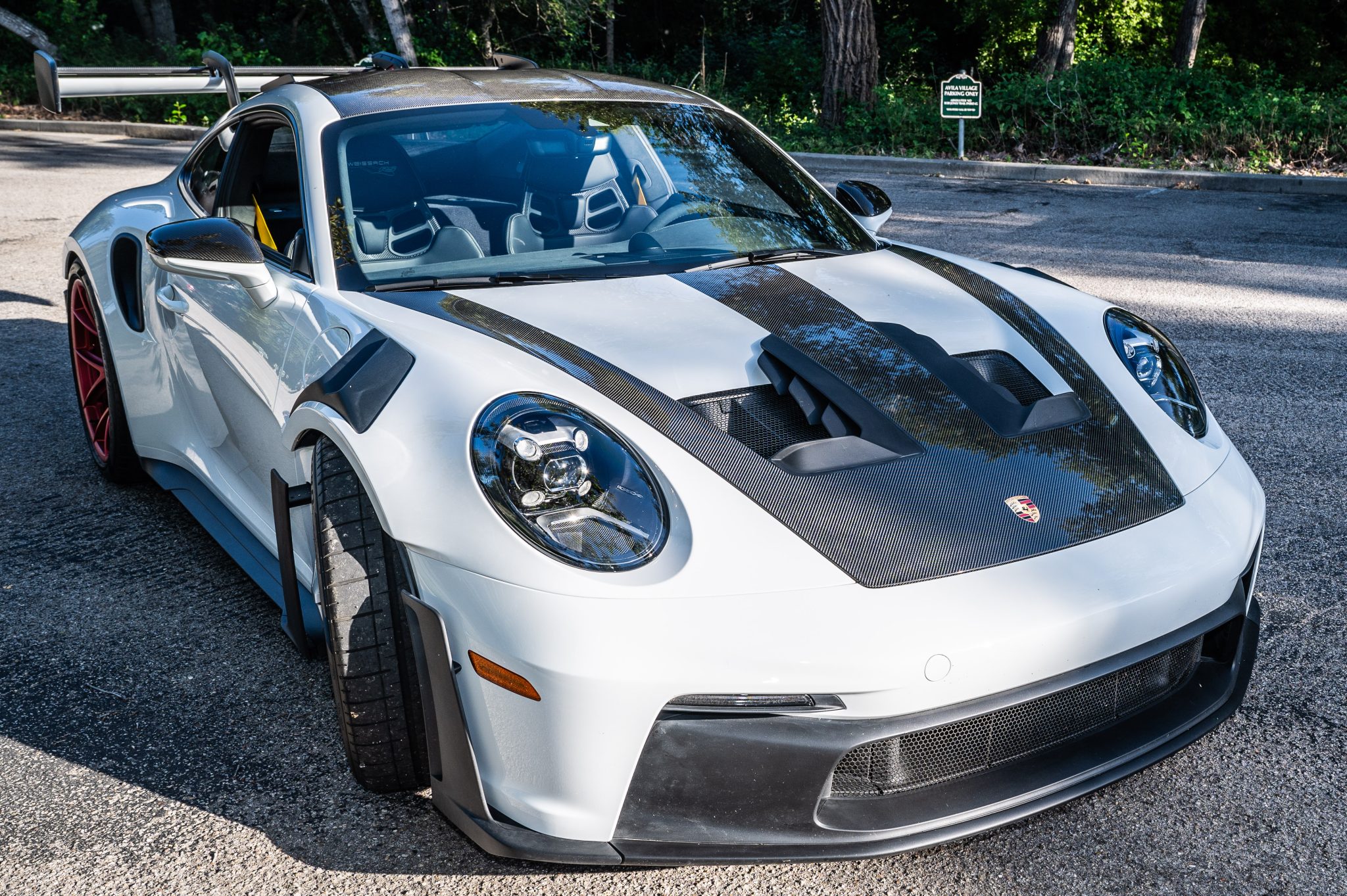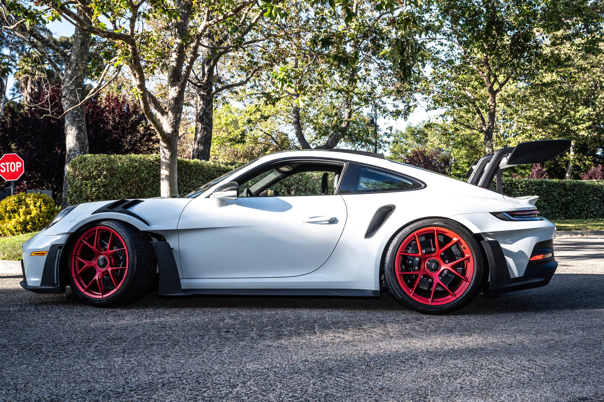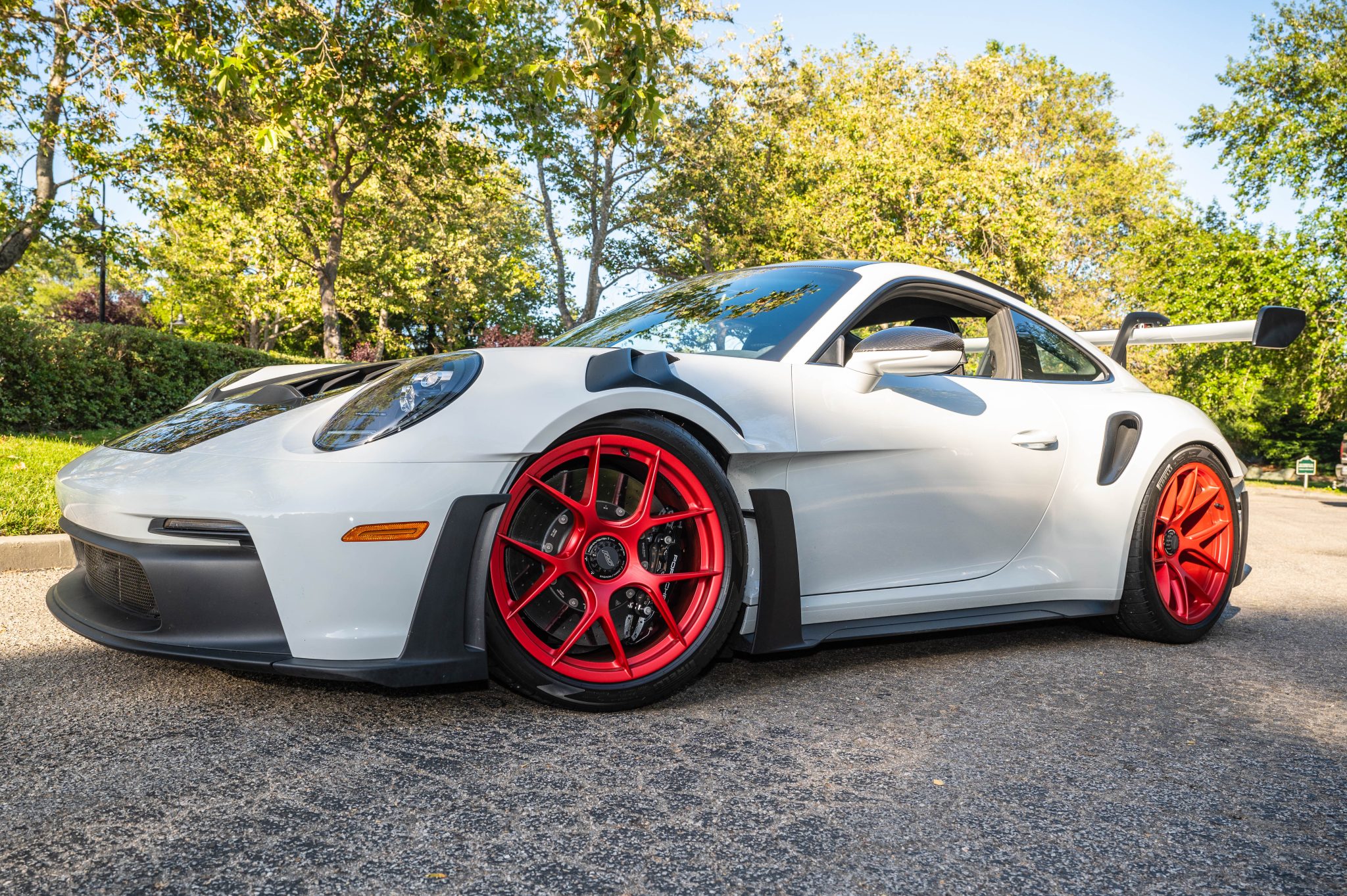 Satin Pyro Red-finished forged lightweight magnesium 20″ and 21″ GT3 center-lock wheels are mounted with staggered-width Pirelli P Zero Corsa tires. Stopping power is provided by Porsche Ceramic Composite Brakes (PCCB) with cross-drilled and ventilated discs at each corner. The car is equipped with rear-axle steering and the Weissach Package, which added carbon-fiber front and rear anti-roll bars and coupling rods.