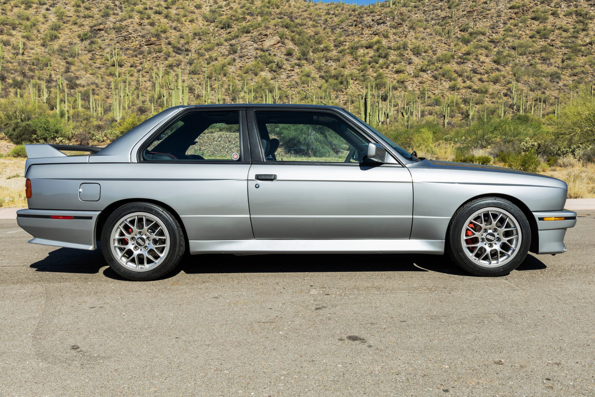 Silver-finished BBS RX 16″ wheels are mounted with 225/45 Dunlop Direzza ZIII tires that have 2023 production-date codes, and a spare on a matching wheel is secured in the trunk. A Stage 1 suspension kit was installed by Dinan, consisting of their dyno-matched lowering springs, larger sway bars, offset front control-arm bushings, and negative-camber front-shock mounts as well as adjustable Koni shocks. The rear sway-bar mounts received welded reinforcements, and front-brake cooling ducts have been routed from the fog-light openings in the front air dam to rotor backing plates. Braided stainless-steel brake lines have been fitted, and the rotors and pads were replaced in March 2024.
