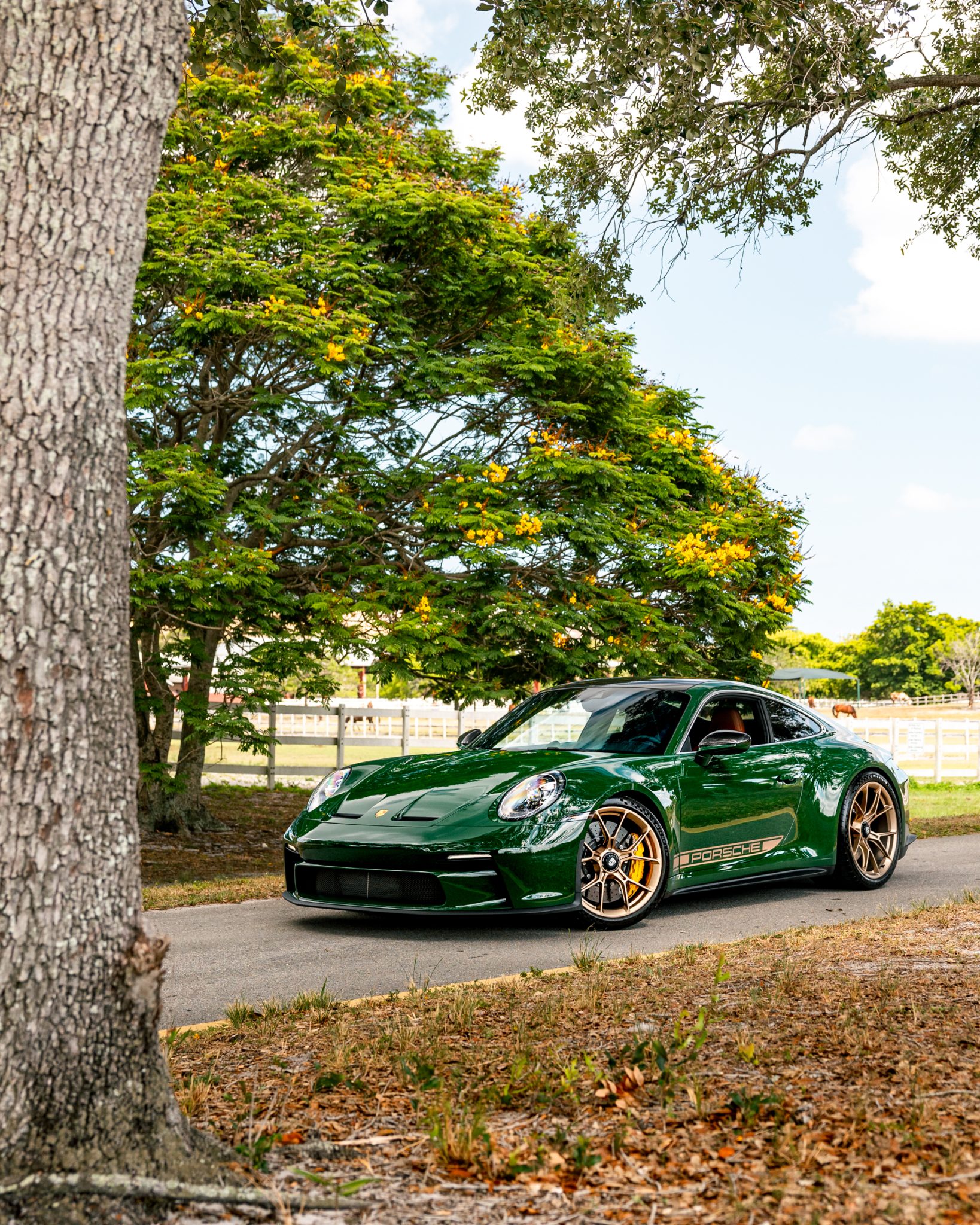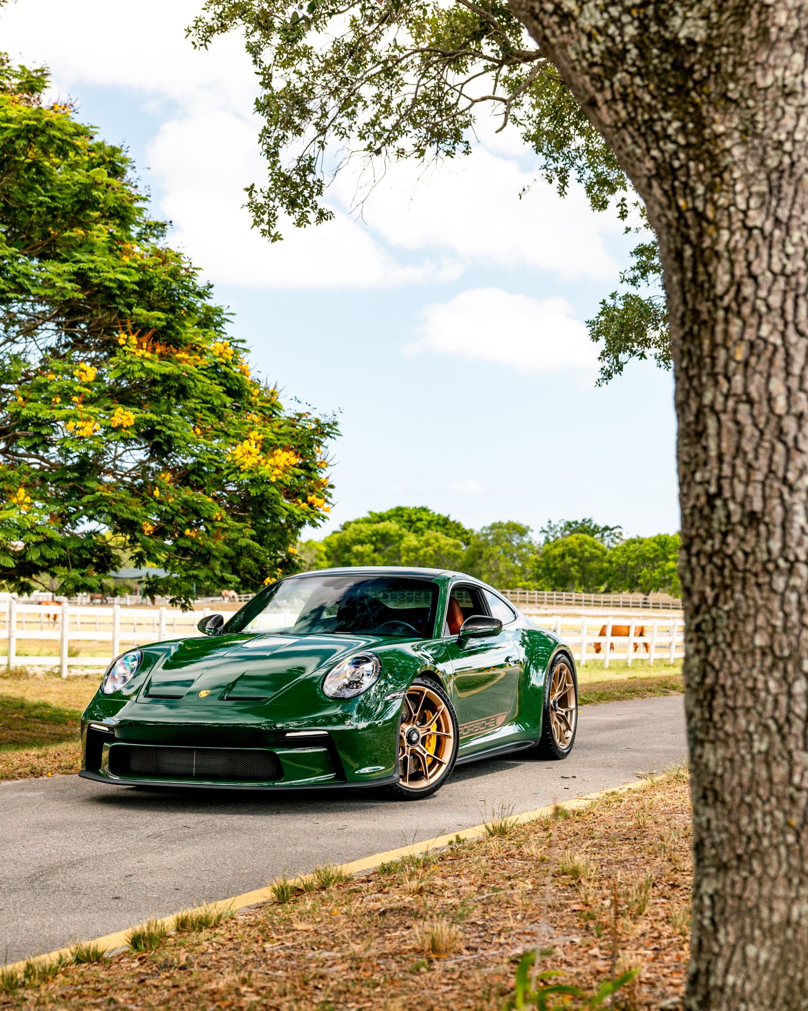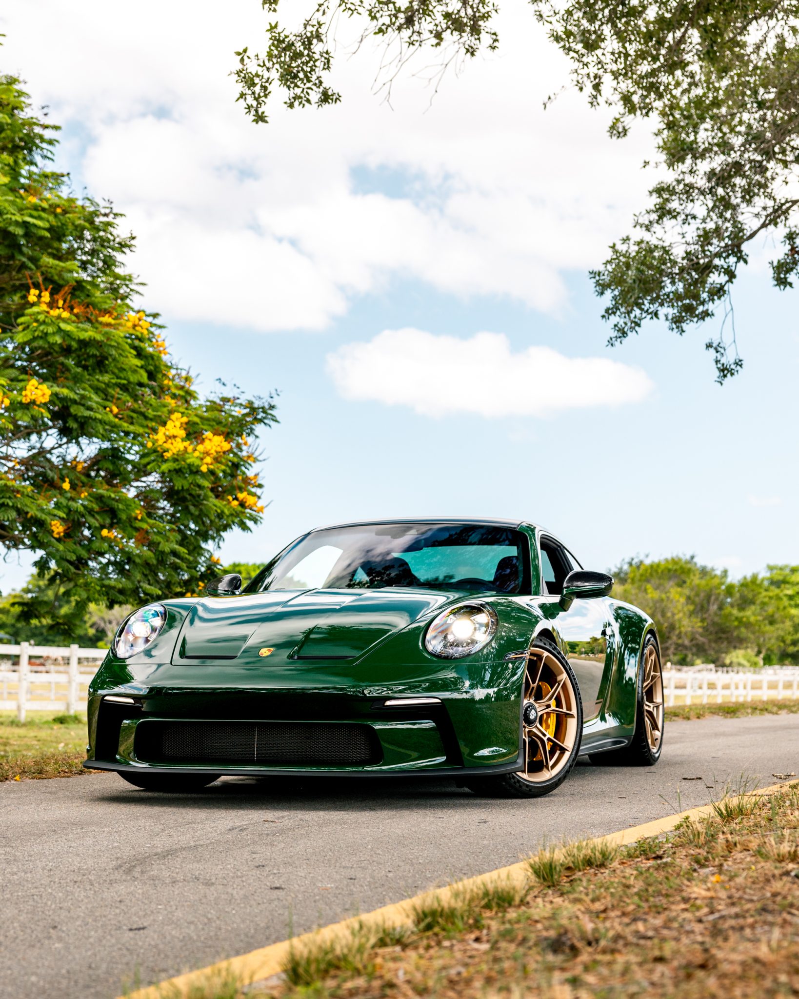 Satin Neodyme-finished 20″ and 21″ GT3 center-lock wheels are mounted with staggered-width Michelin Pilot Sport Cup 2 tires. Stopping power is provided by Porsche Ceramic Composite Brakes (PCCB) with yellow calipers over cross-drilled and ventilated discs at each corner. The car is equipped with a front-axle lift system and rear-axle steering.
