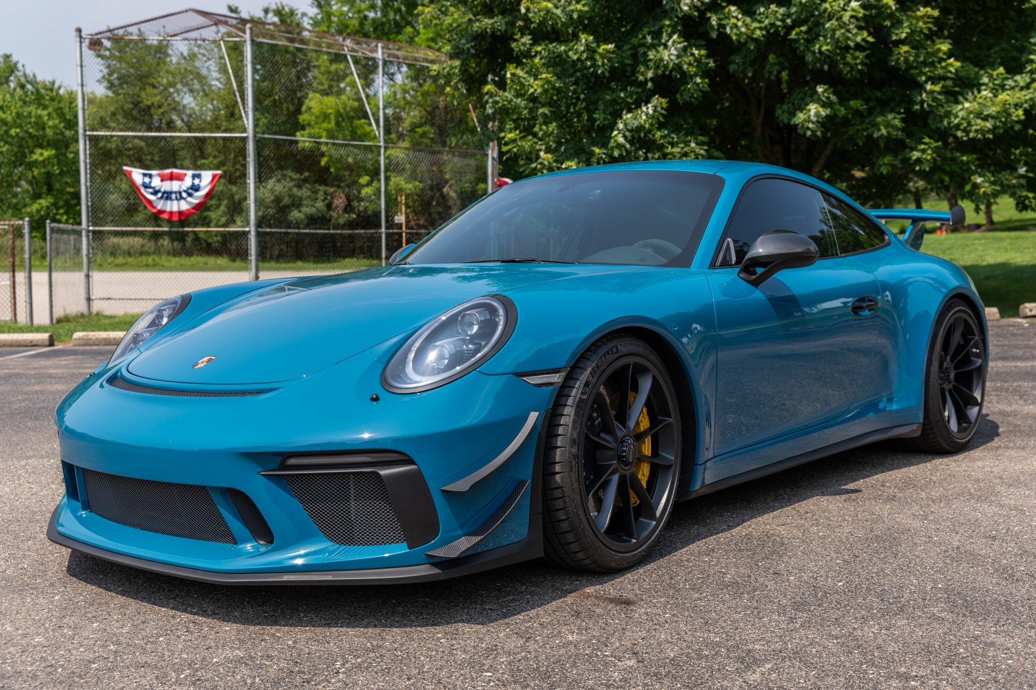 Satin black-finished 20″ center-lock forged wheels were installed under current ownership and wear 245/45 front and 305/30 rear Michelin Pilot Sport 4S tires. Braking is handled by yellow Porsche-branded calipers over ceramic-composite discs. The car is equipped with a front-axle lift system, rear-axle steering, and Porsche Active Suspension Management. A brake fluid flush was performed in August 2023.