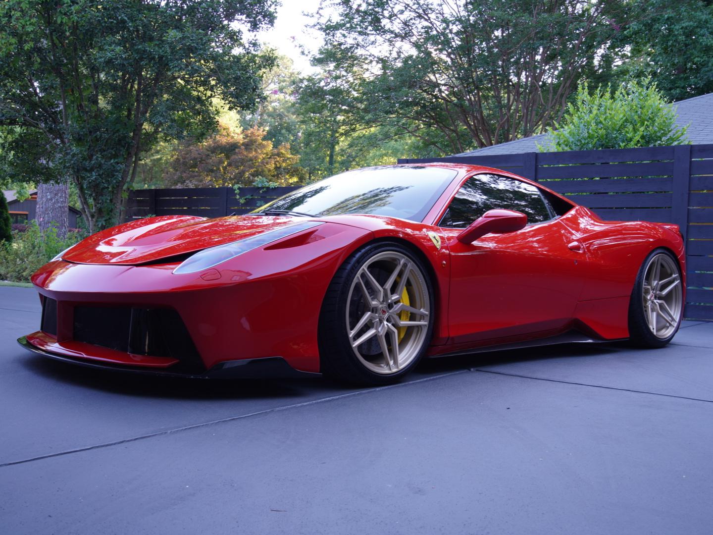 Gold-finished 20″ and 21″ Vossen forged wheels are mounted with staggered-width Michelin tires. The car is equipped with magnetorheological dampers and Novitec lowering springs, and braking is handled by yellow-finished Ferrari calipers over cross-drilled carbon-ceramic rotors at all four corners. Additionally, the seller notes a second set of wheels are included.