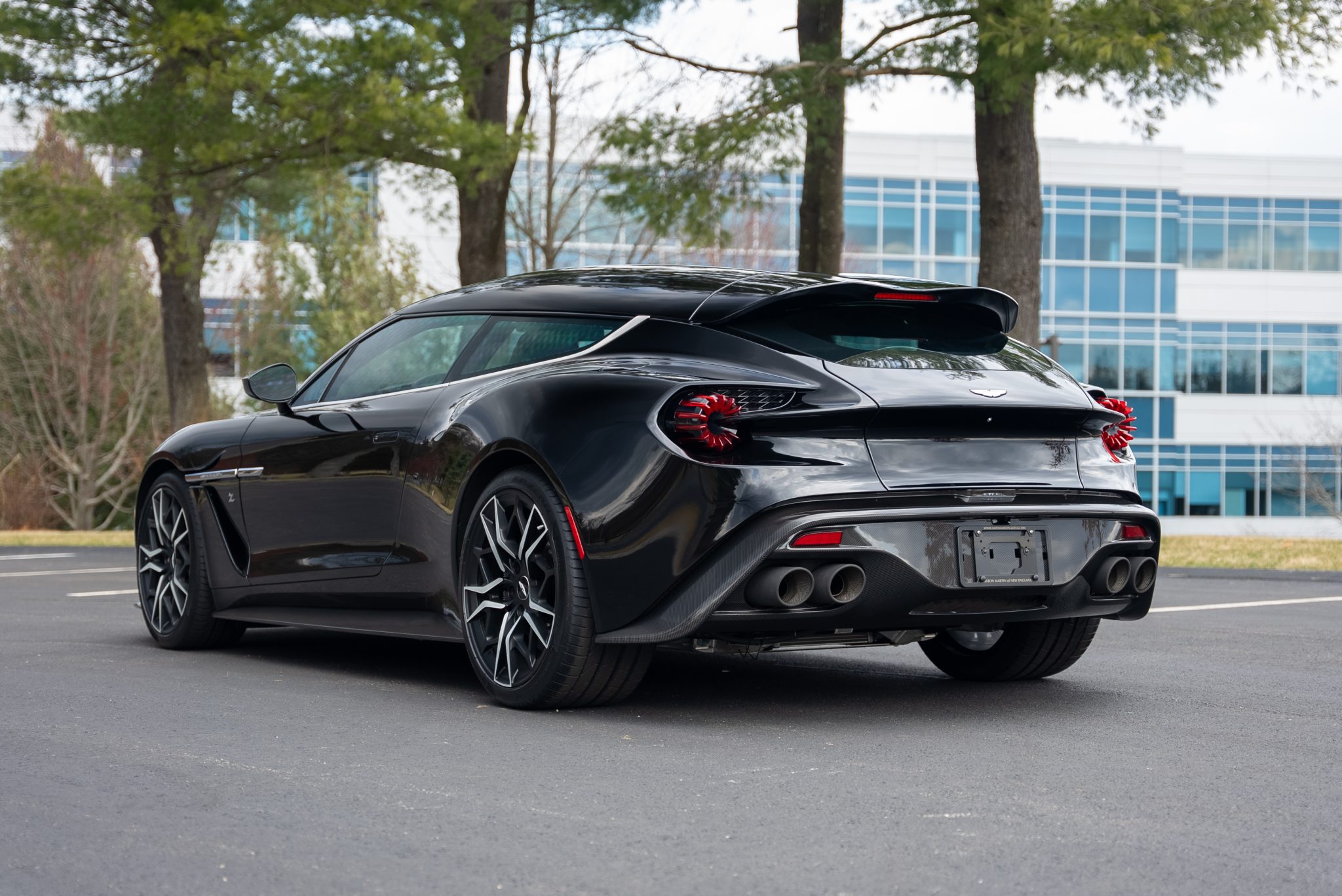 The Zagato-styled shooting brake bodywork is finished in Scorching Black and incorporates a double-bubble carbon fiber roof, a Z-patterned front grille, Zagato badging, and taillight reflectors with blade-style LEDs. Additional exterior details include carbon-fiber exterior trim, swan doors, xenon headlights, tinted glass, a rear spoiler, front and rear parking sensors, a rearview camera, and integrated exhaust outlets. Paint protection film covers the hood, fenders, rocker panels, mirror caps, and front bumper cover.