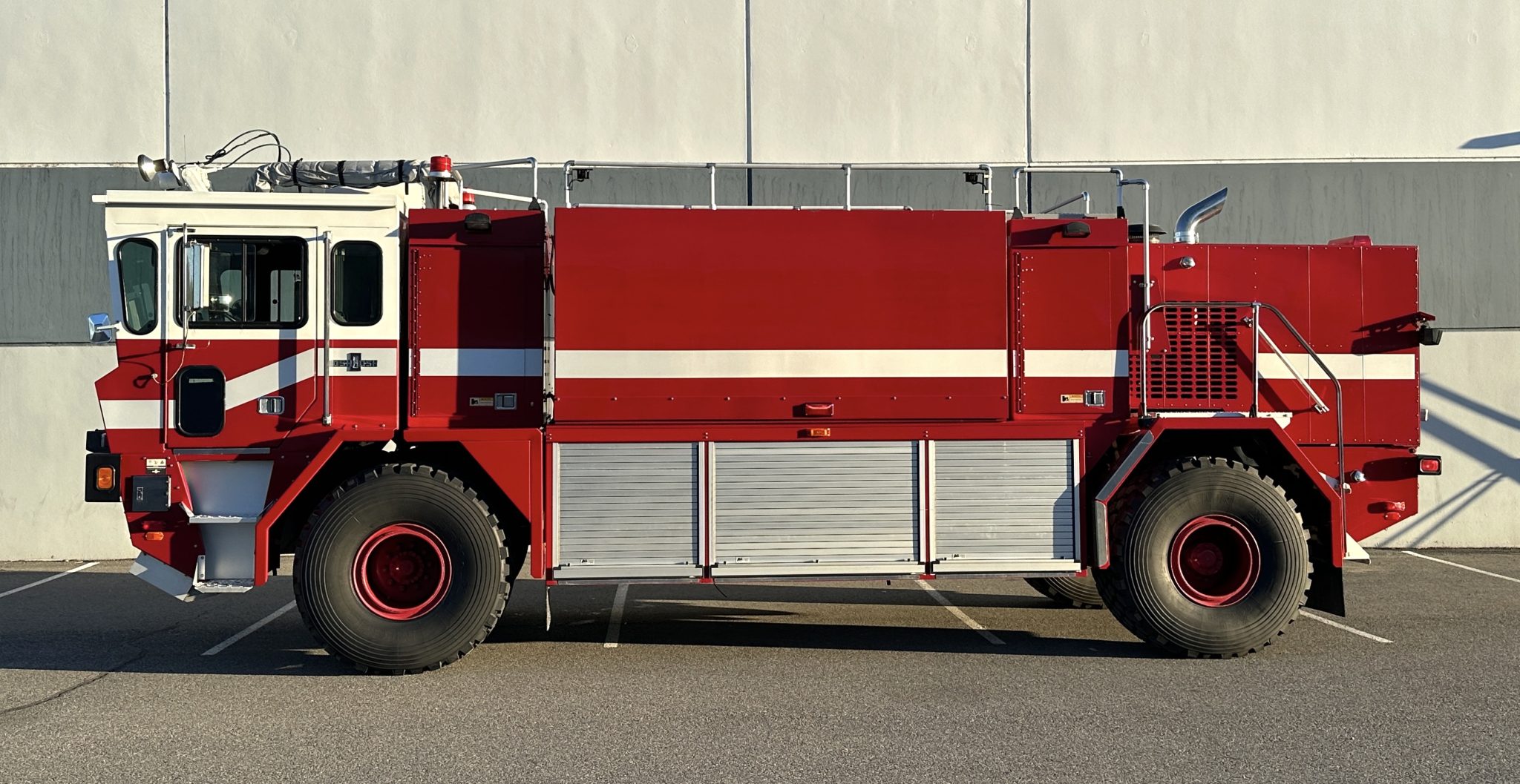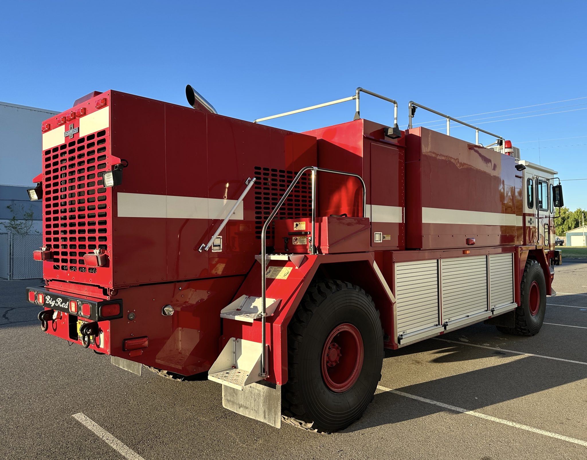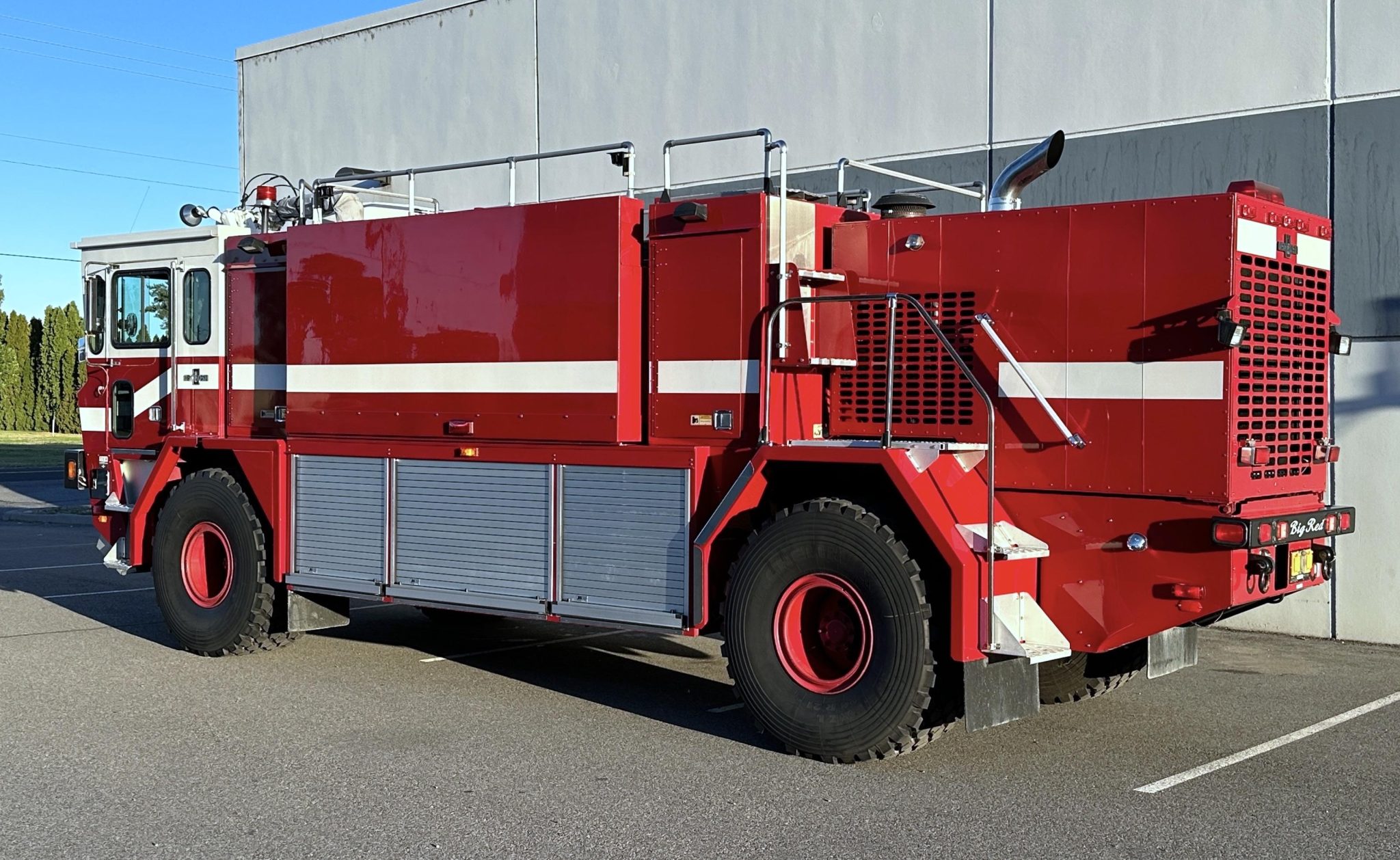 Red-finished 21″ steel wheels wear 24-series Michelin XZL tires which are said to have been mounted under current ownership. Braking is provided by air-assisted drums.