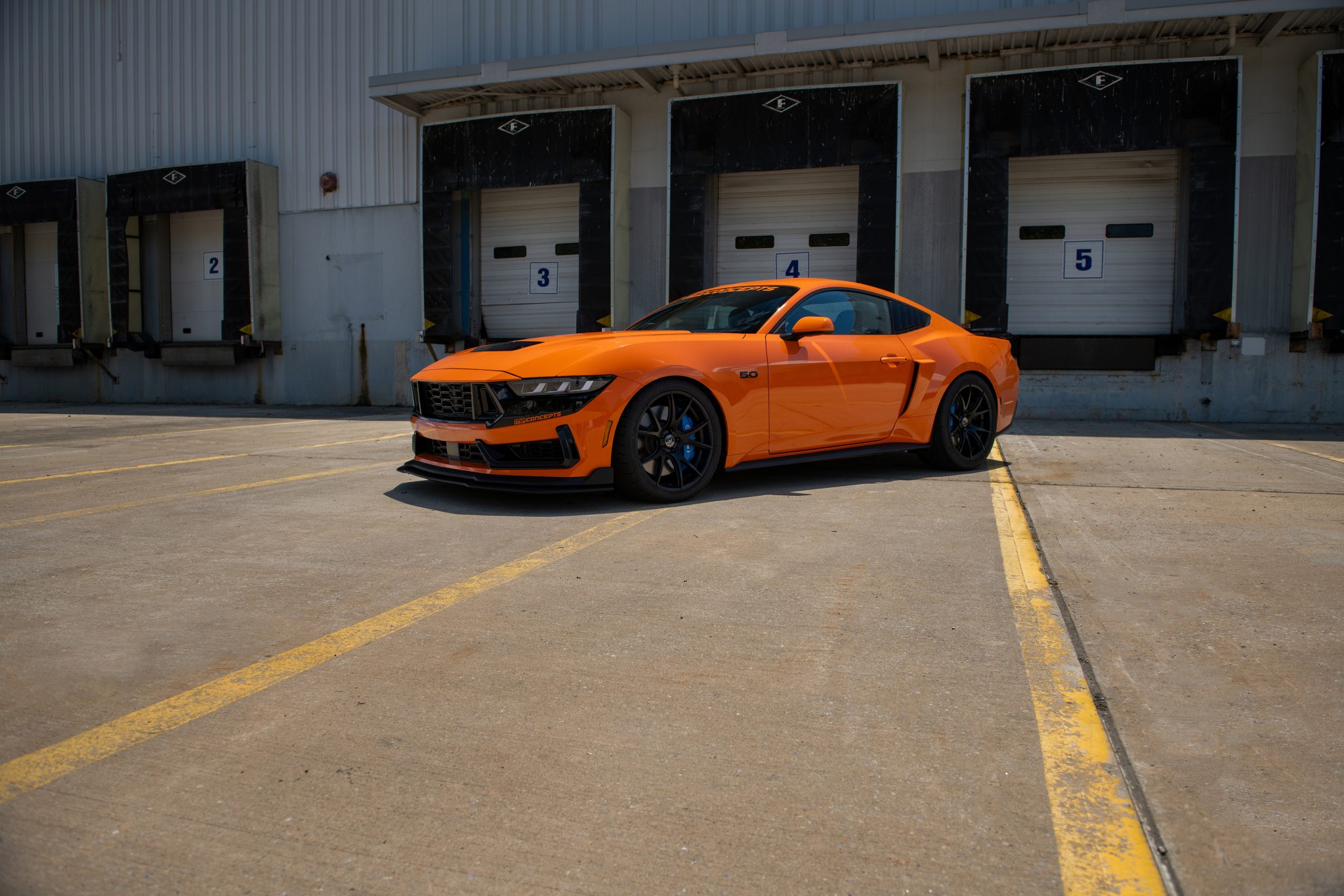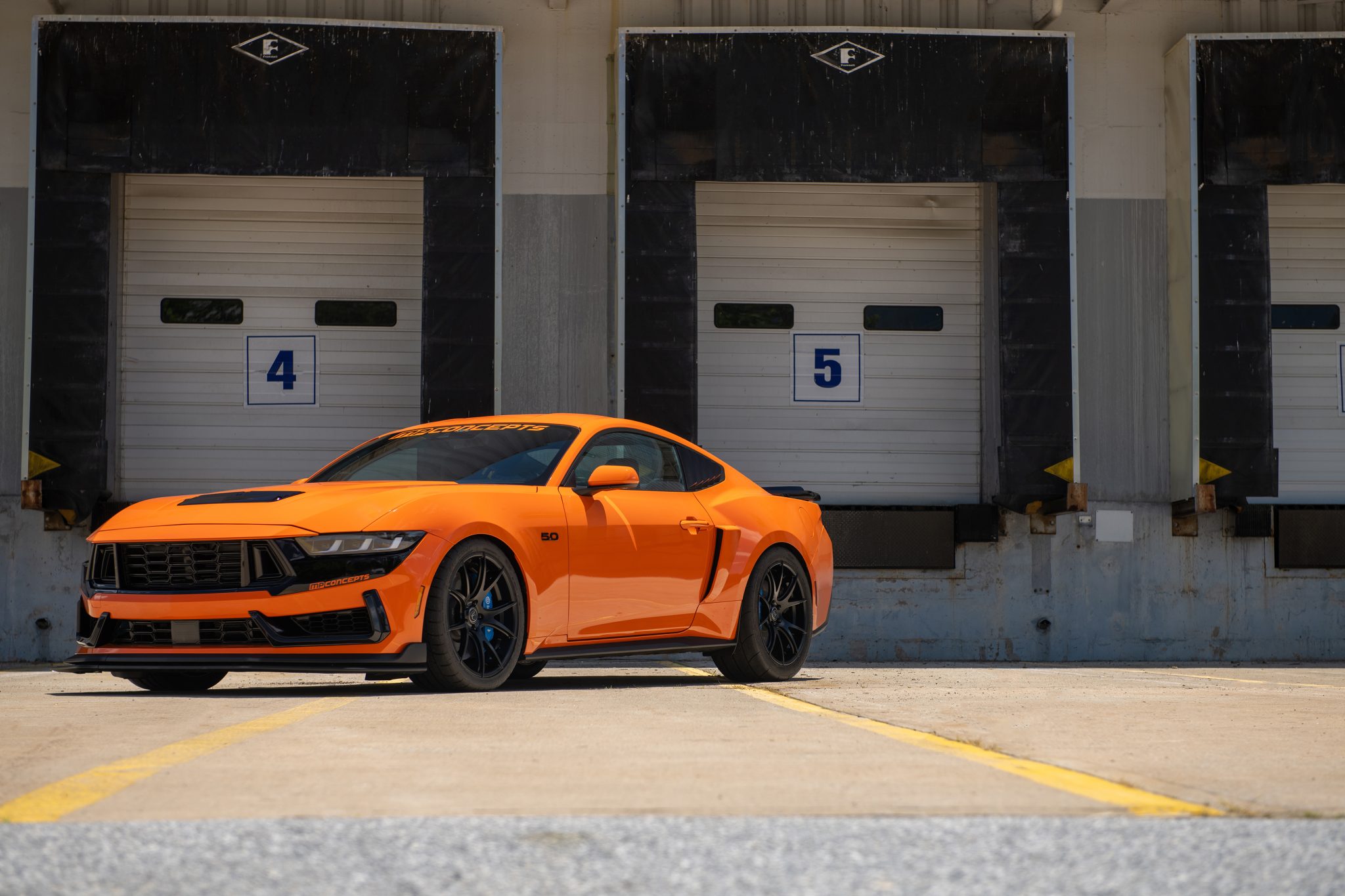 Staggered-width 20″ Forgestar CF5V wheels are mounted with 275/35 Mickey Thompson Street Comp front tires and 305/35 rear Mickey Thompson ET Street S/S rear tires, and they are affixed via six-spline aftermarket lug nuts. The suspension has been fitted with Roush Performance single-adjustable coilovers, which lower the ride height by approximately 1.5″ at the front corners and 1″ at the rear. Stopping power is provided by four-wheel disc brakes with blue-finished Brembo calipers featuring six pistons up front and four pistons out back.