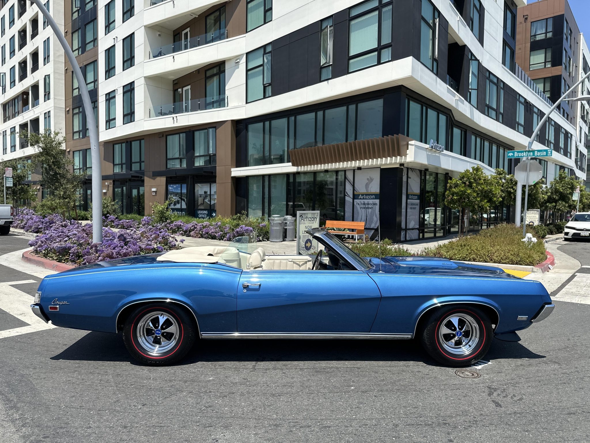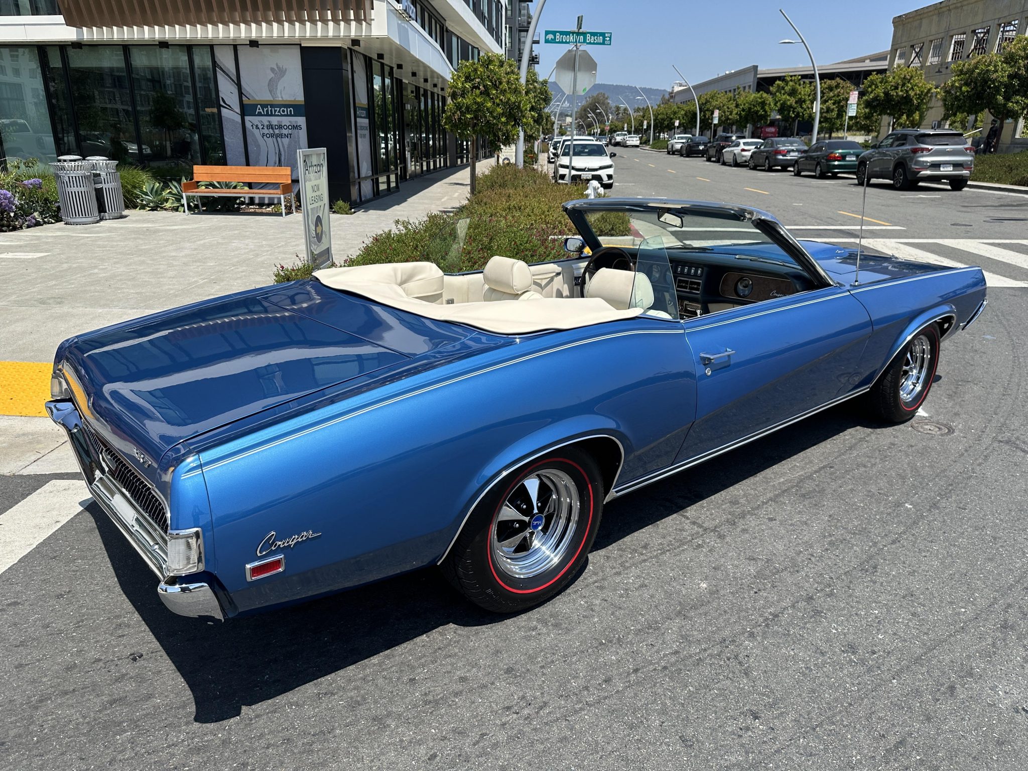 The 14″ Magnum 500-style wheels are mounted with 225/70 BFGoodrich Silvertown redline tires. Stopping is provided by power-assisted front discs and rear drums.