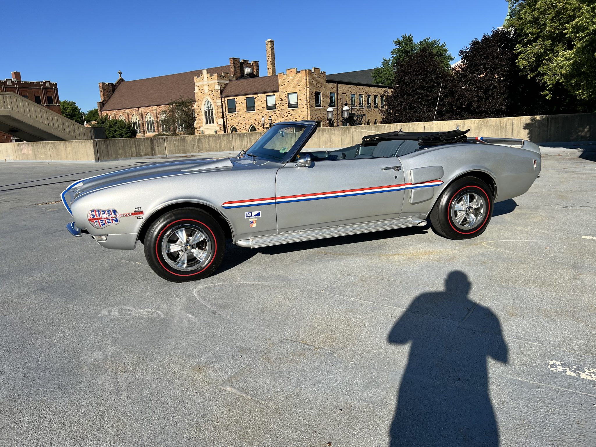 Silver 14″ wheels wear Hurst center caps and reproduction FR70-series Firestone Super Sports Wide Oval redline tires that show 2023 production date codes. The car is equipped with power steering, and braking is handled by power-assisted front discs and rear drums. The rear leaf springs and front coil springs were replaced under current ownership, and a Hotchkis cross-brace support and subframe connectors were installed at that time.