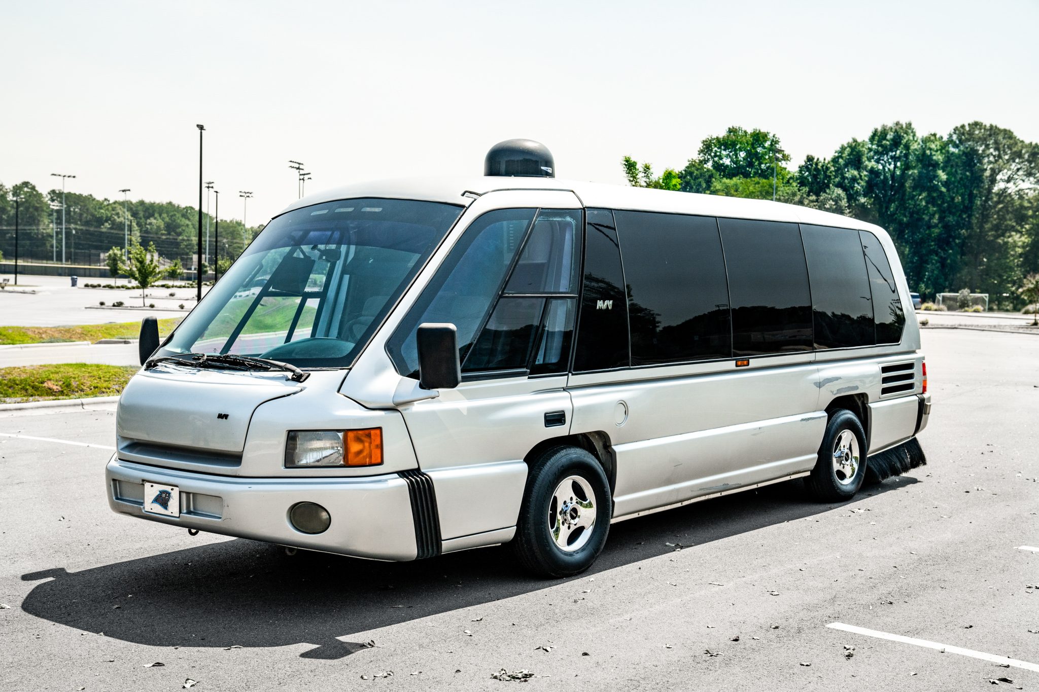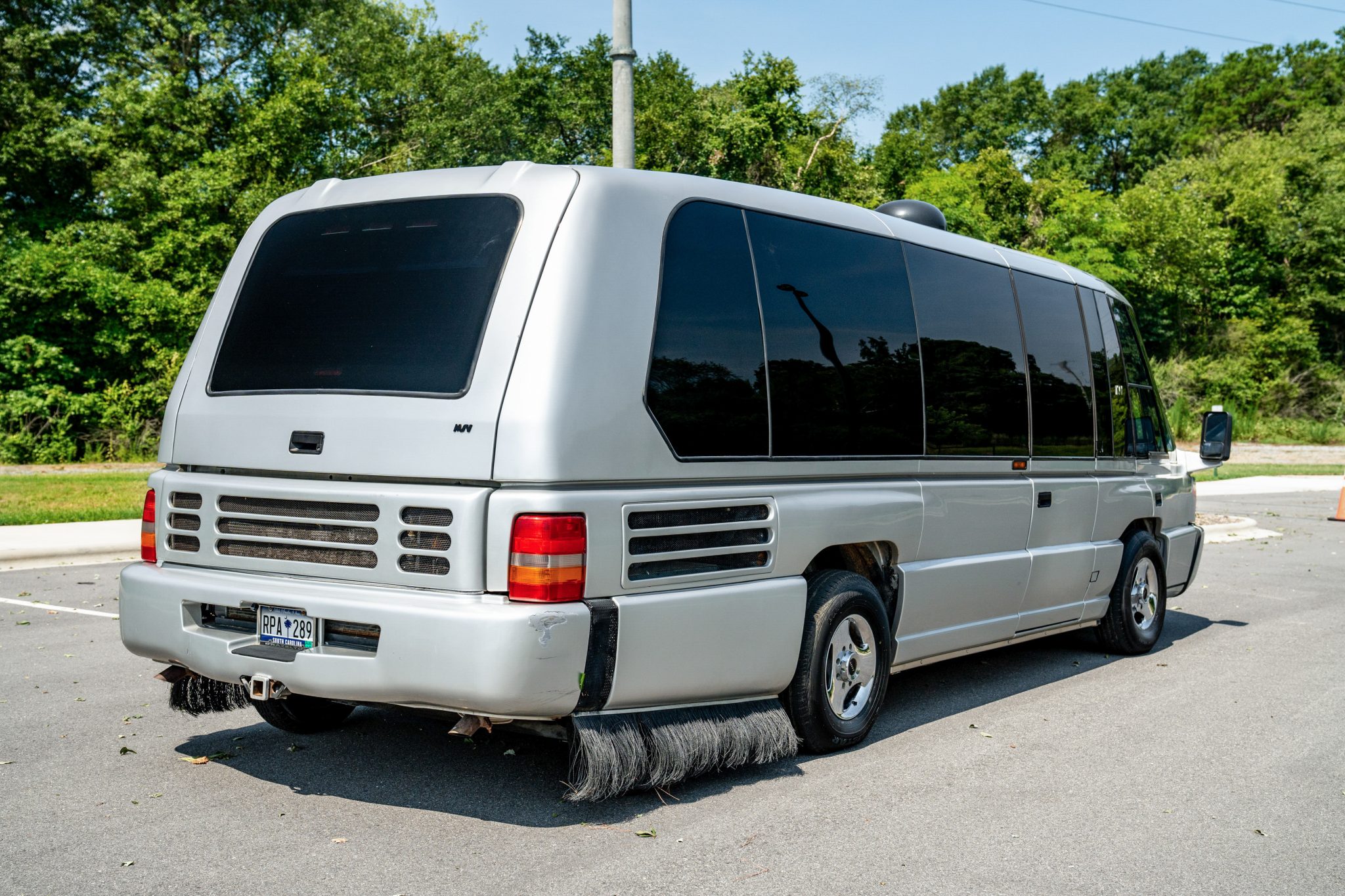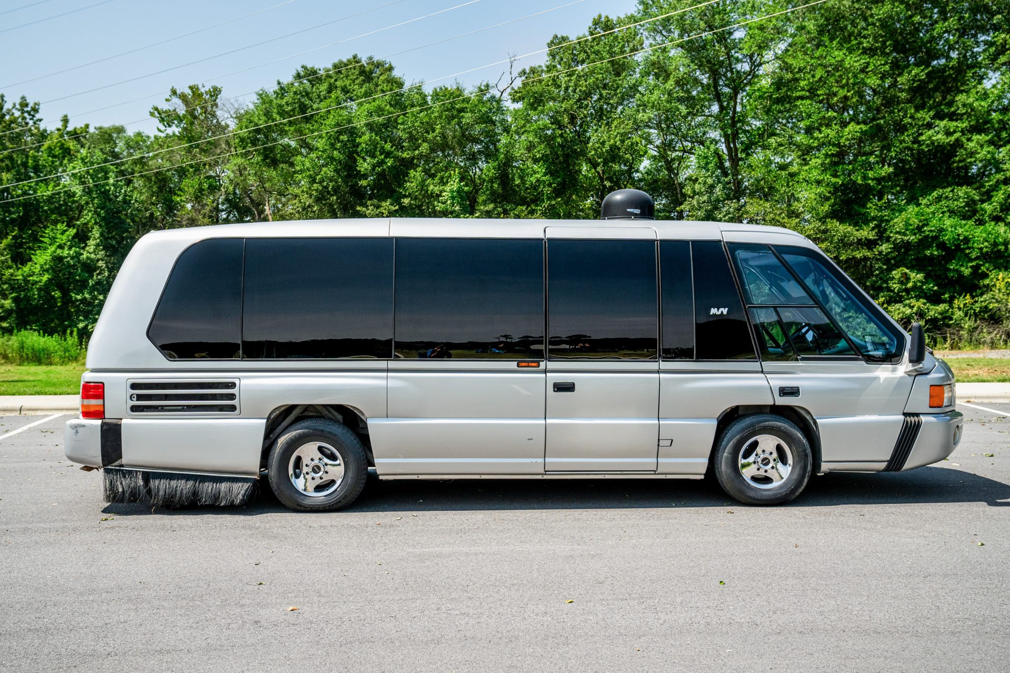Three-spoke 16″ alloy wheels are mounted with a mixed set of tires. The coach rides on a carbon-steel space frame chassis with a 144″ wheelbase and is equipped with an air suspension system, an inset rear tag axle, and General Motors-sourced four-wheel disc brakes.