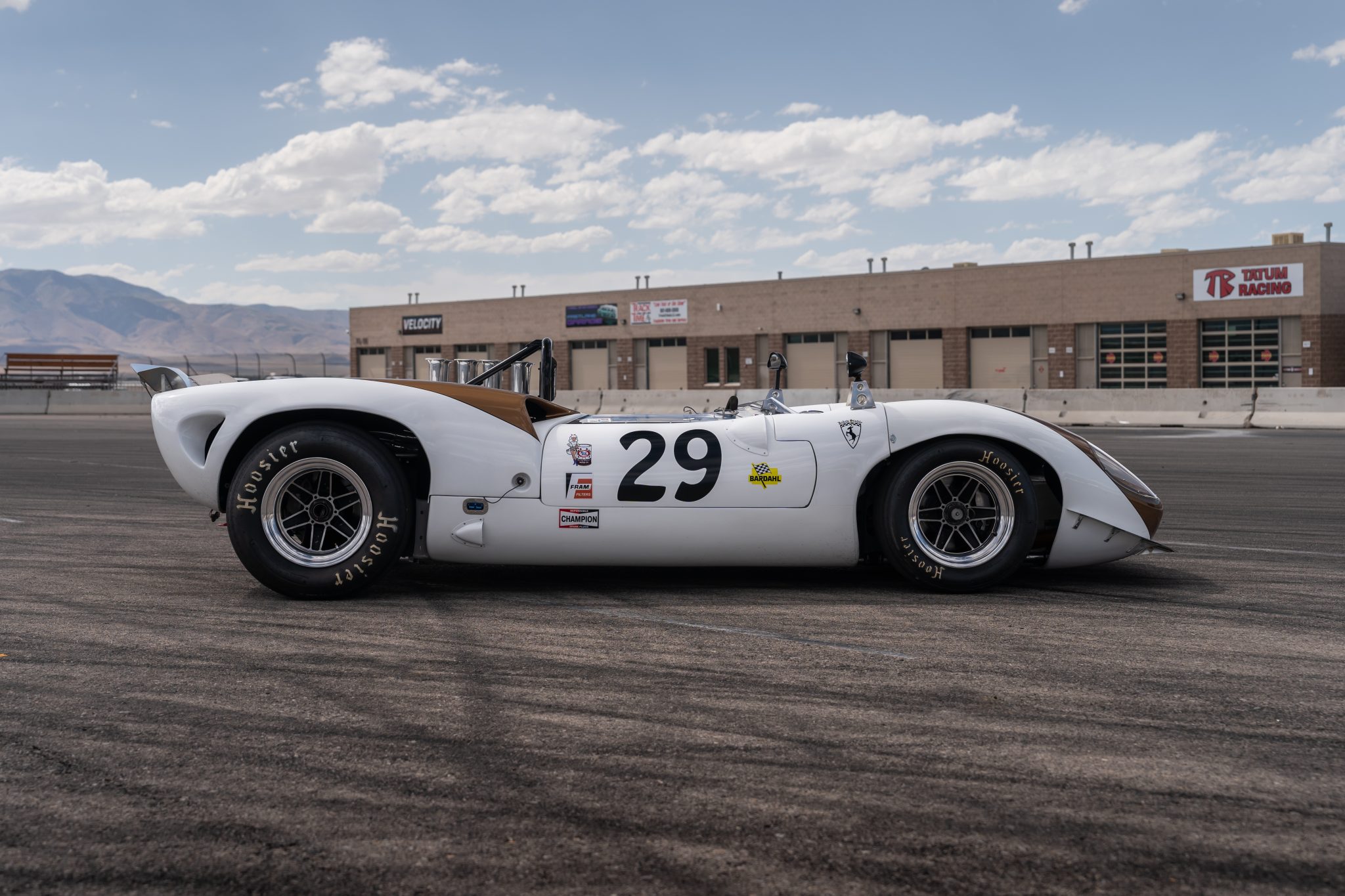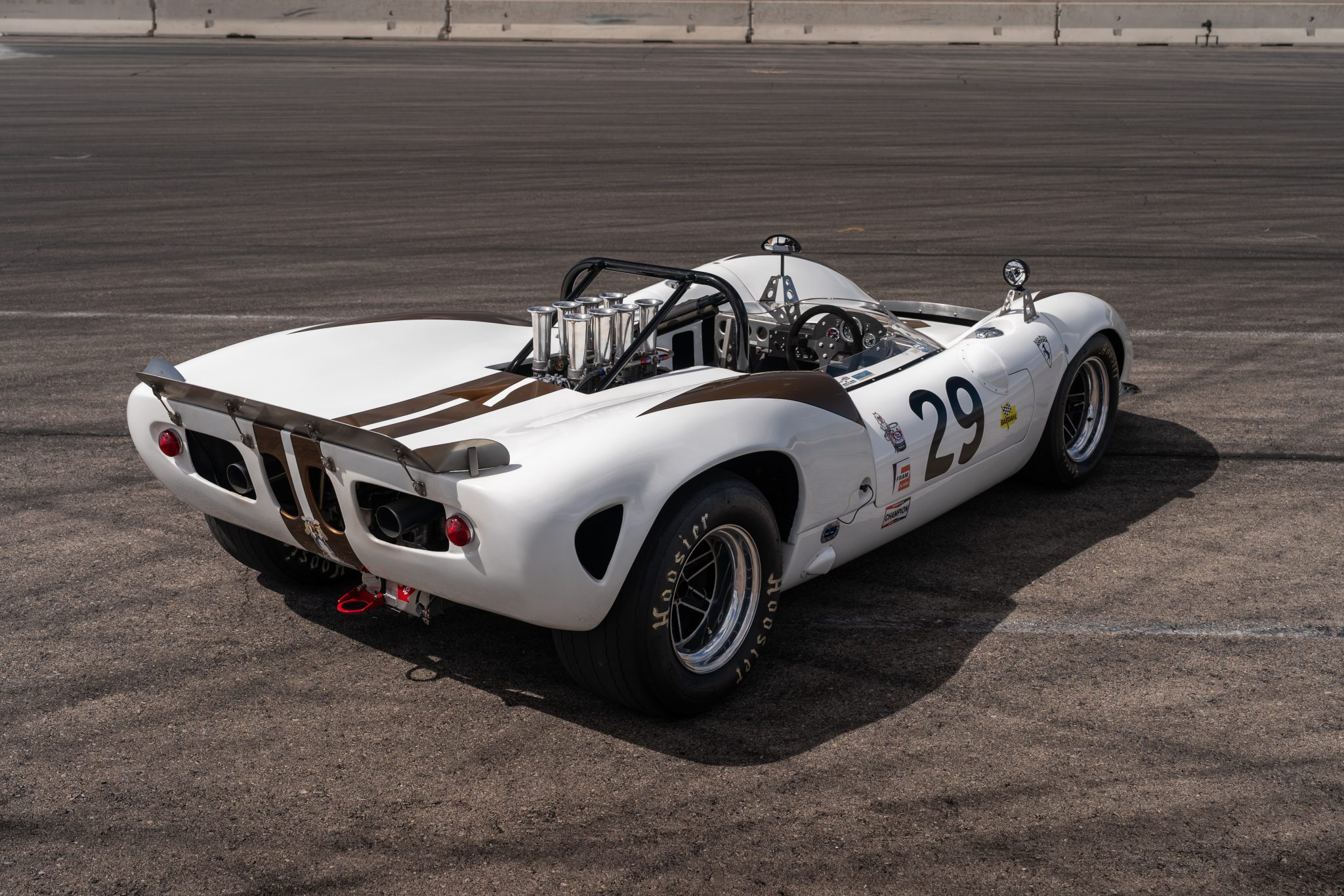 This example underwent a refurbishment in the early 2020s that included refreshing the McClendon tub and repainting the fiberglass body in white with gold stripes and flashes over its nose and haunches. Number 29 graphics adorn the nose and doors, and further exterior details include front and rear clamshells, faired-in headlights with covers, a wrap-around windshield, a pedestal-mounted side mirror, front and rear spoilers, and a single NACA duct behind the engine.