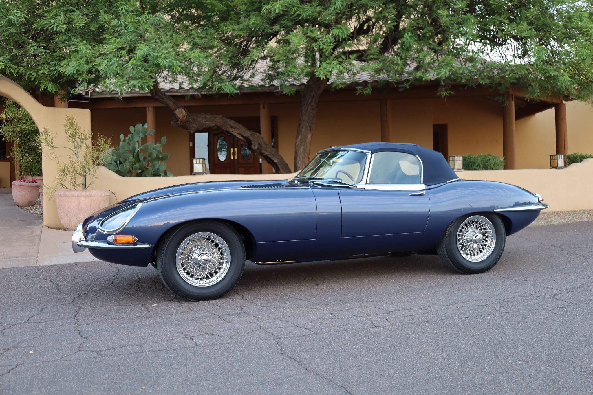 The 15″ wire wheels are secured by two-eared knock-offs and are mounted with 205/70 Bridgestone Ecopia tires. Braking is provided by four-wheel discs with inboard-mounted rear rotors. The brakes and four-wheel independent suspension were overhauled during the refurbishment.