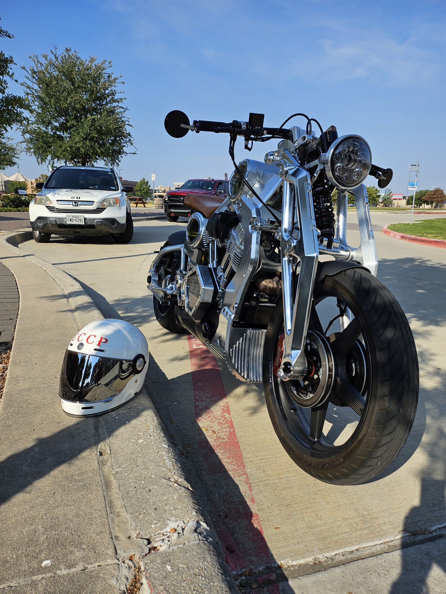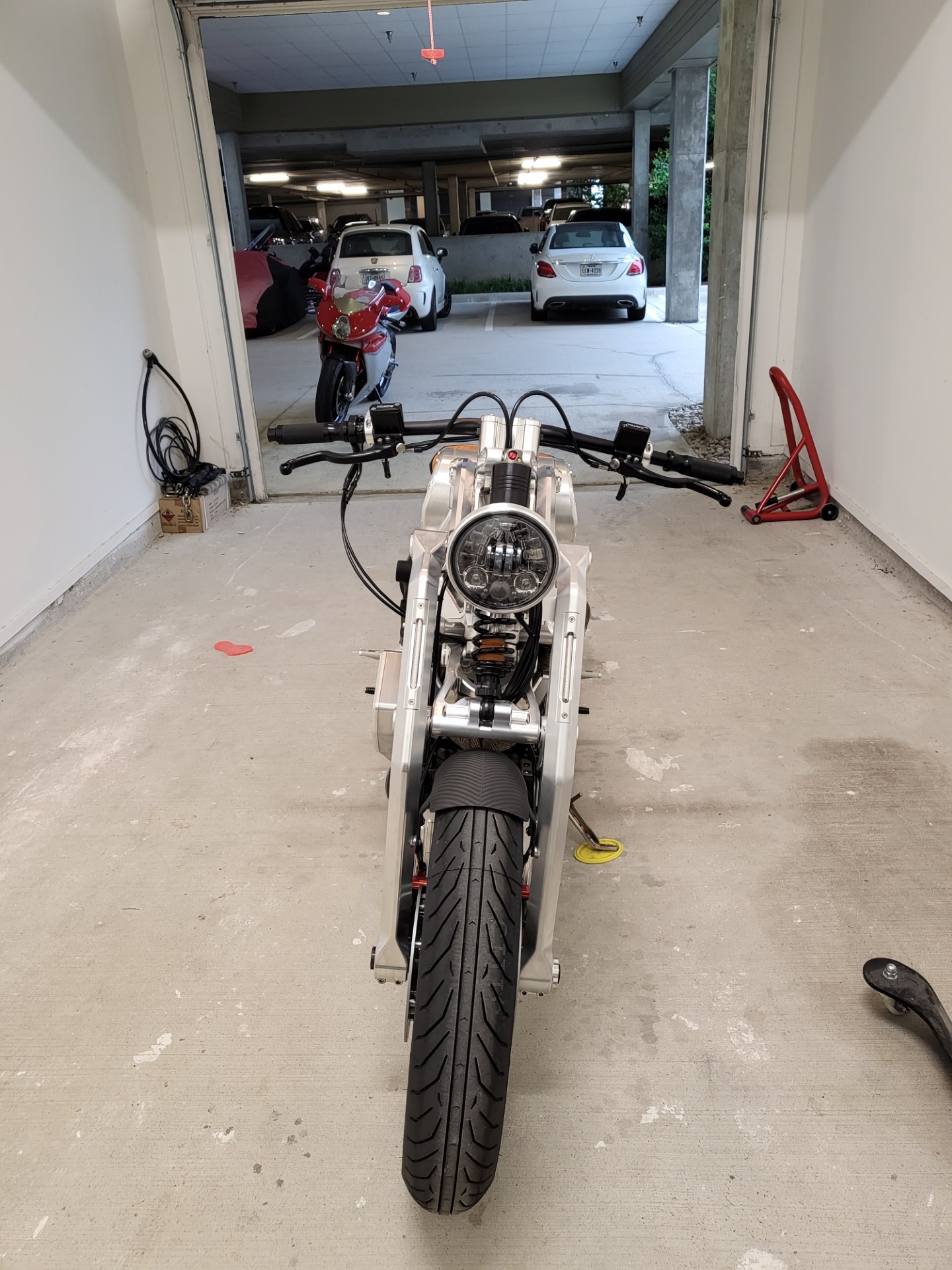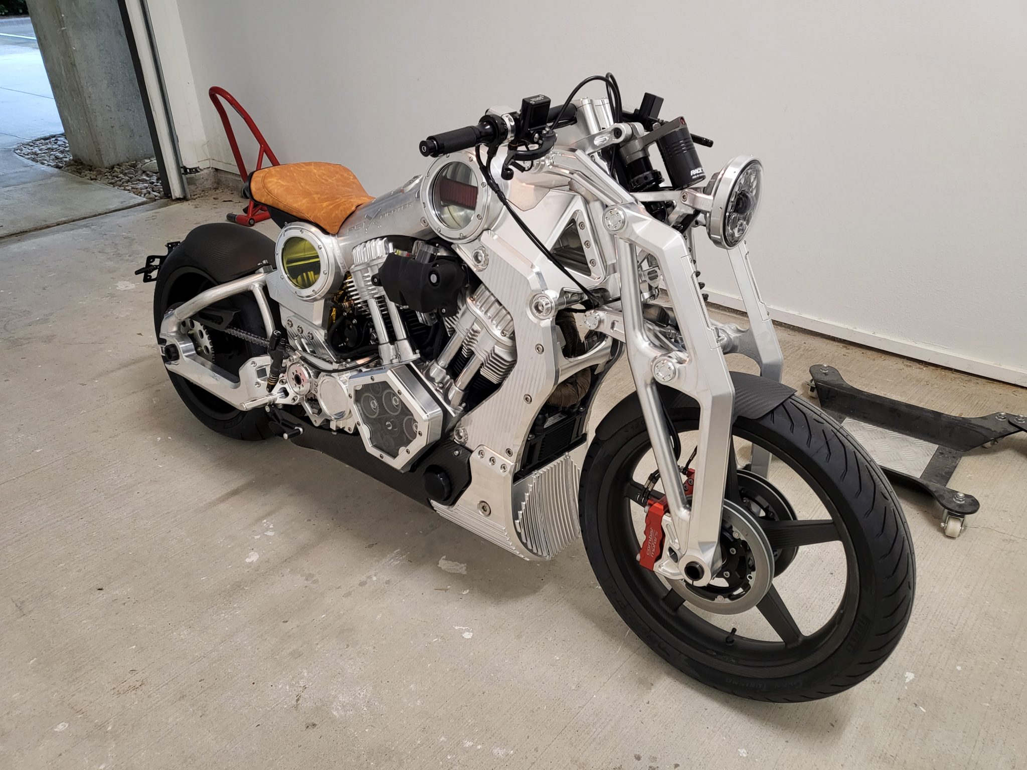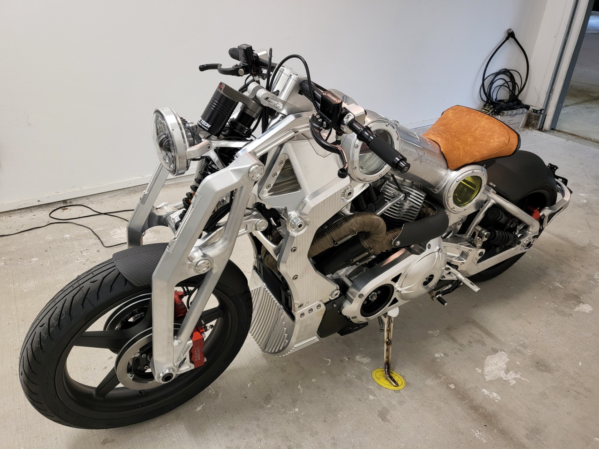 BST carbon-fiber wheels measuring 19″ up front and 17″ at the rear are mounted with Pirelli 120/70 Gran Turismo and Pirelli 240/45 Diablo Rosso tires, respectively. Suspension consists of an aluminum girder fork, a triangulated aluminum swingarm, and adjustable Race Tech monoshocks at both ends. Braking components include dual Beringer Aerotec 4D twin-disc rotors with radial-mounted three-piston calipers up front in addition to a slotted wave rotor with a radial-mounted caliper at the rear.