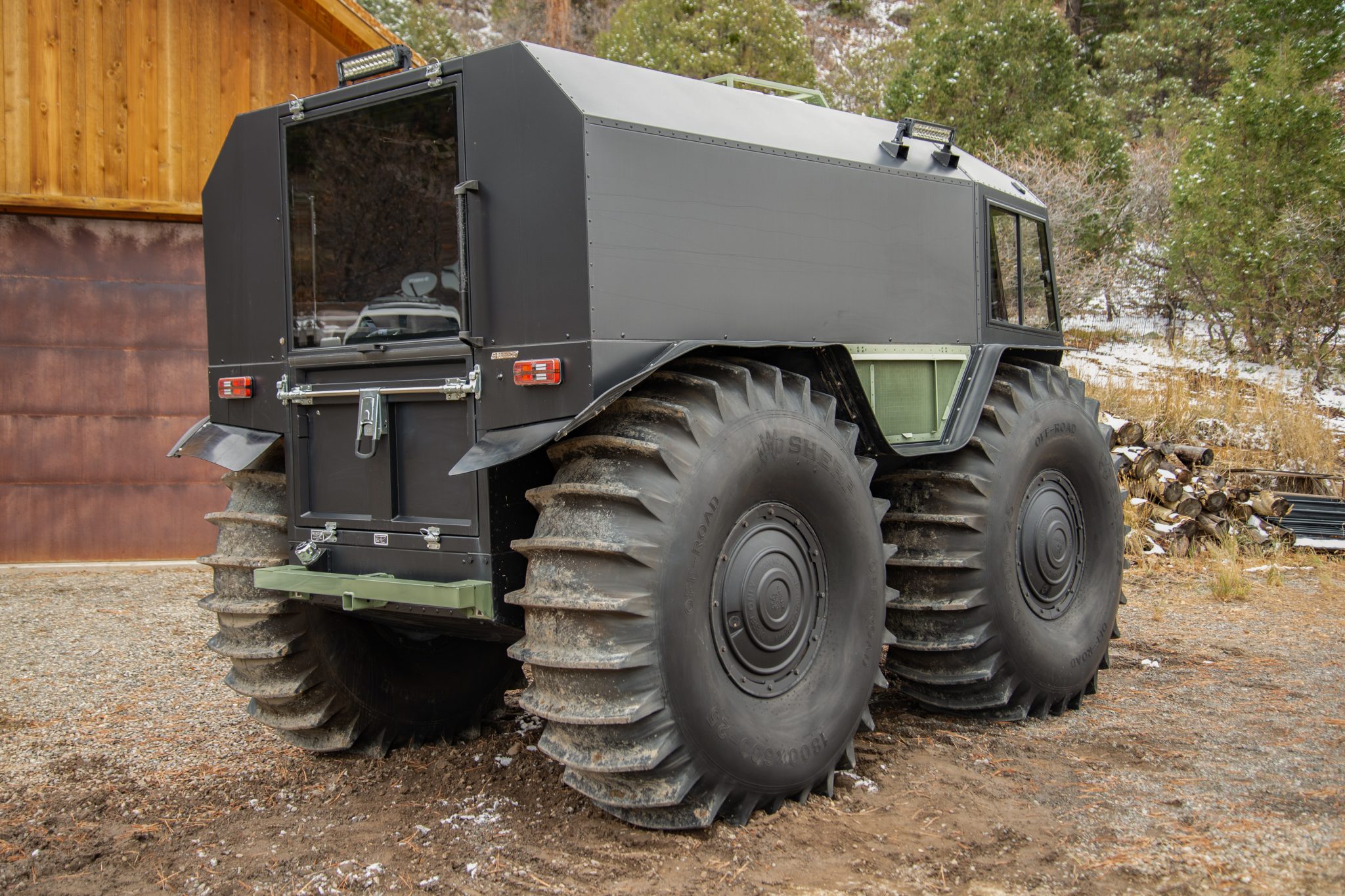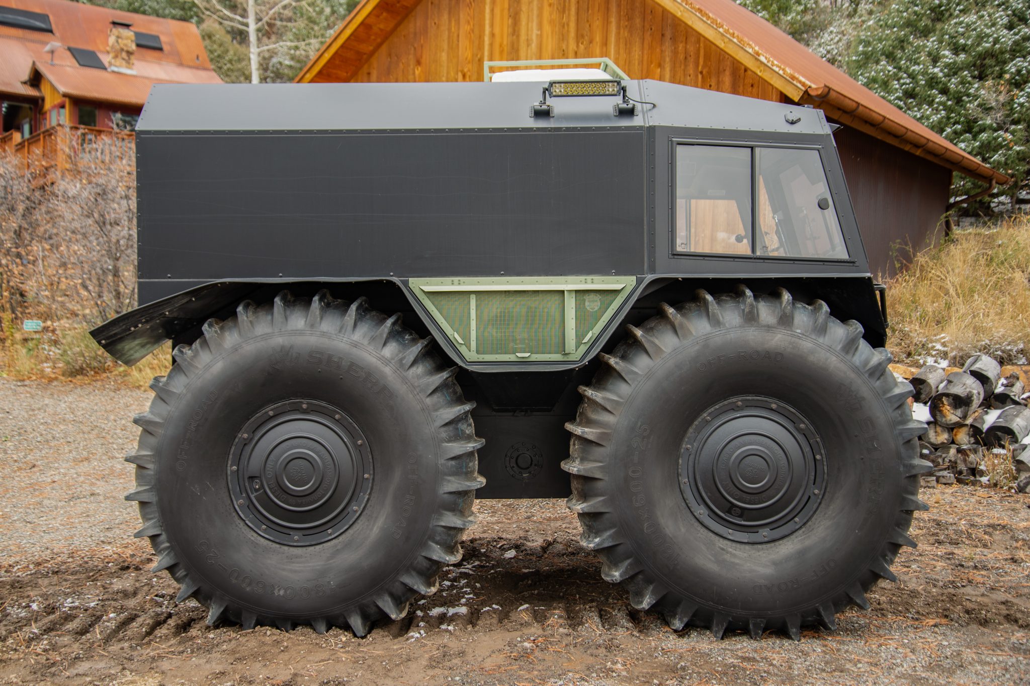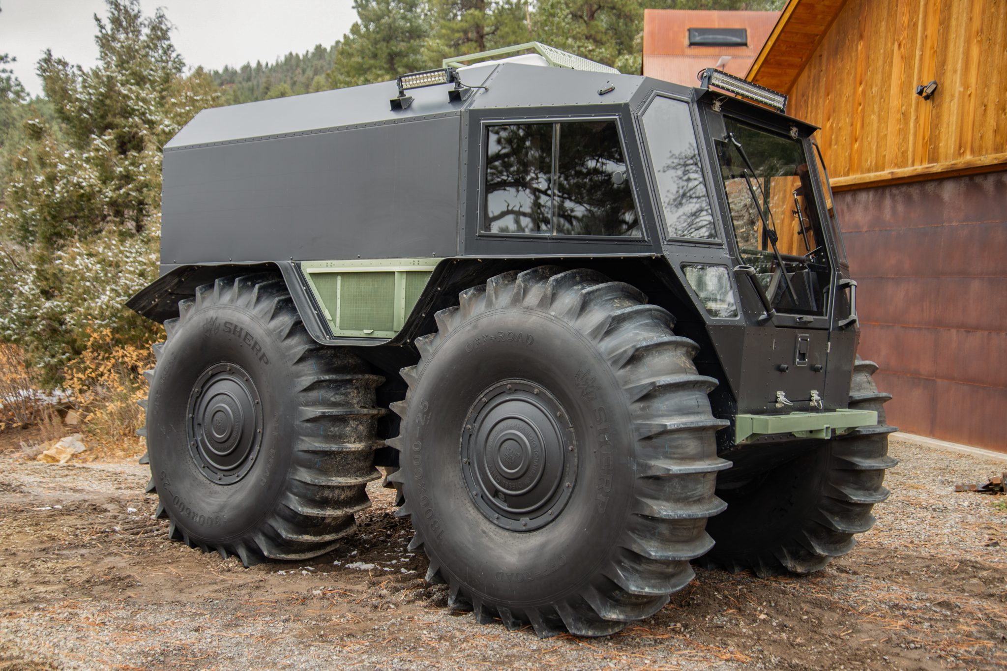 Black 25″ wheels are wrapped in 1800×600-25 Sherp-branded low-pressure tires that feature paddle treads and provide buoyancy and propulsion on water. The setup provides 23″ of ground clearance with the ability to climb or descend a 35-degree grade. Top speed is 25 mph on land and 3.7 mph on water. The vehicle is equipped with a central tire inflation system and 15-gallon auxiliary fuel containers in each wheel’s center.