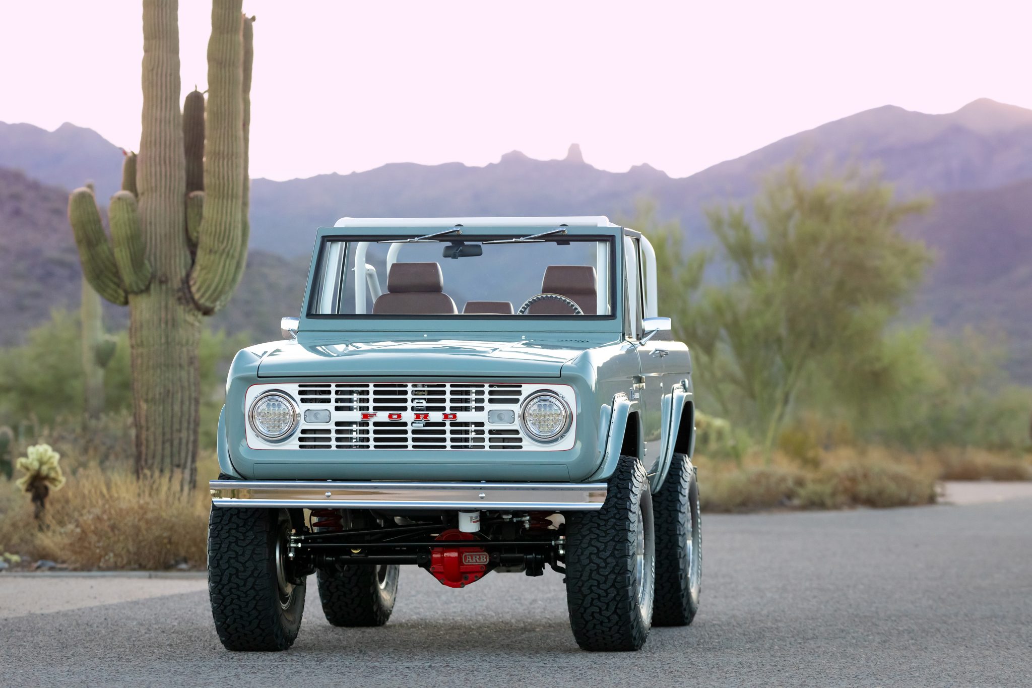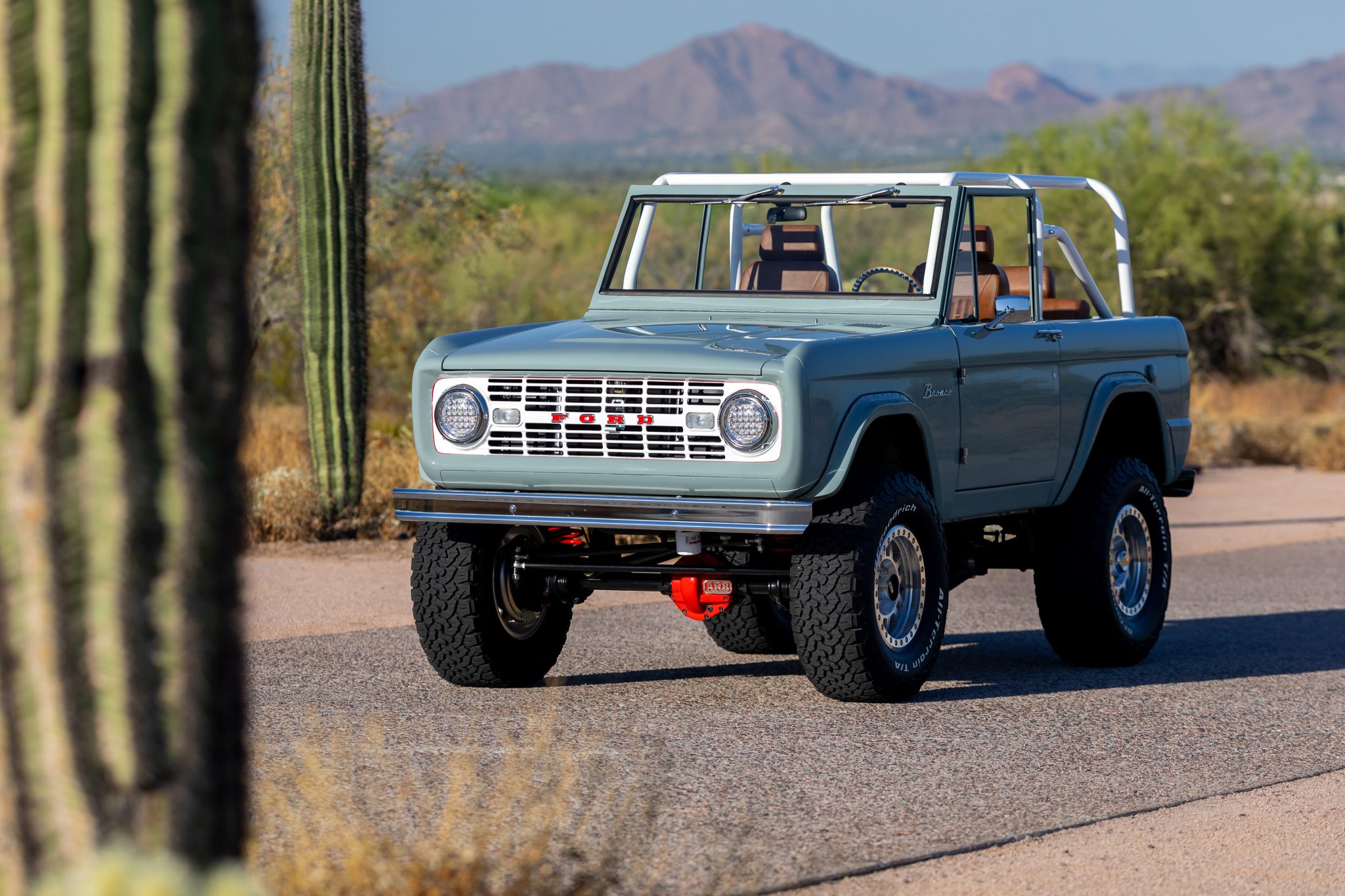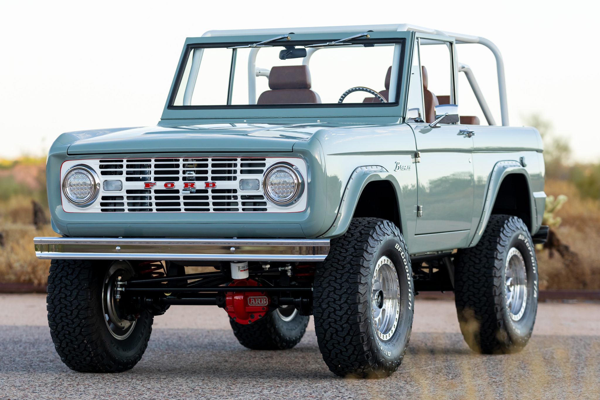 Beadlock-capable 17″ Vision Motorsports wheels are mounted with 35×12.50″ BFGoodrich All-Terrain T/A KO2 tires that show 2022 production date codes. The truck is equipped with a Borgeson power steering unit as well as a 3″ body lift and a 2.5″ suspension lift with dual shocks at each corner. Braking is provided by a hydroboost system with four-wheel discs.