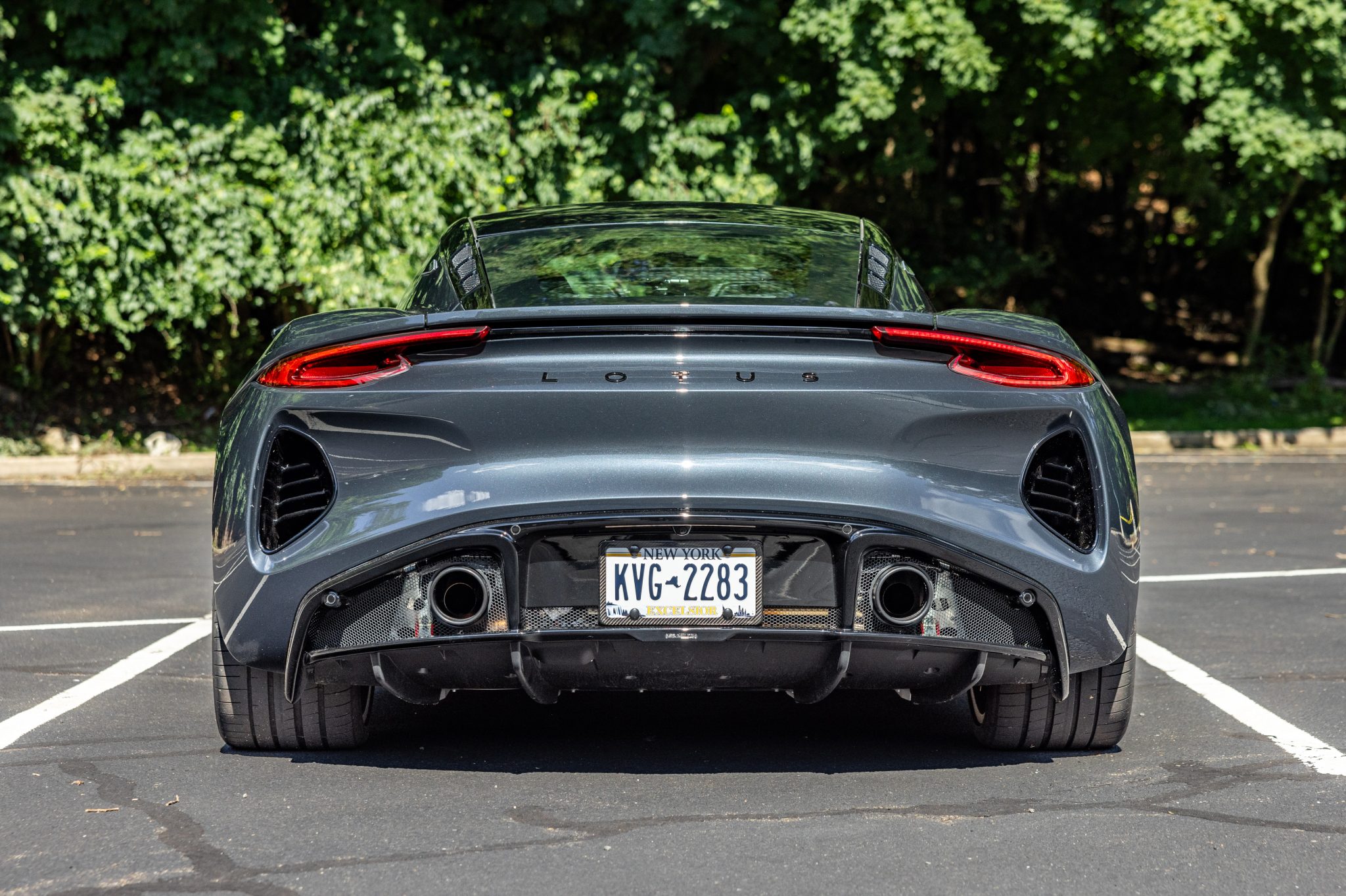 This example is finished in Shadow Gray Metallic (M503) with the Black Pack, which added a gloss-black roof panel, rear Lotus badging, mirror caps, and tailpipe finishers. Additional exterior details include a rear fog light, parking sensors, rain-sensing windshield wipers, First Edition badging, dual exhaust outlets, and LED headlights and taillights.