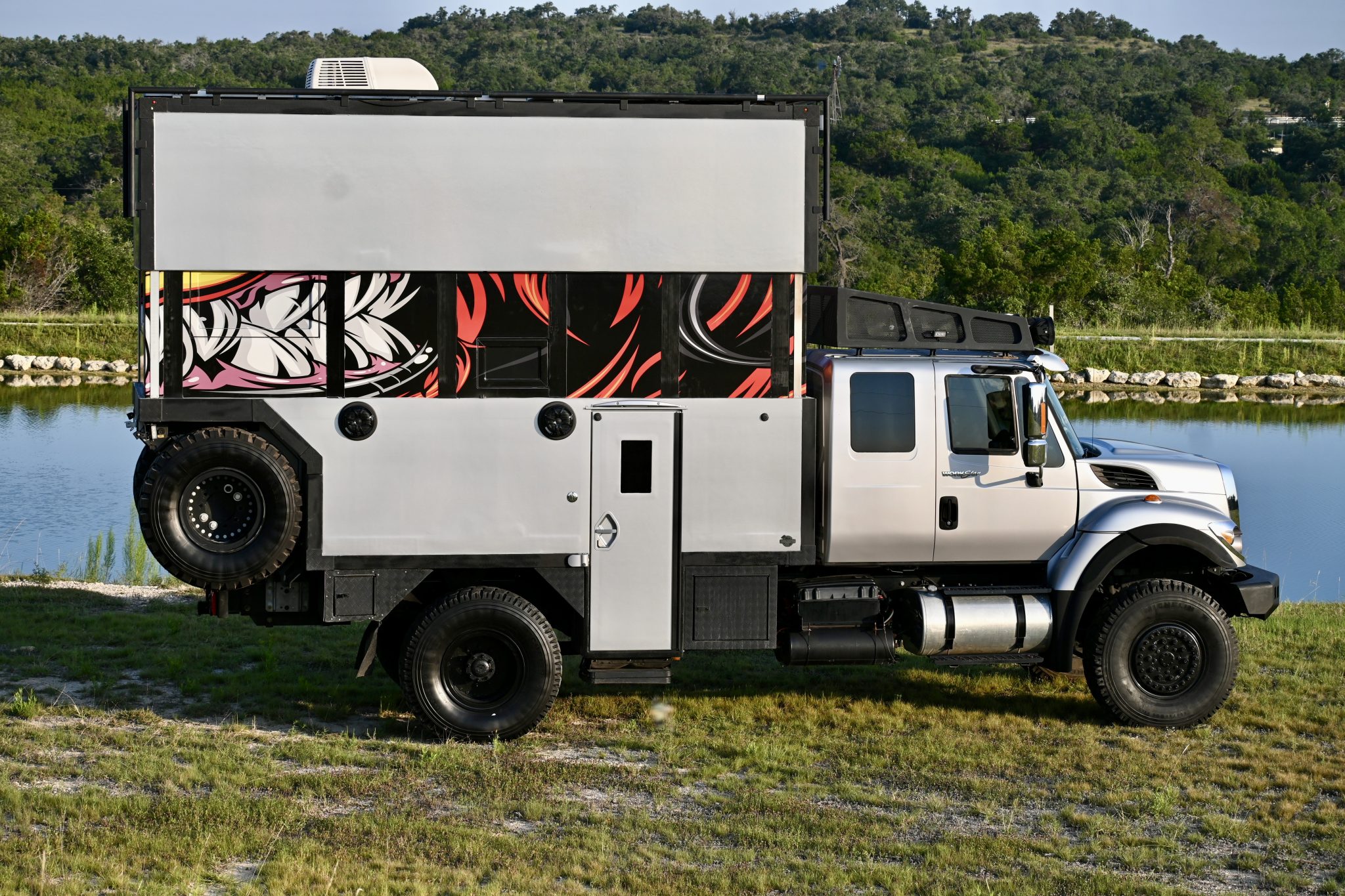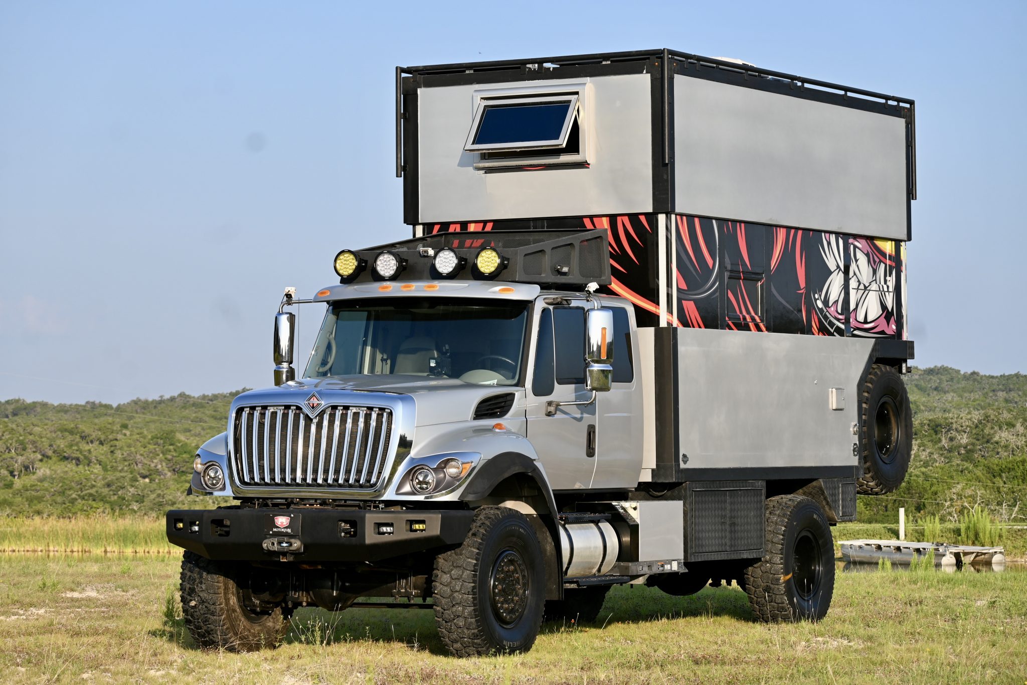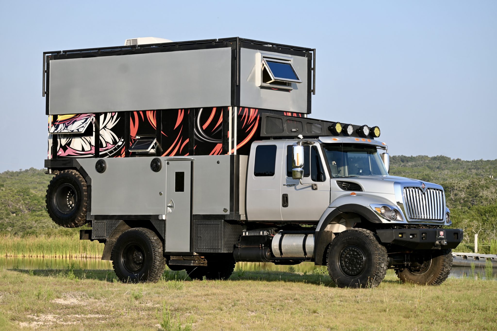 Black 17″ alloy wheels are mounted with 395/85 Michelin X, and two spares are secured to the back of the camper. The truck rides on leaf springs and solid axles.