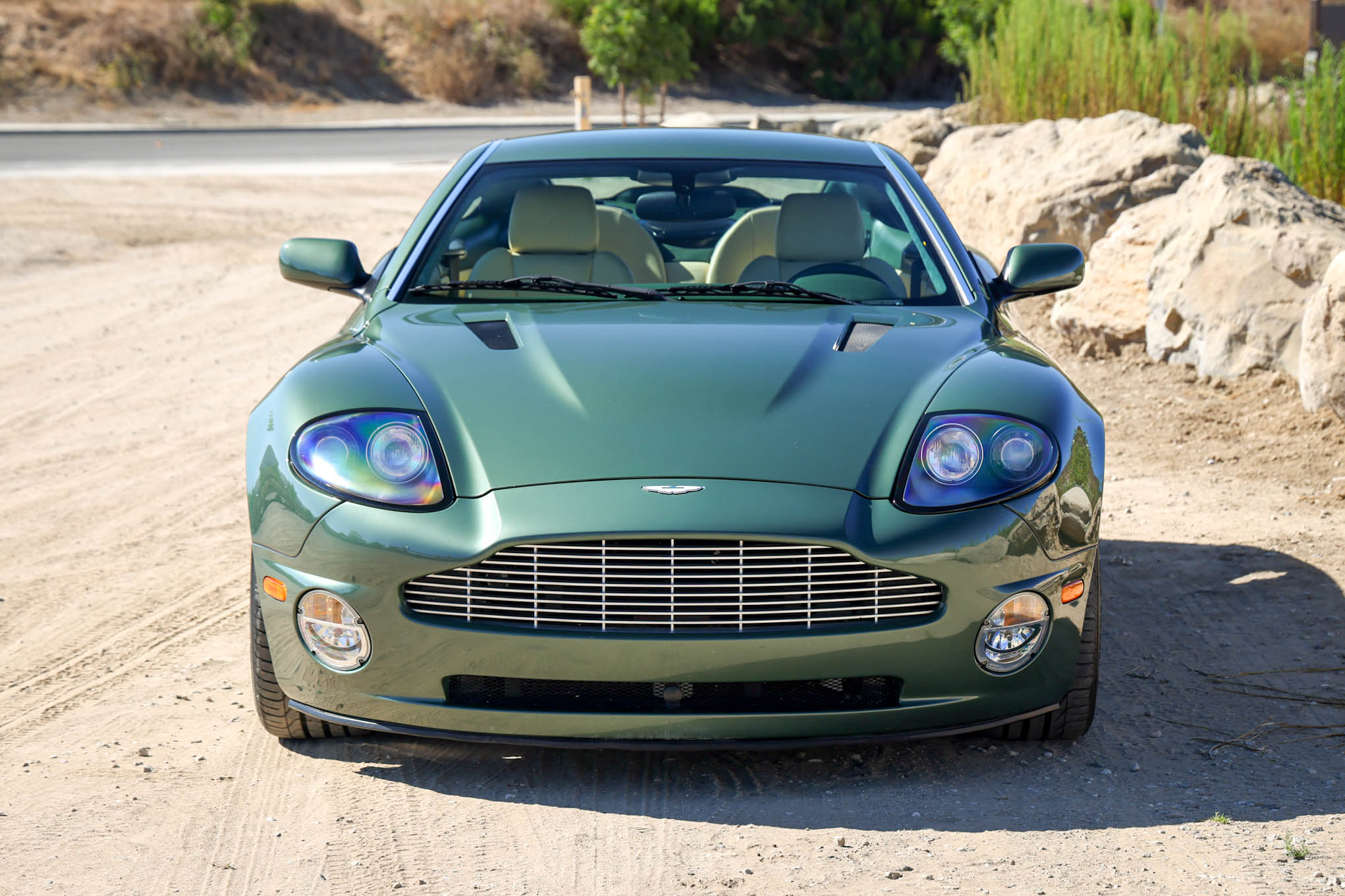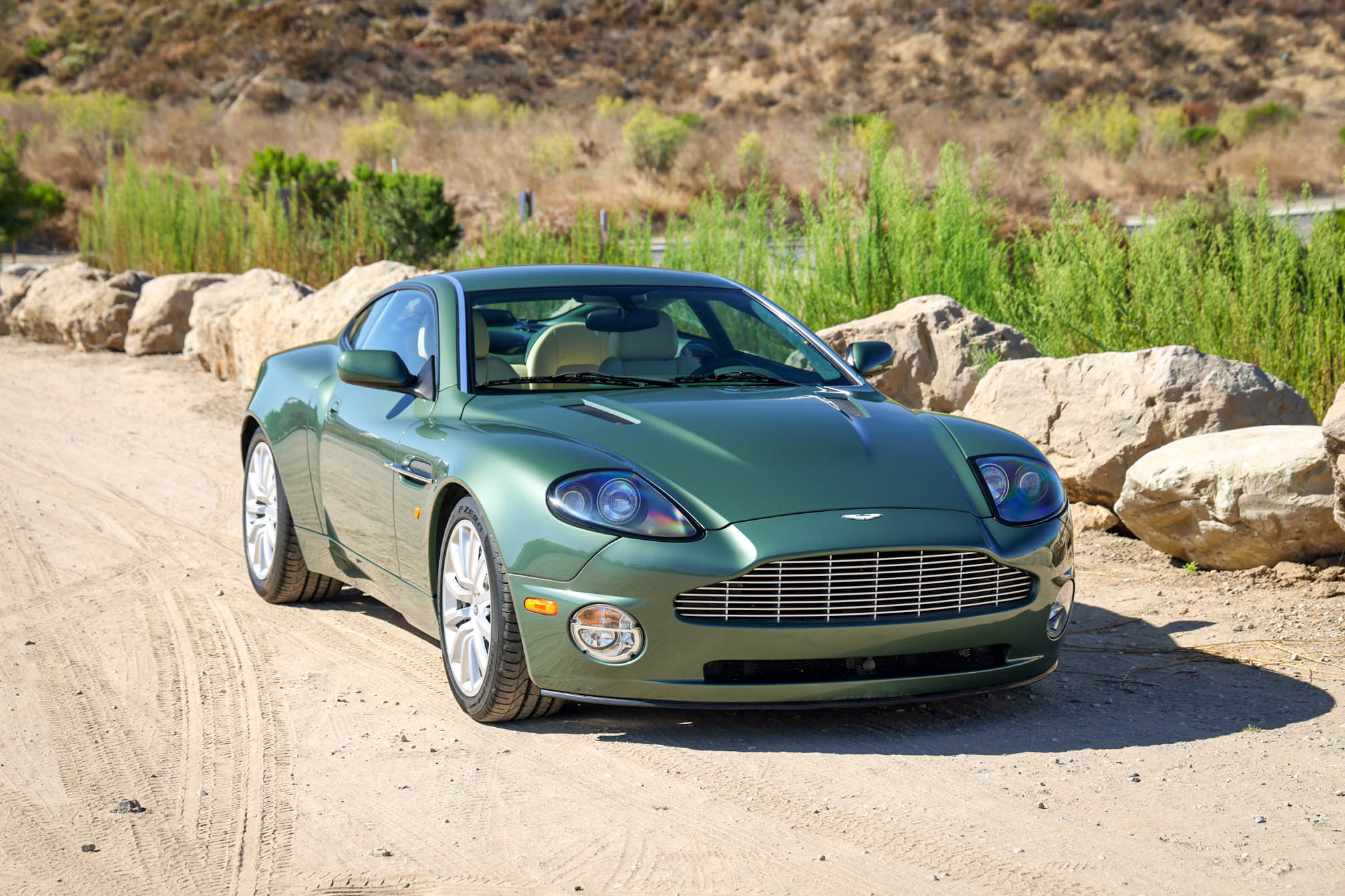The 19″ 12-spoke alloy wheels are mounted with Pirelli P Zero tires measuring 255/40 up front and 285/40 out back. Curb marks are noted on the right-front wheel. Stopping is handled by gray-finished Aston Martin-branded calipers over cross-drilled and ventilated rotors at all four corners. The rear toe links and sway bar end links were replaced in May 2021.