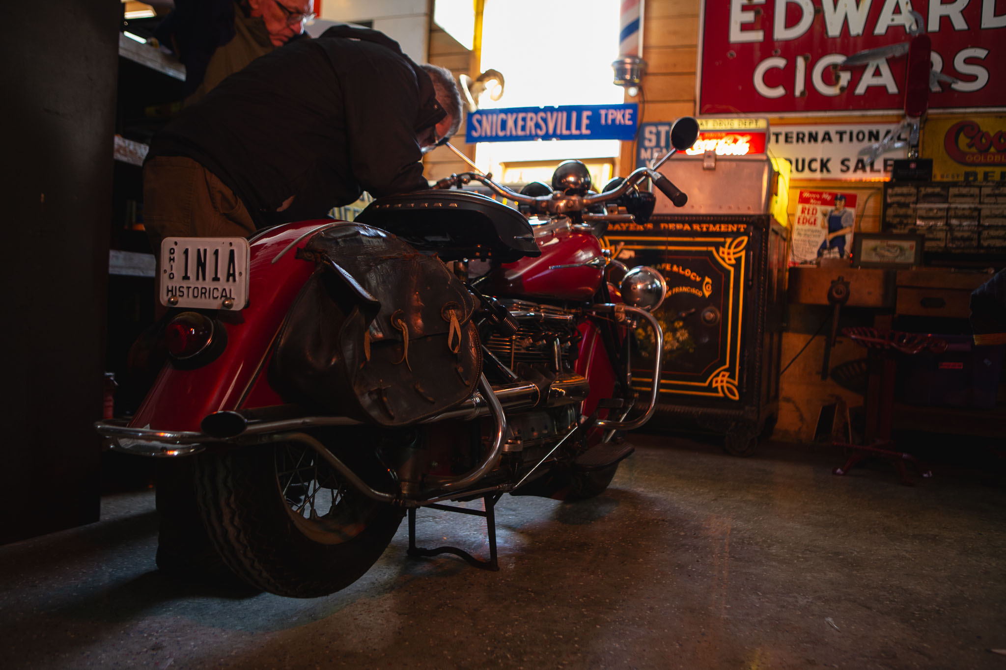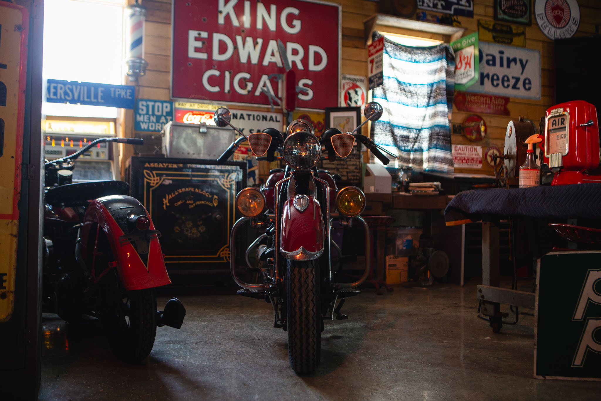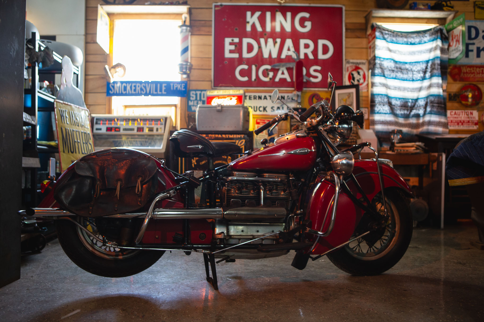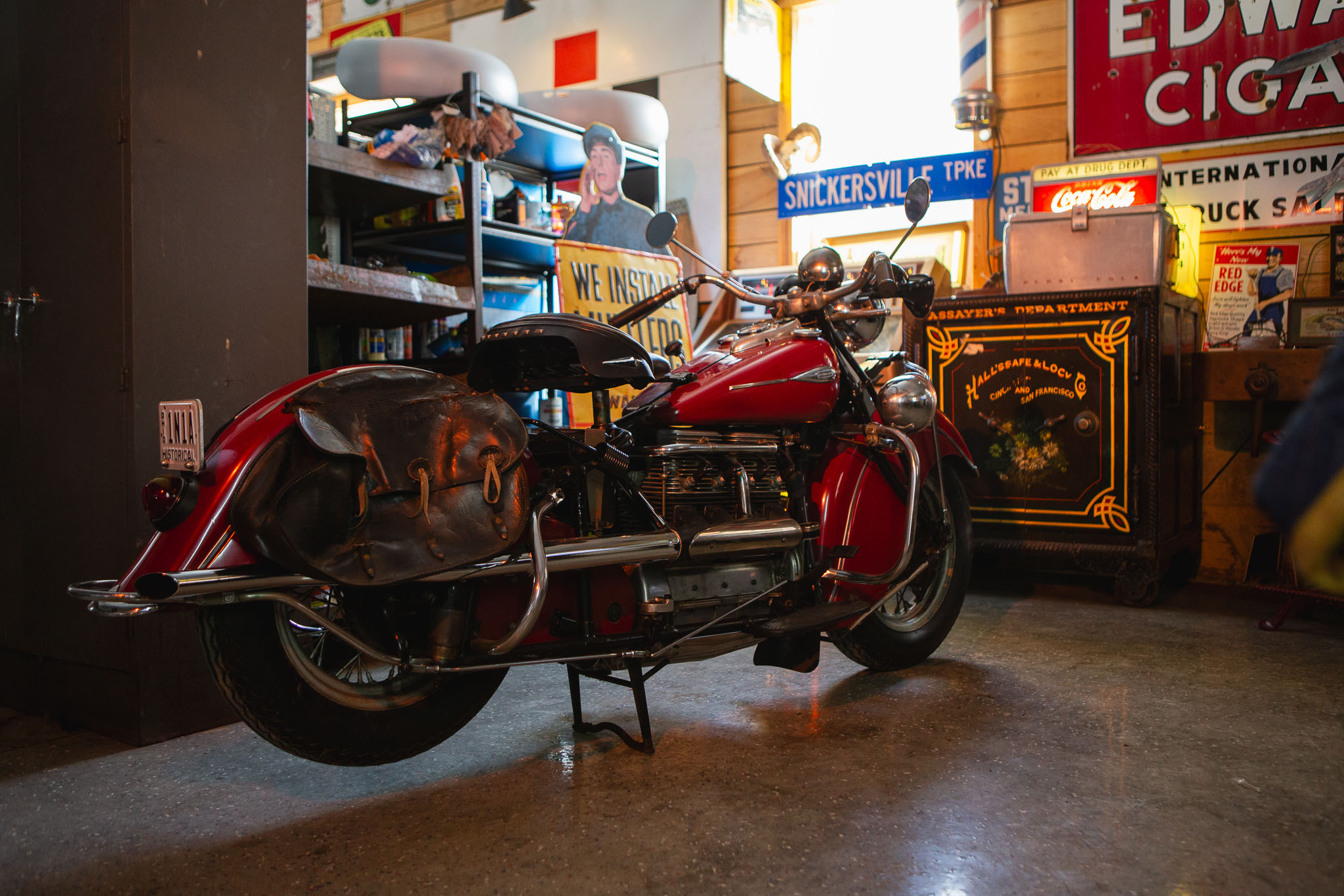 Silver-finished 16″ rims are laced to drum-brake hubs and mounted with Arco tires. Suspension consists of a leaf-spring trailing-link fork as well as a set of plunger shocks at the rear.