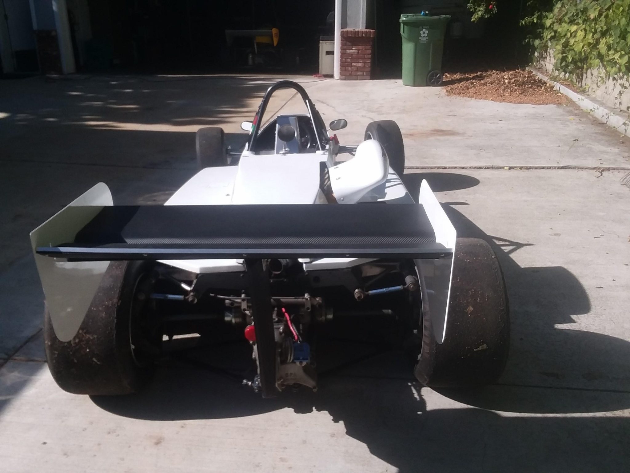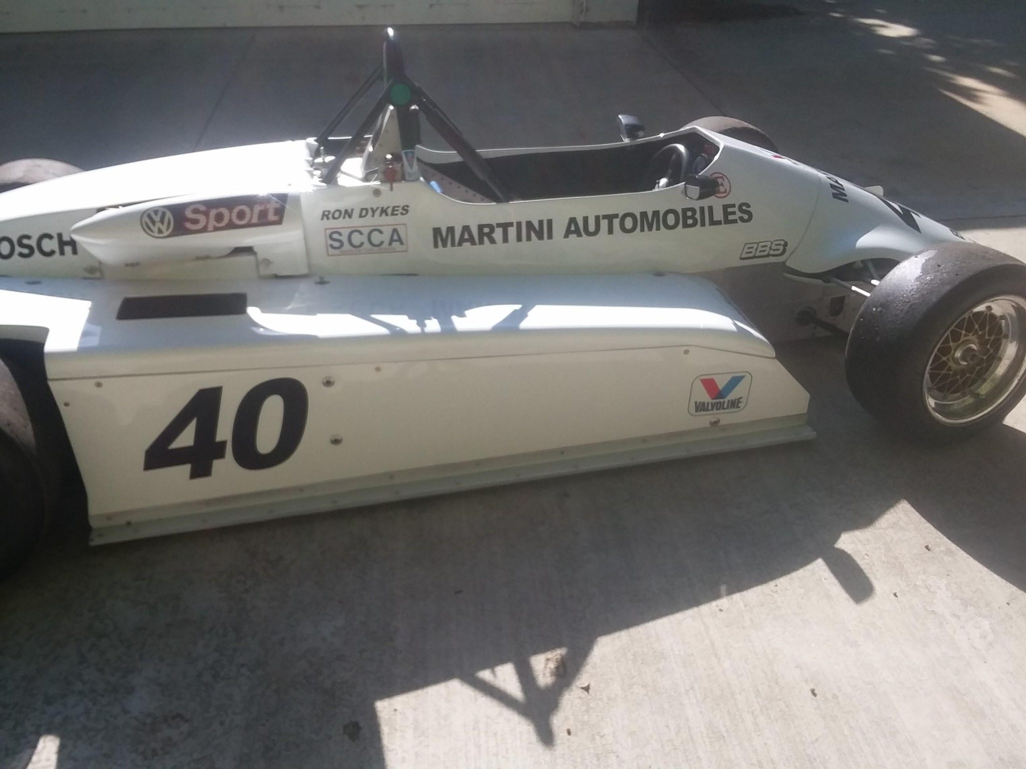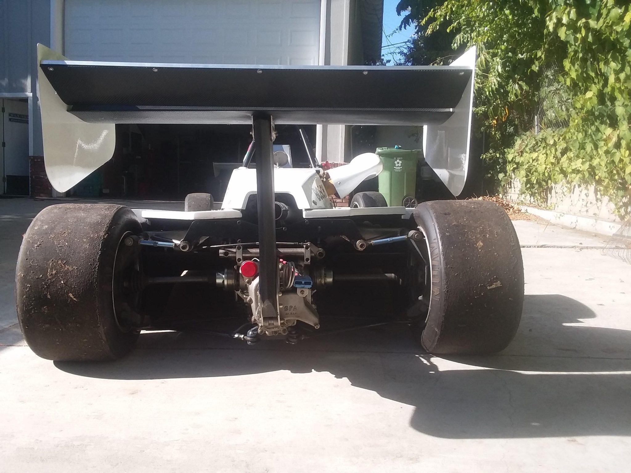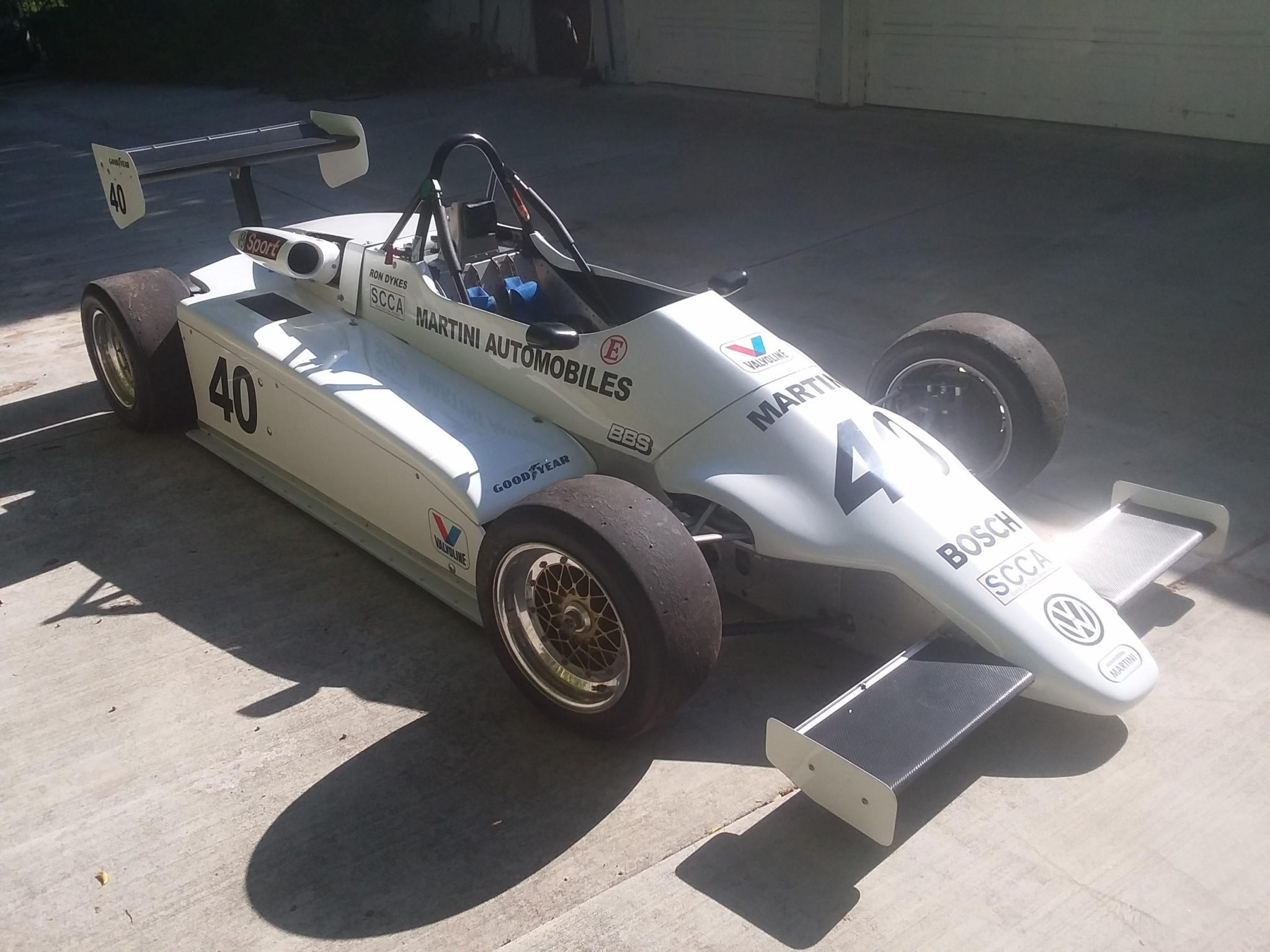 BBS center-lock wheels have gold center sections and polished lips, and they are mounted with Avon racing slicks. The car rides on a pushrod front suspension, a cantilever rear setup, and inboard-mounted Bilstein dampers with Eibach springs all around. The four-wheel disc brakes are squeezed by four-piston calipers all around.