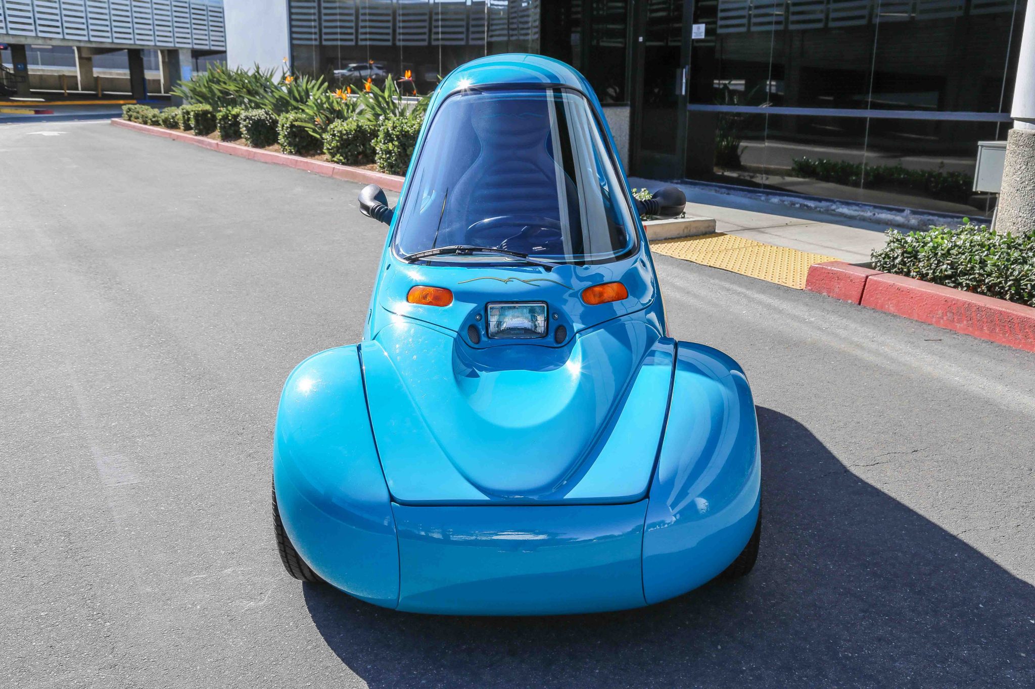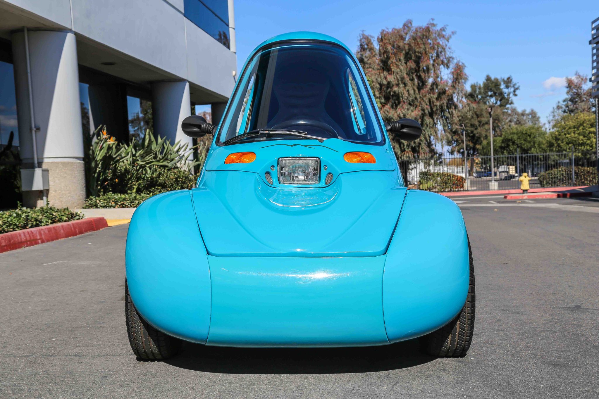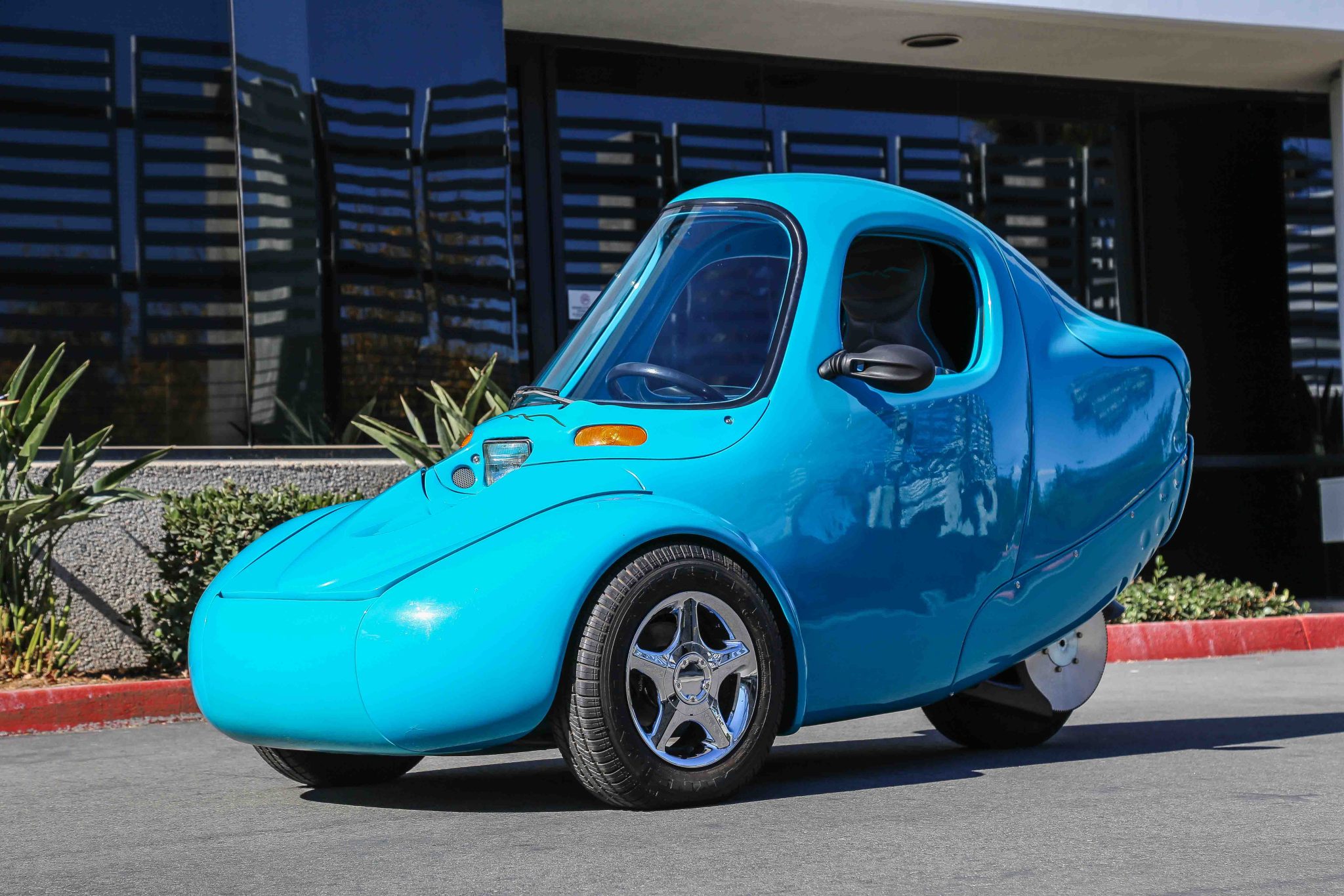 Chrome-finished 13″ five-spoke wheels are wrapped in 155-series Wynstar Phaser R23 tires. Suspension consists of double A-arms up front and a single-sided swingarm at the rear with coilovers at each wheel. Braking is from three-wheel discs with Wilwood calipers.