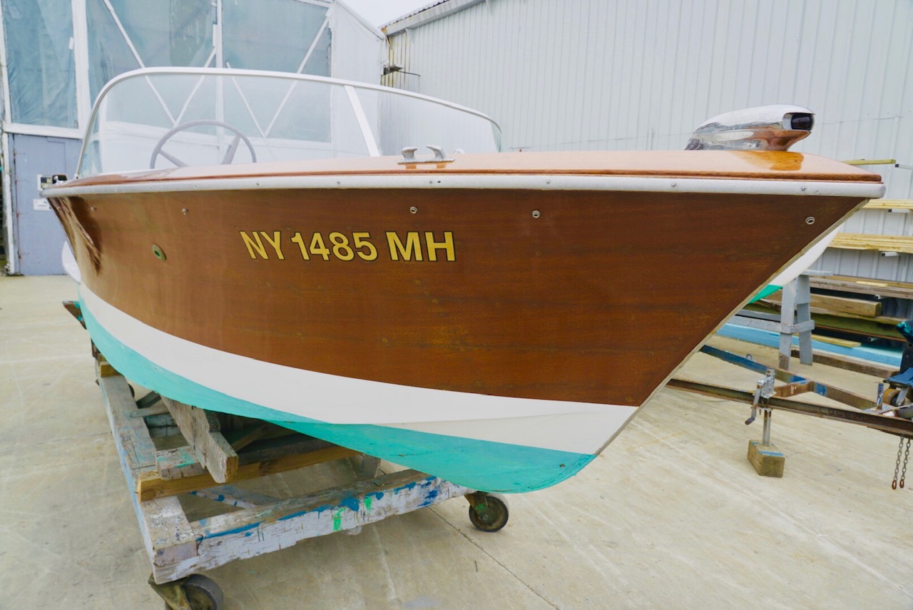 The boat features a two-piece wraparound windscreen, and the seller describes pitting in the windshield frame and other chrome trim. Repairs to the running and navigation lights were performed in 2015. The boat has a beam of six feet, eight inches and draws fifteen inches according to the included inspection report.