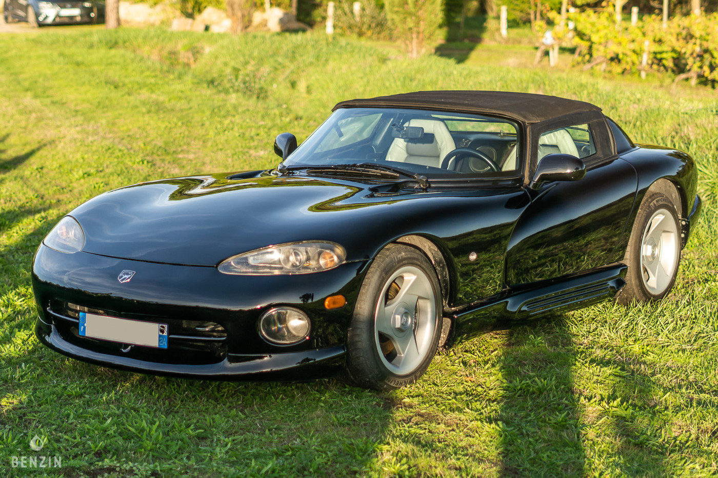 On the outside, this Dodge Viper is in excellent condition. The black paint looks very good and shows no noticeable flaws. The front bumper and the rocker panels have been repainted to correct some gravel chips. The fiberglass bodywork shows no dents, and there is no corrosion on the chassis. The seller indicates that the car has never been in an accident. The seals and exterior plastics are in very good condition, as are the headlights. The retractable roof is new (canvas and frame).