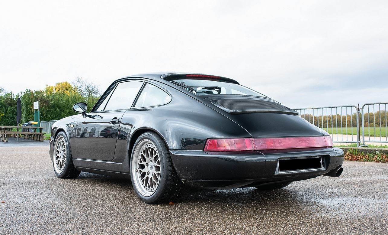 On the outside, this 964 is in very good condition. The paint, redone in the past, looks very good and shows no noticeable flaws except for a small trace of rubbing on the left front. A slight crack on the firewall is to be noted. The bodywork is free of dents, and no corrosion is to be reported except for a few spots on the front right and rear windshield bay. The exterior plastics and seals are in excellent condition. The car is equipped with a functional and waterproof electric sunroof. White turn signals and repeaters as well as a spoiler with 3rd brake light have been installed.