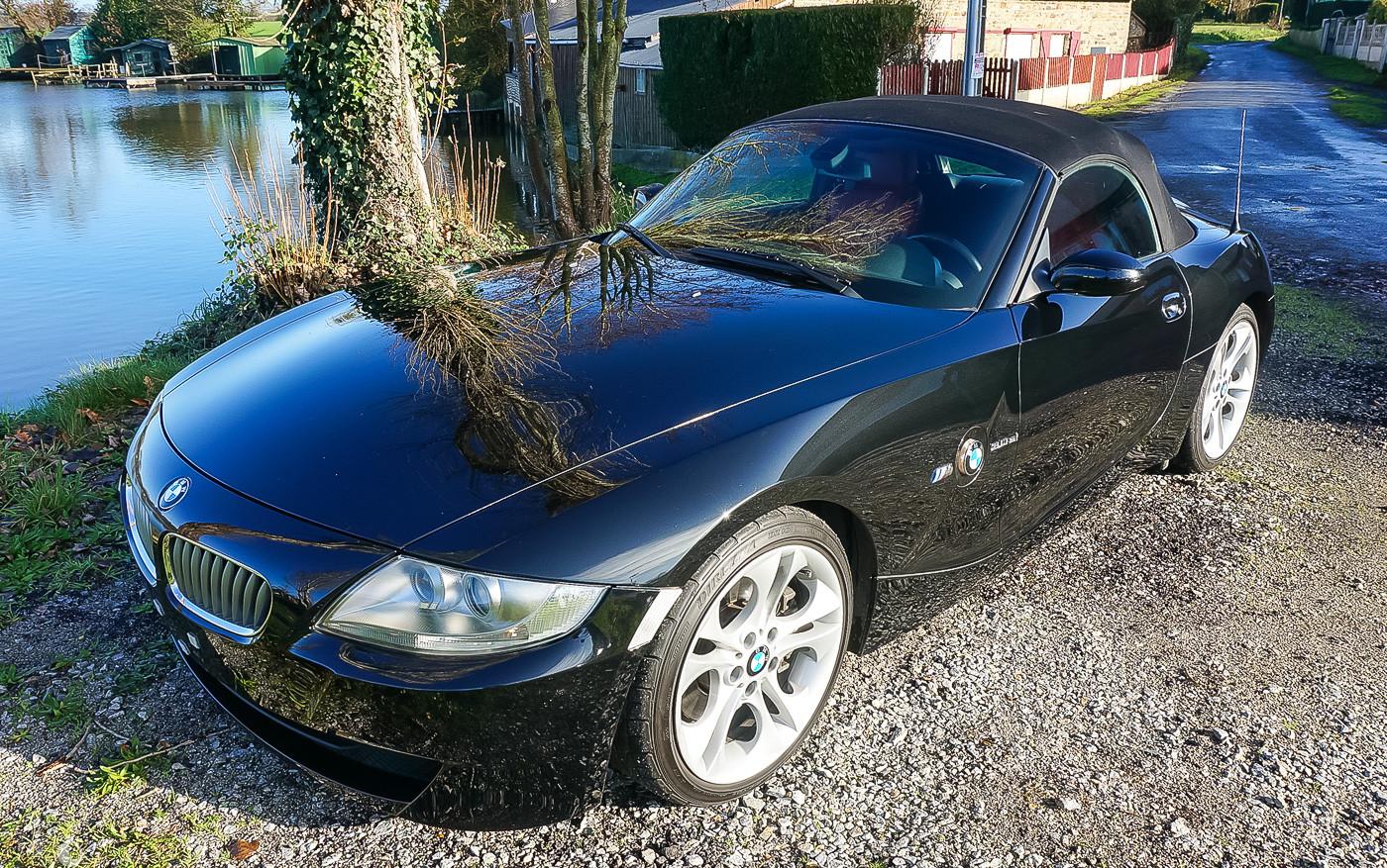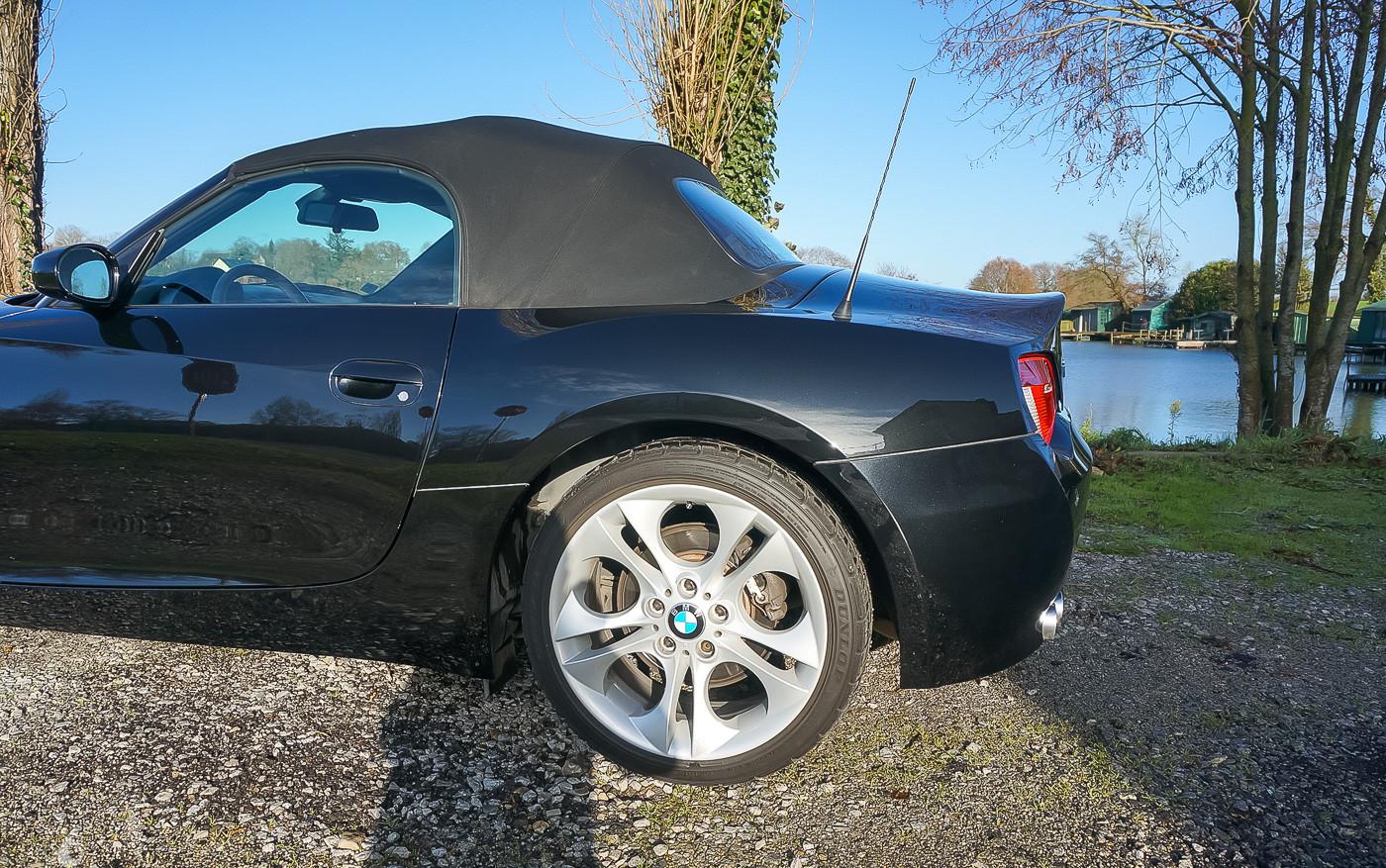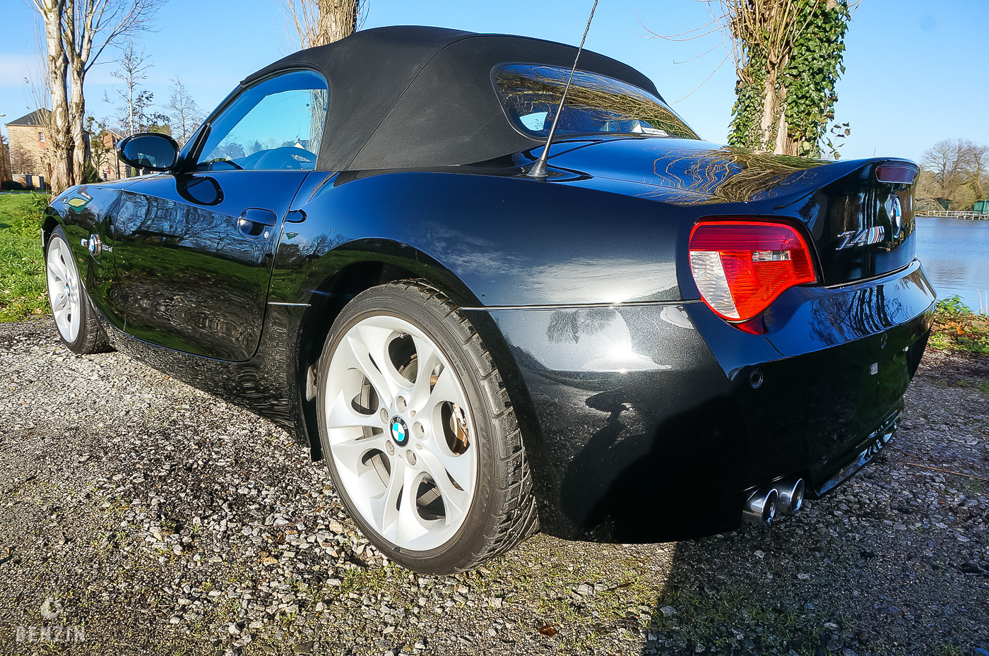 On the outside the car is in very good condition. The paint in its Saphir Noir Métallique (475) color has no defects. The exterior plastics and seals are in very good condition, as are the headlights. The seller specifies that the vehicle has benefited from a complete body detailing (polishing, shining and protection). The seller indicates that this BMW is rust free. The soft top does not leak and is in excellent condition, the soft top motor has been replaced and the hydraulic system has been made reliable. On the outside, this Z4 is equipped with xenon headlights, M -sport suspensions, electrically folding side mirrors, reverse parking sensors (PDC), white turn signals and an alarm.