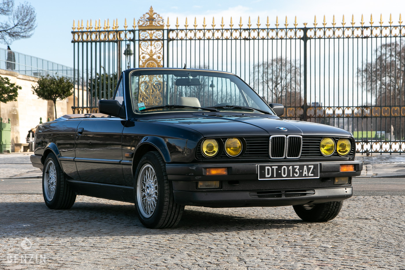 On the outside, the car is in very good condition. The original paint in its black "diamondschwarz metallic" color has only a few visible defects in the gallery. The chrome and the seals are in good condition. Only the windshield contour has yellowed and the seal of the left rear window is slightly cracked. The bumpers have some rubbing marks visible in the gallery. The seller indicates that this 325i is free of corrosion, pictures of the underbody are visible in the gallery. The soft top is waterproof and functional, but there is a small repair on the left side and some rubbing marks on the driver window (see gallery). The rear window is tarnished. A BMW hard top is offered by the seller at the end of the auction.