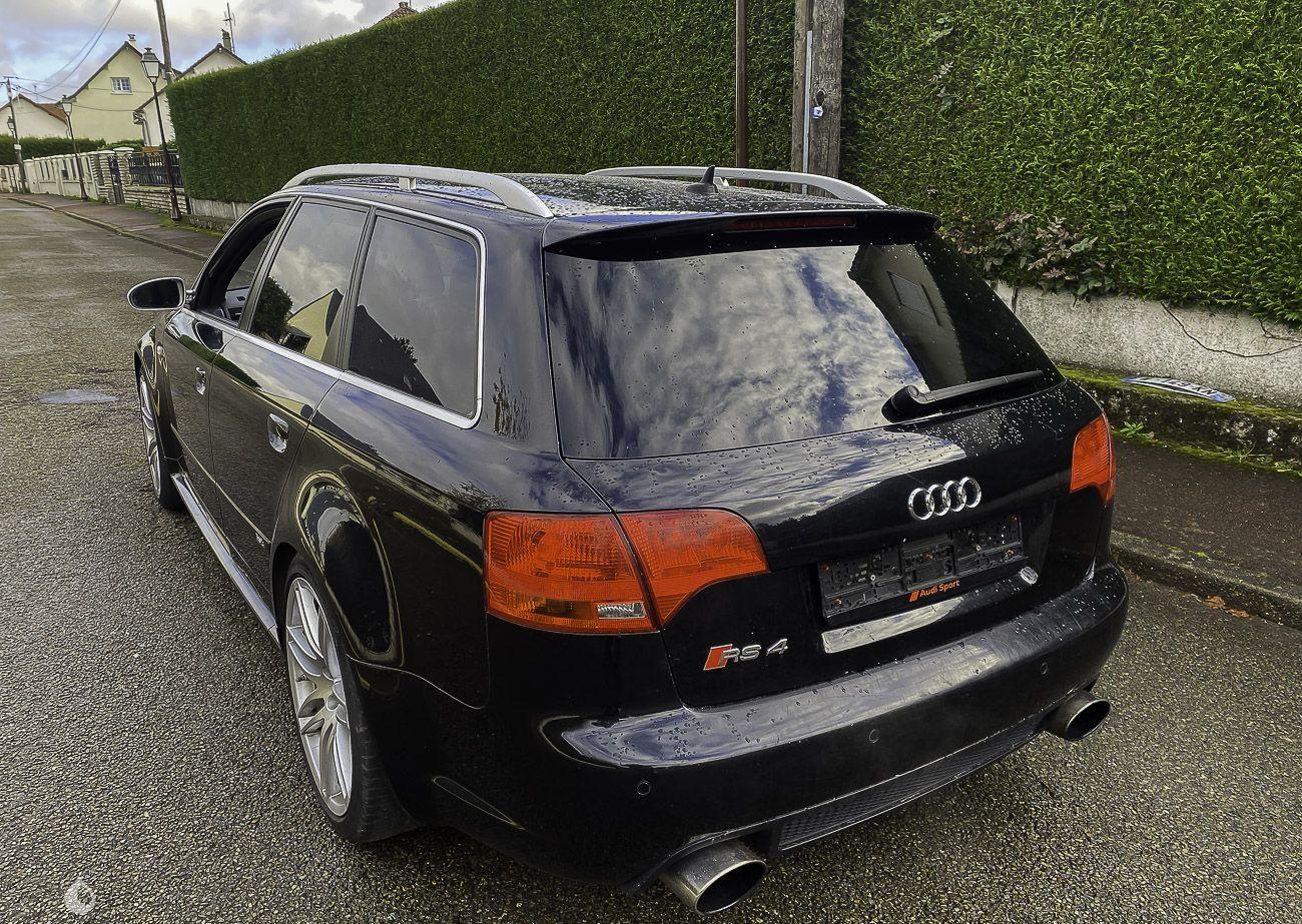 On the outside, the paint in its Black color shows some visible defects in the gallery. The exterior plastics and seals are in good condition, as well as the headlights. The seller indicates that the chassis of this Audi RS4 is sound, pictures of the undercarriage are available in the gallery.