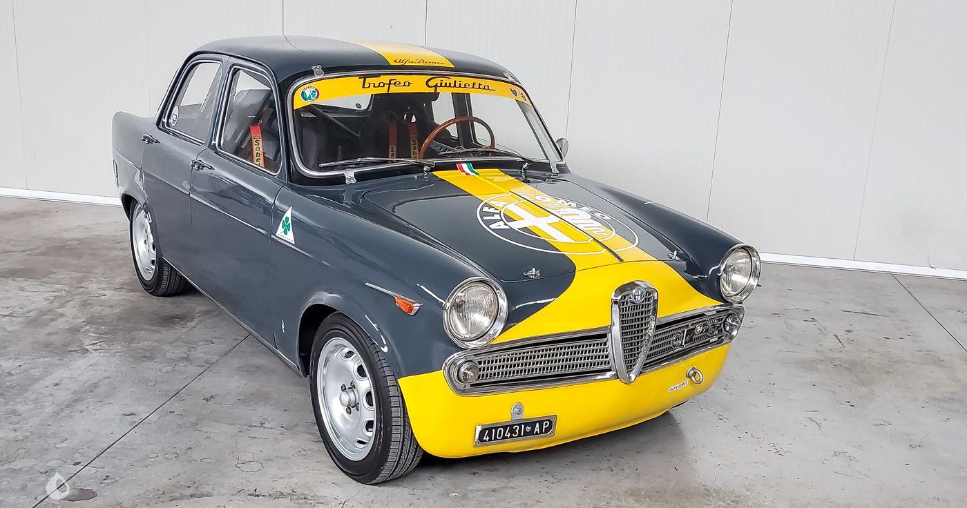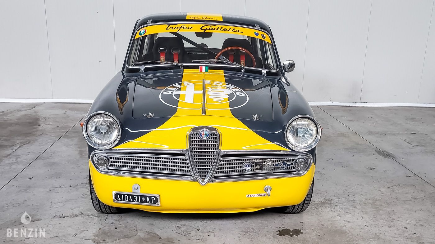 On the outside, the car is in good condition. The paint in its grey and yellow color has only very few visible defects in the gallery. The exterior plastics and seals are in very good condition, as are the headlights. The side and rear windows are in plexiglass. The seller indicates that this Giulietta is free of corrosion, pictures of the underbody are visible in the gallery.