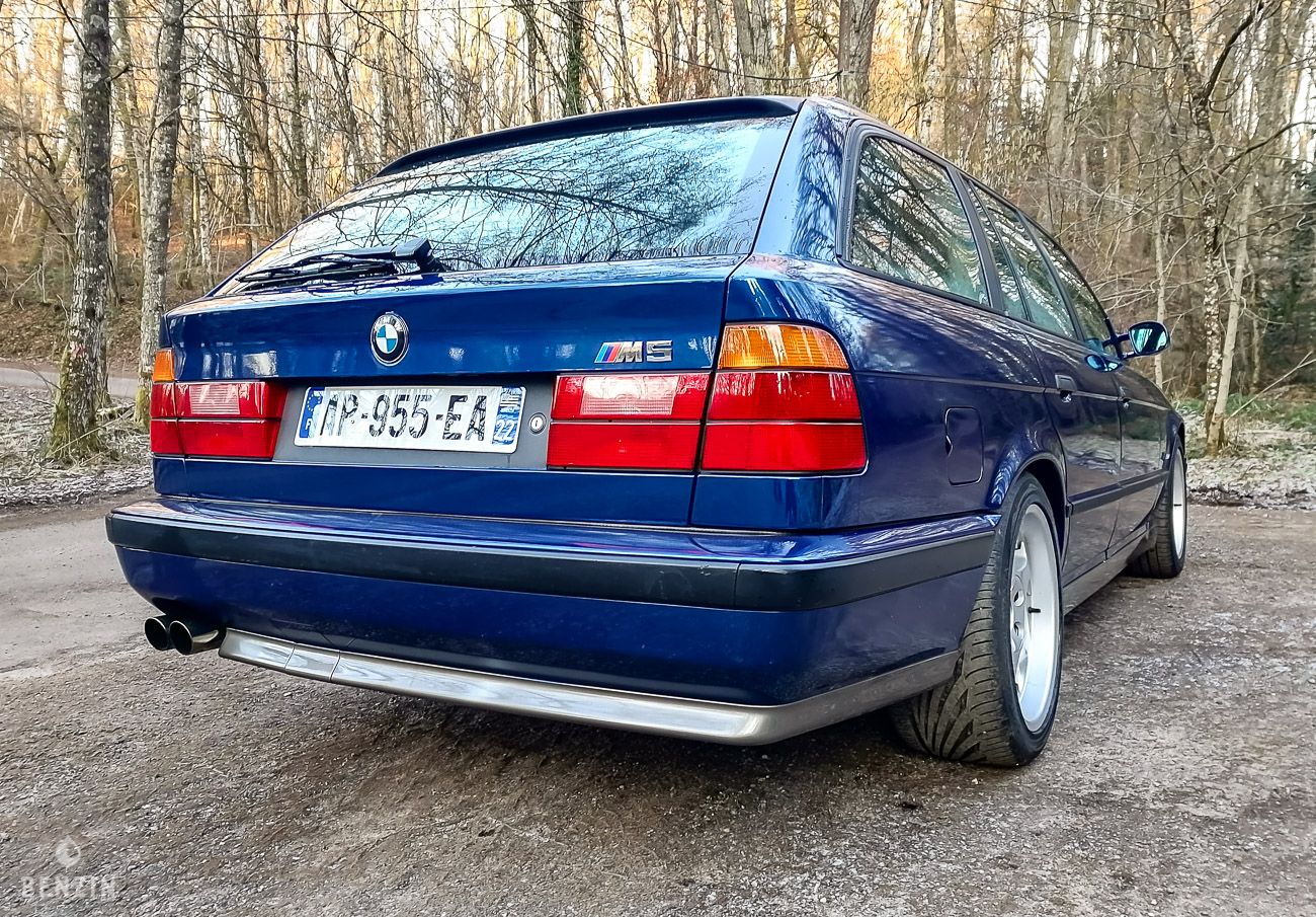 On the outside, the car is in very good condition. The paint in its Avus blue color (276M) has only a few visible defects in the gallery. The exterior plastics and seals are in good condition, as are the headlights. The seller indicates that the chassis of this M5 Touring is sound, pictures of the undercarriage are available in the gallery. The original turn signals are available.