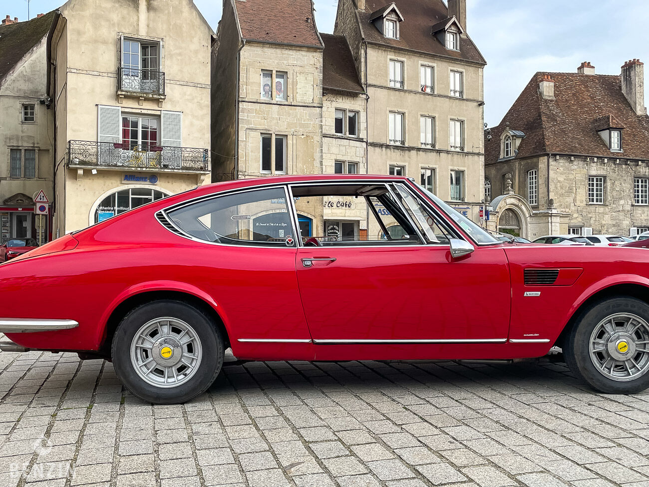 The interior is in good condition. The red velvet and black imitation upholstery has no tears or holes but shows slight wear. The steering wheel and the dashboard are in very good condition.