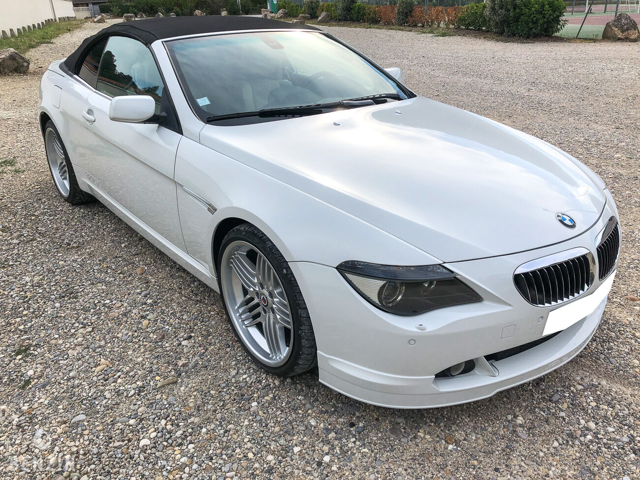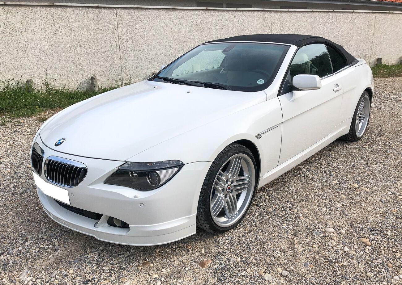 On the outside, the car is in good condition. The paint in its white color has only a few visible defects in the gallery. The exterior plastics and seals are in good condition, as well as the headlights. Pictures of the underbody are available in the gallery. The seller specifies that the car is equipped with an Alpina OEM front blade. The soft top has two slight tears visible in the picture. It remains functional and waterproof. The seller reports that the front turn signals are new.