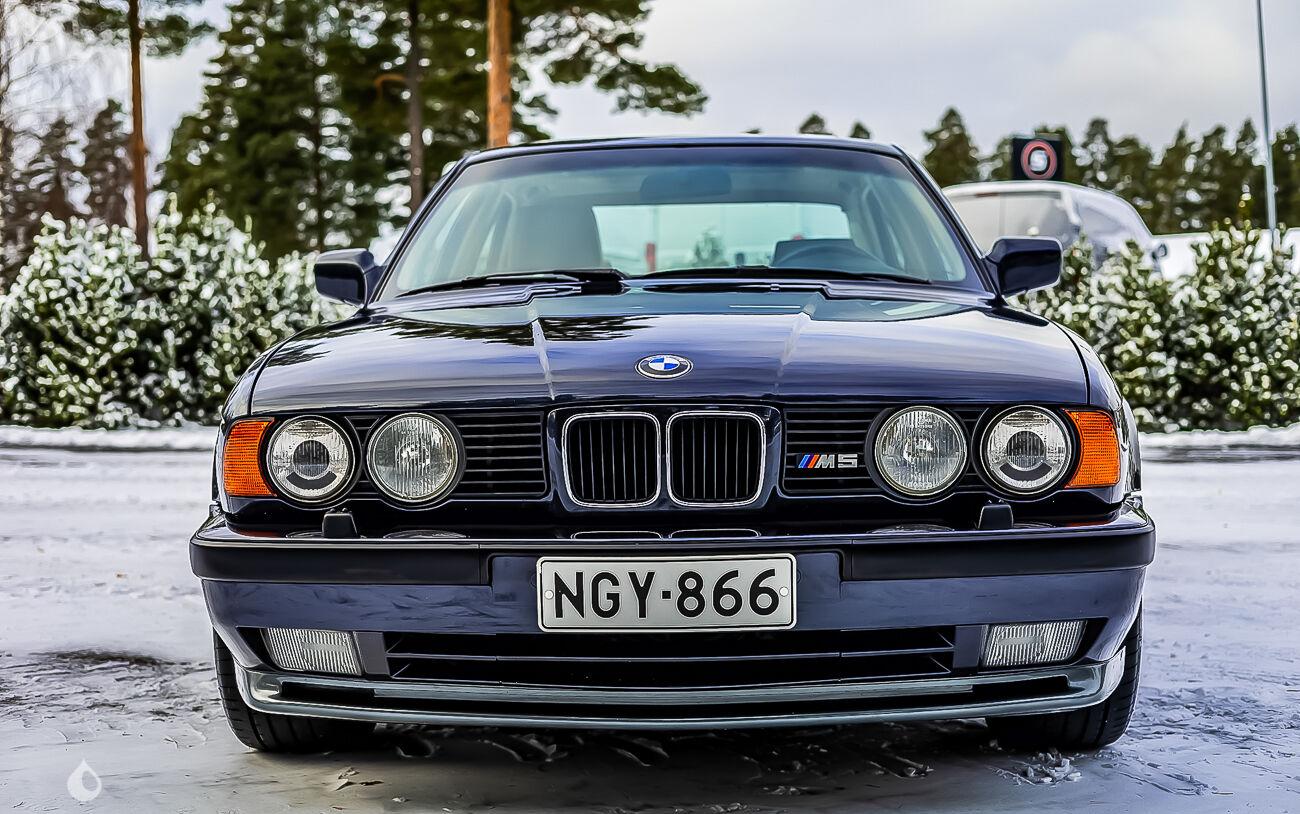 On the outside, the car is in very good condition. The paint in its "Macau Blau Metallic" blue color has only a few flaws visible in the gallery. The car has been repainted in its original color about ten years ago. The seller indicates that the body of this M5 shows no corrosion. The exterior plastics and seals are in good condition, as are the headlights. Pictures of the underbody are available in the gallery.