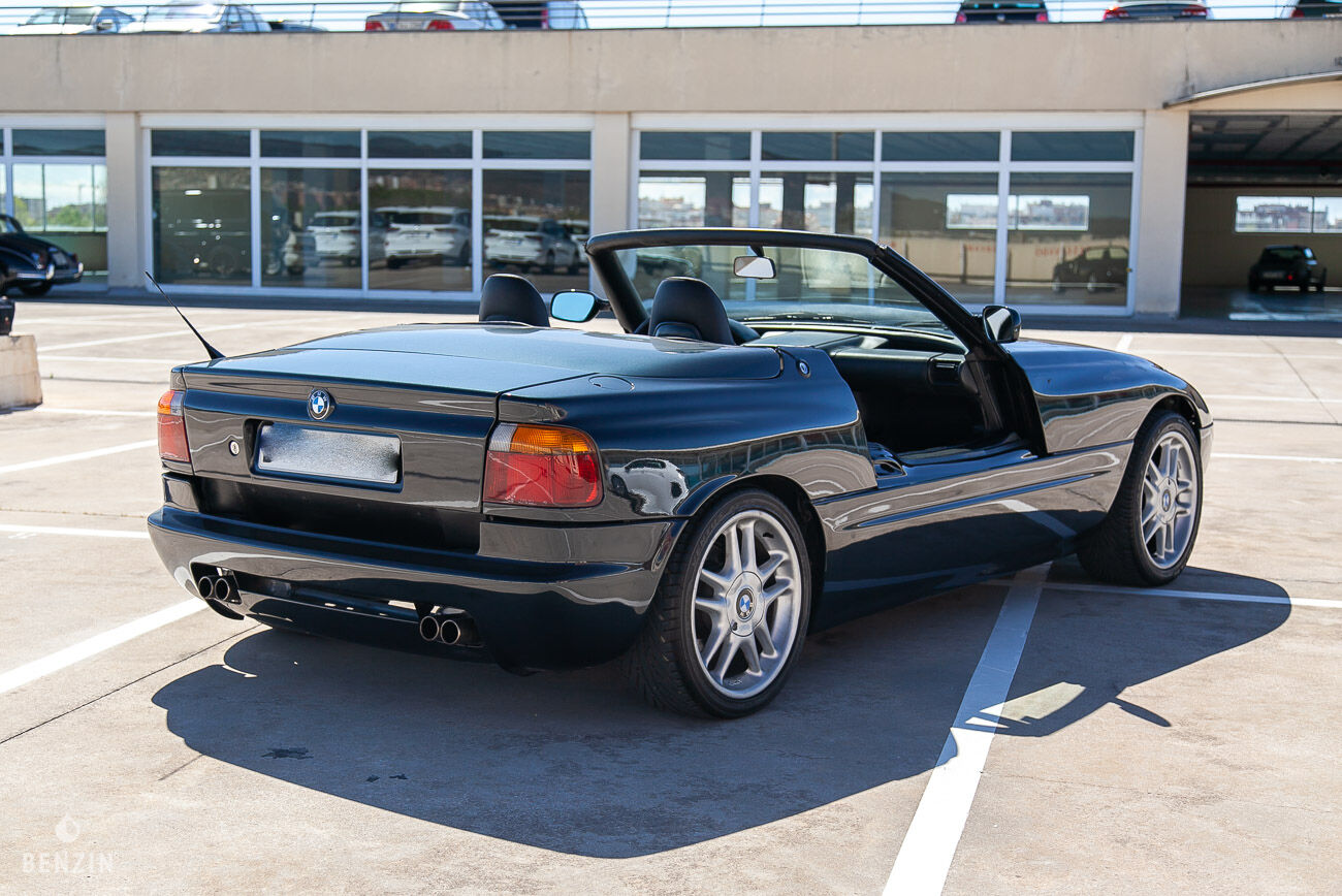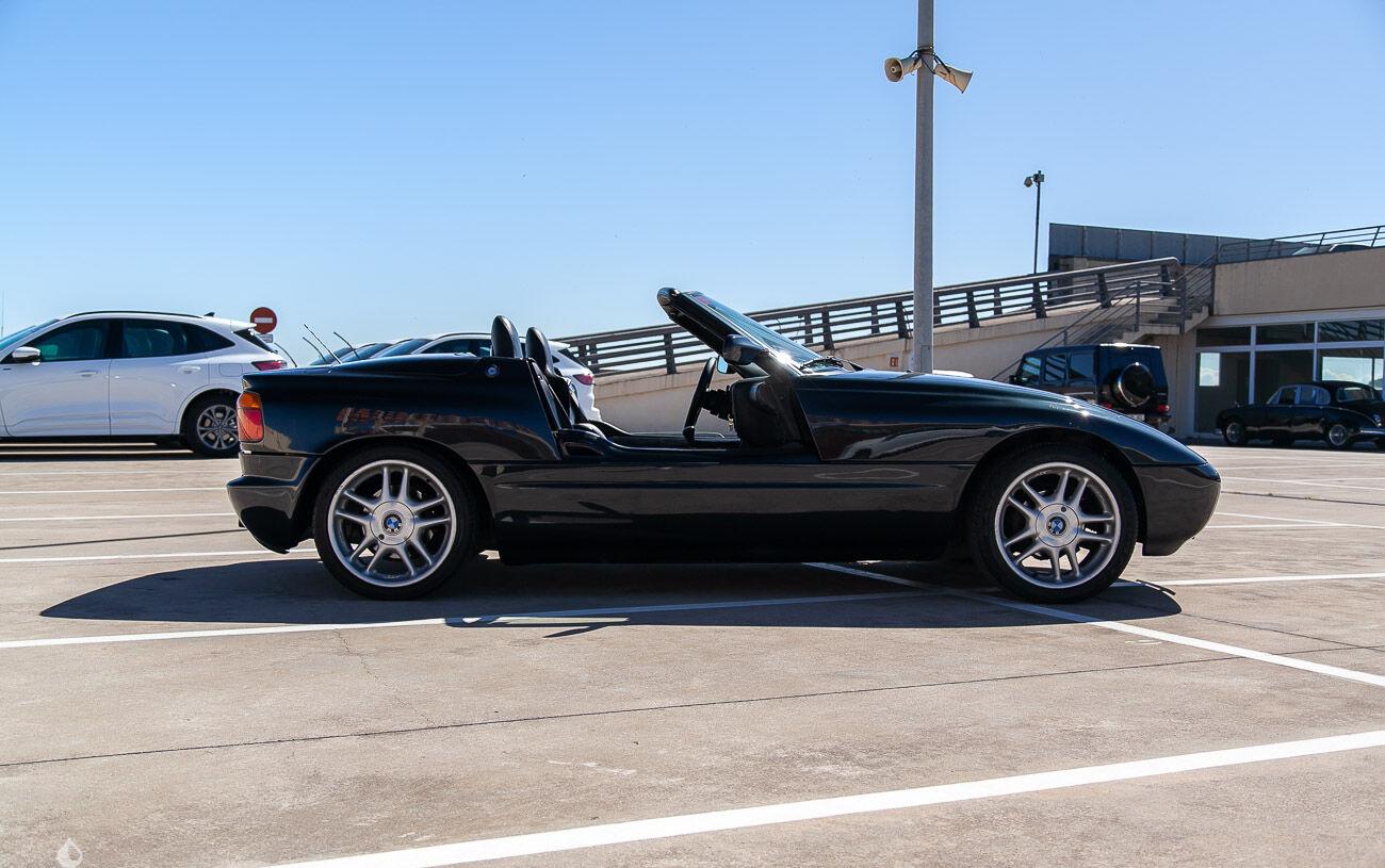 On the outside, the car is in good condition. The paint in its black color has some defects visible in the gallery. Pictures of the underbody are available in the gallery. The soft top has some defects visible in the gallery. The front fender on the driver side is missing.