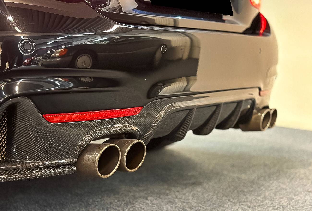 Externally, the car is in good condition. The black "black-sapphire metallic" paintwork shows only a few blemishes, visible in the gallery. The seller states that the body was given a full ceramic treatment in January 2023. Exterior plastics and seals are in good condition, as are the headlights. Photos of the underbody are available in the gallery. The seller states that the car features a spoiler, rocker panel, rear diffuser, spoiler and carbon appendages.